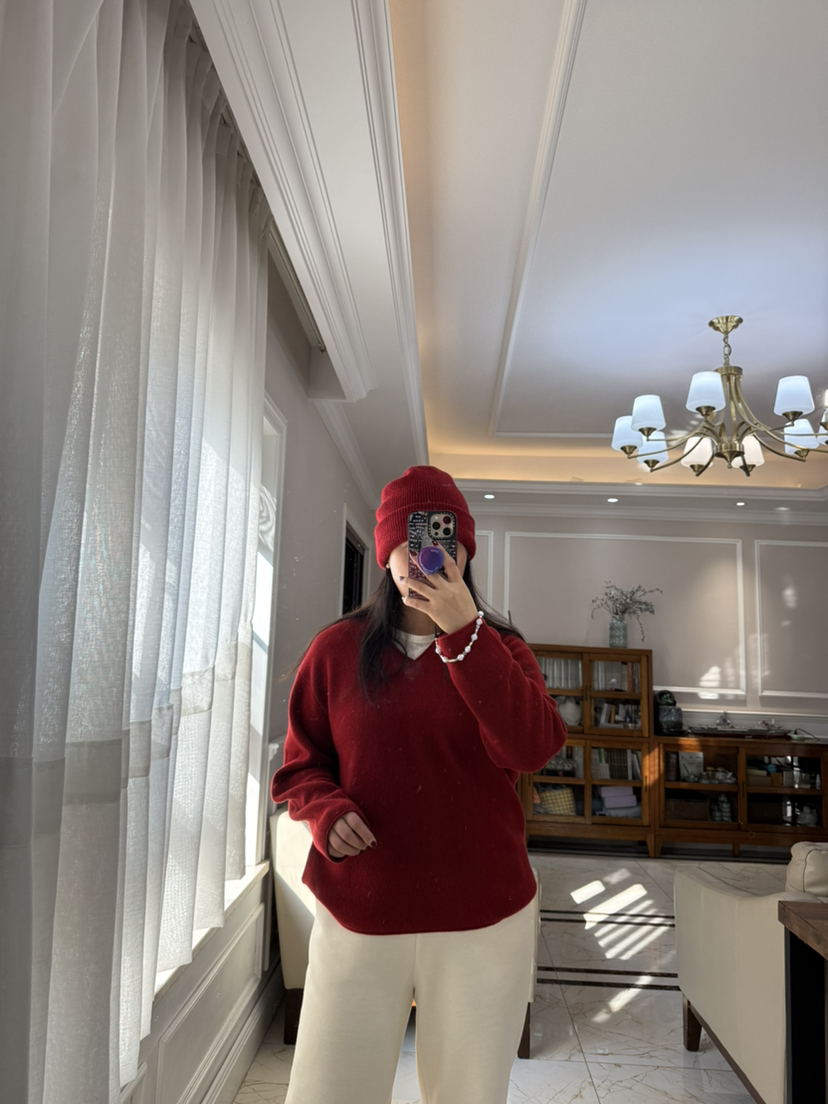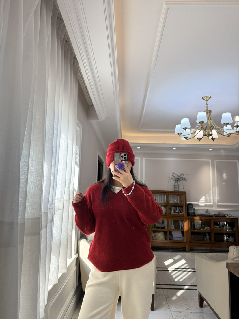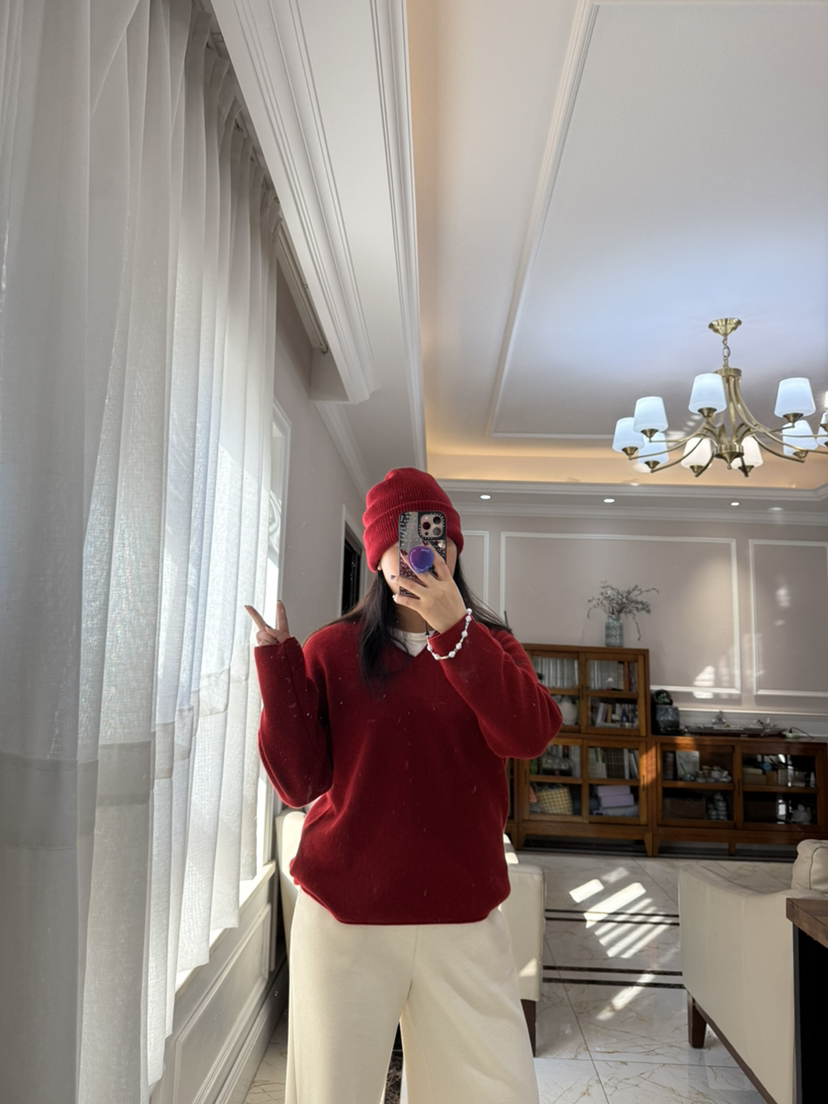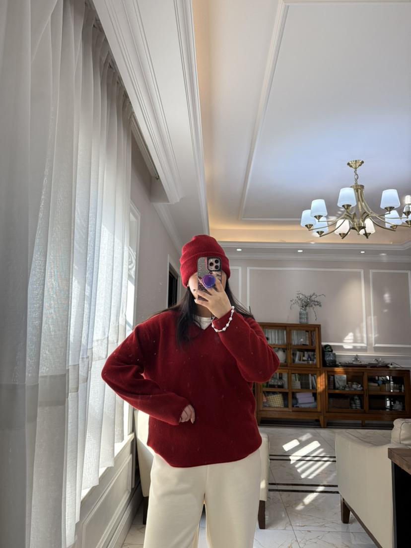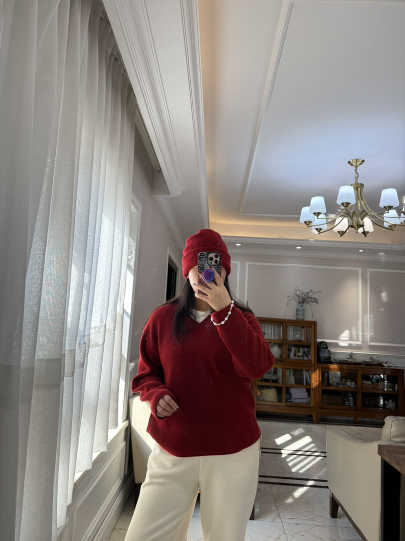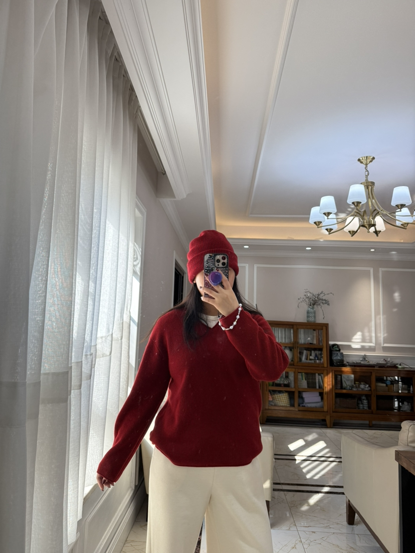 1227-5 渠道圆正 小禾 新年红 V领羊绒针织衫 我穿L