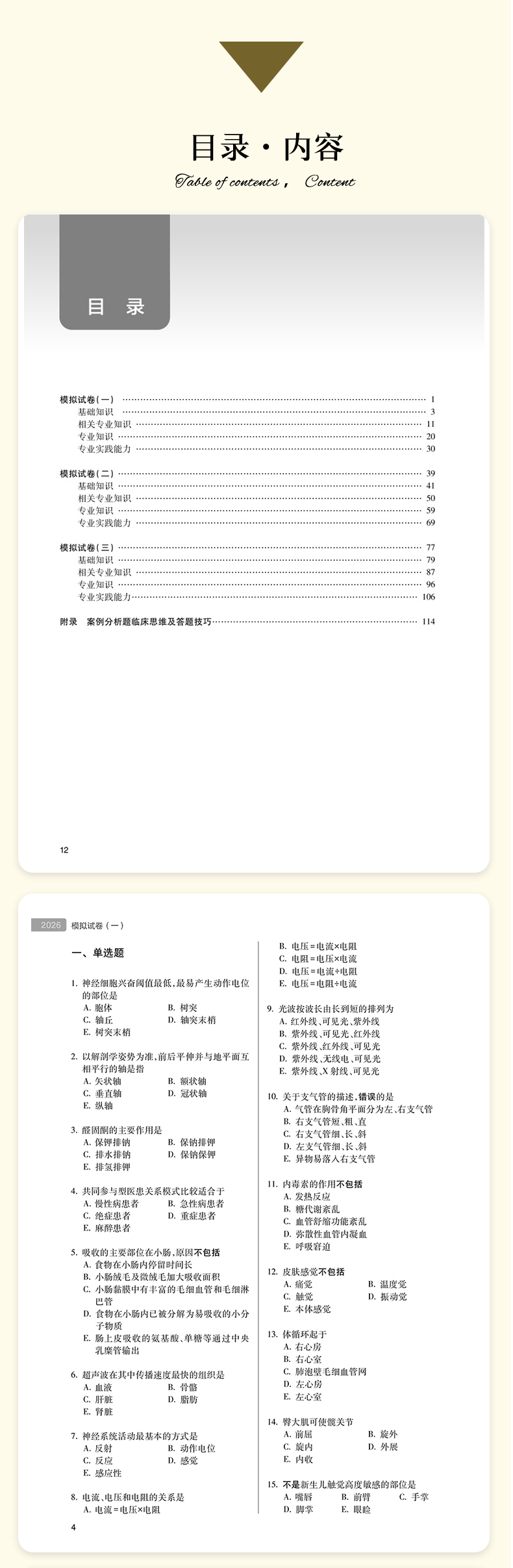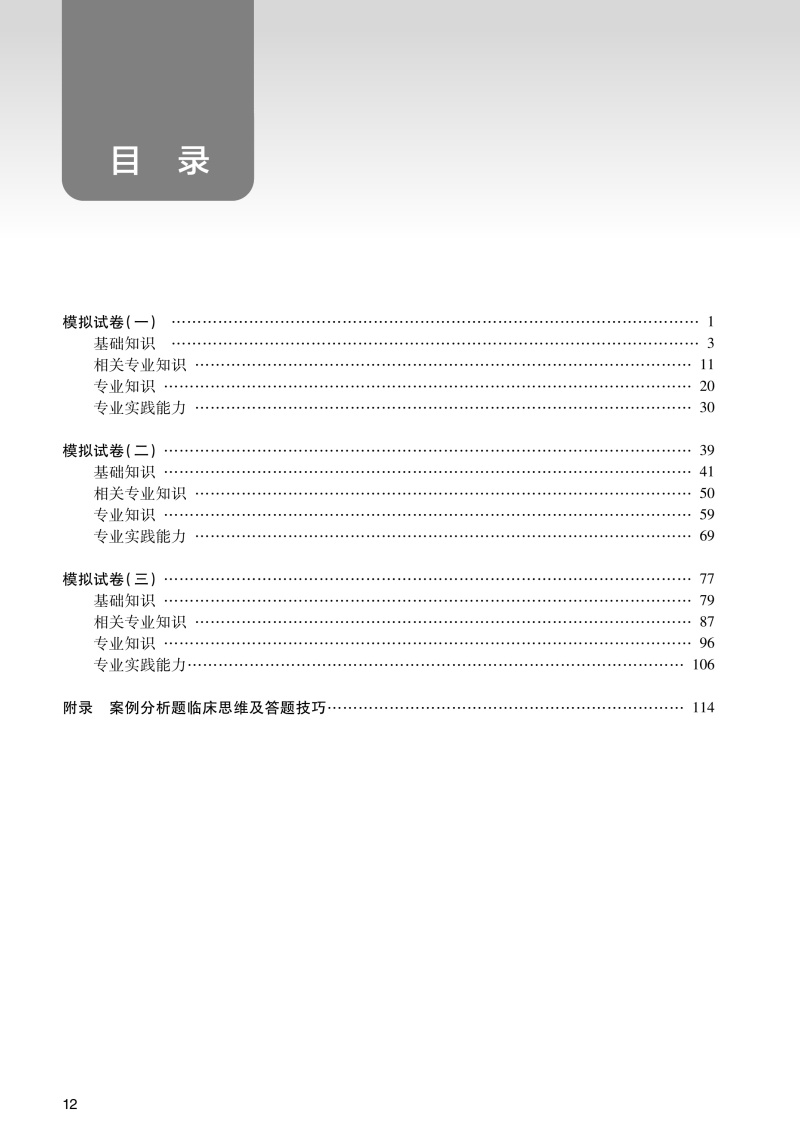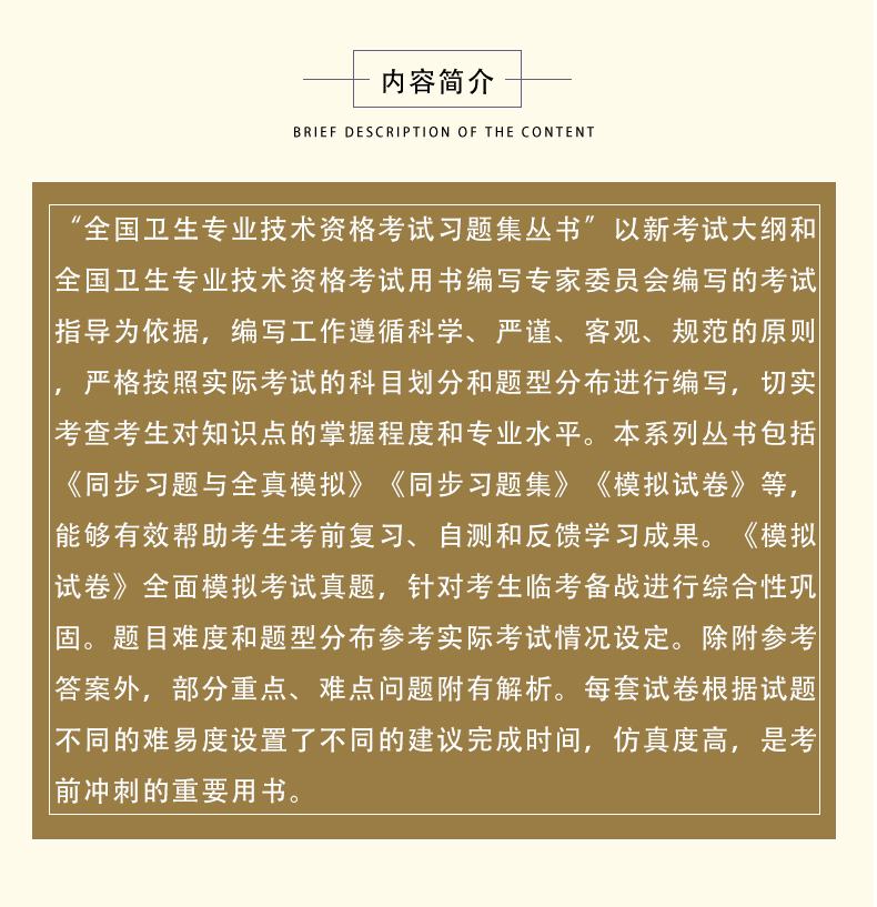 “全国卫生专业技术资格考试习题集丛书”以新考试大纲和全国卫生专业技术资格考试用书编写专家委员会编写的考试指导为依据,编写工作遵循科学、严谨、客观、规范的原则,严格按照实际考试的科目划分和题型分布进行编写,切实考查考生对知识点的掌握程度和专业水平。本系列丛书包括《同步习题与全真模拟》《同步习题集》《模拟试卷》等,能够有效帮助考生考前复习、自测和反馈学习成果。《模拟试卷》全面模拟考试真题,针对考生临考备战进行综合性巩固。题目难度和题型分布参考实际考试情况设定。除附参考答案外,部分重点、难点问题附有解析。每套试卷根据试题不同的难易度设置了不同的建议完成时间,仿真度高,是考前冲刺的重要用书。