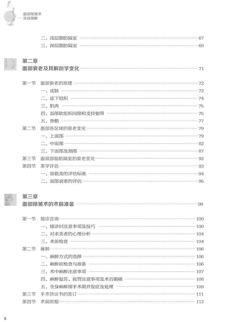 本书内容以面部除皱术手术为核心,紧密围绕面部除皱术手术阐述相关知识。全面讲解面部除皱术,从解剖、衰老理论知识,到术前咨询沟通、术前检查、手术方案设计、手术操作每个步骤要点、术后处理等,全面覆盖。本书主要读者对象是拟开展和正在开展面部除皱术的医师。编写采取图文并茂的形式,用400余幅精美、科学的原创手术和解剖示意图图解不同术式的面部除皱术解剖层次和手术技巧,100余幅手术照片和术前术后外观对比图,帮助读者直观感受手术。本书旨在帮助读者一站式掌握面部除皱术的手术技巧和操作细节。 另附样稿电子文档。