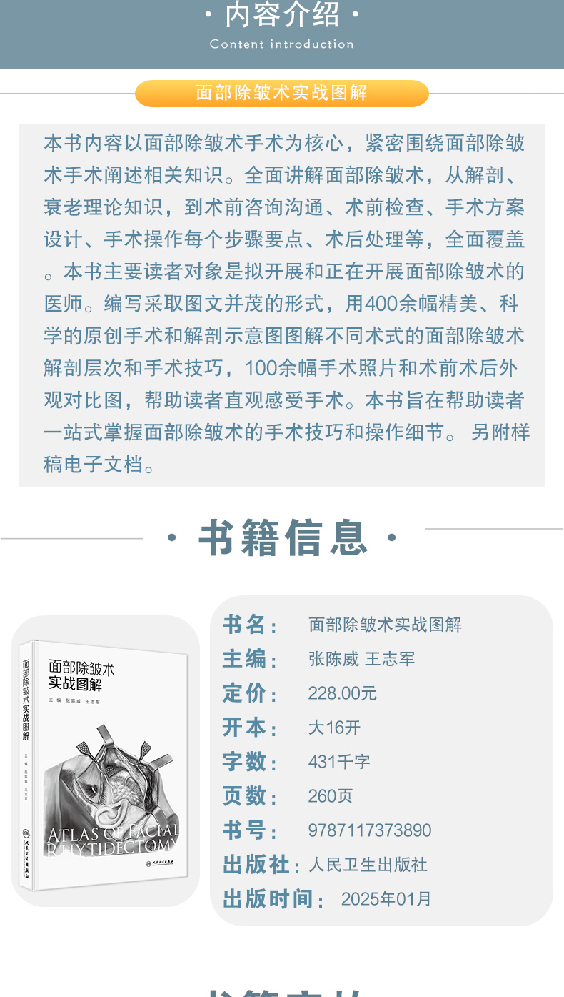 面部除皱术实战图解 张陈威 王志军主编 内容以面部除皱术手术为核心 紧密围绕面部除皱术手术阐述相关知识 另附样稿电子文档