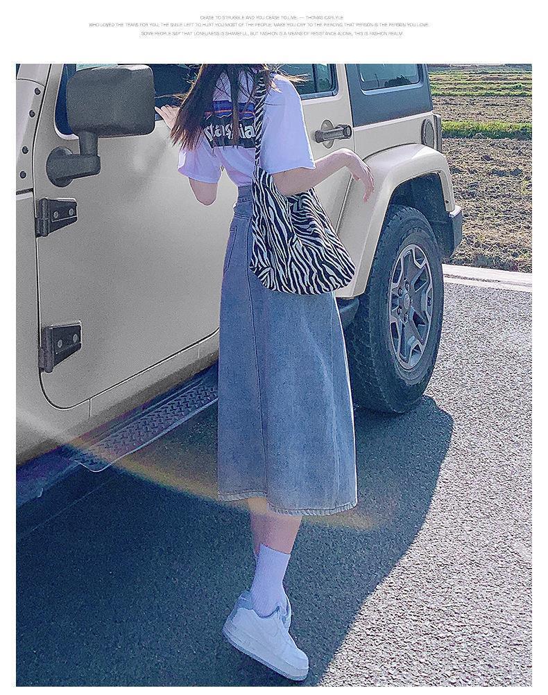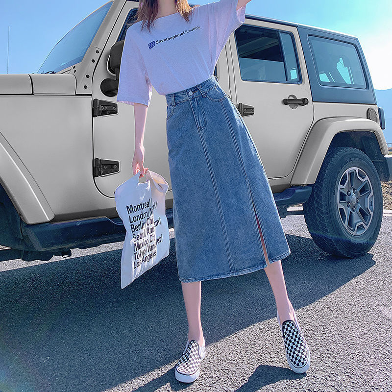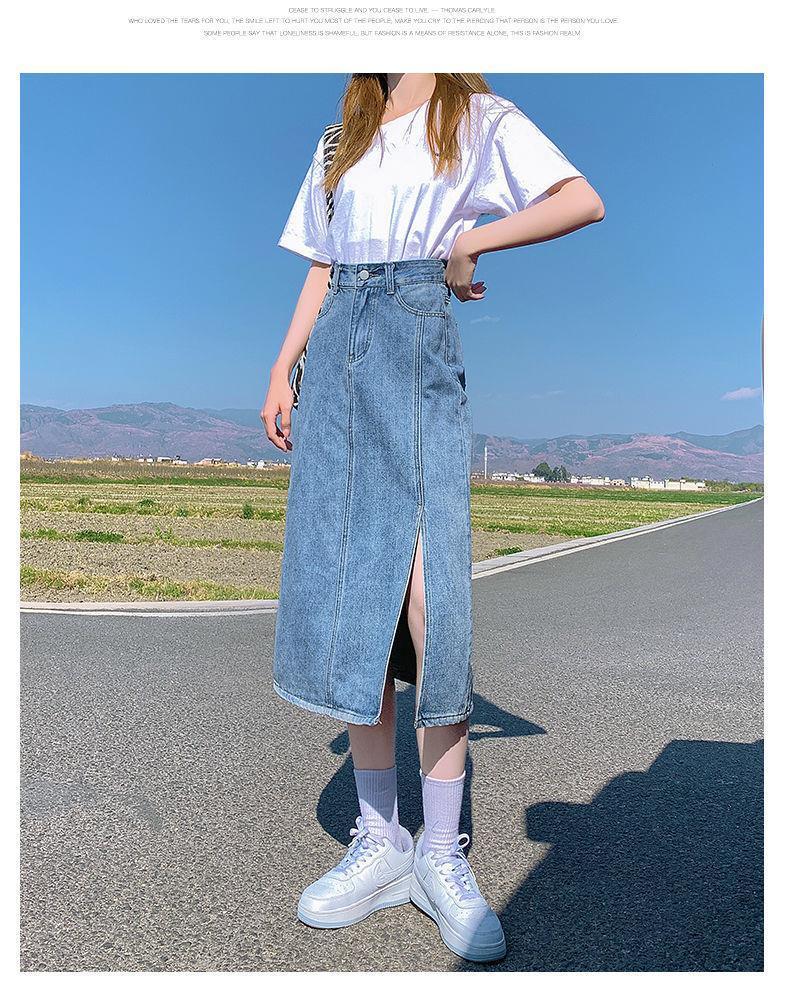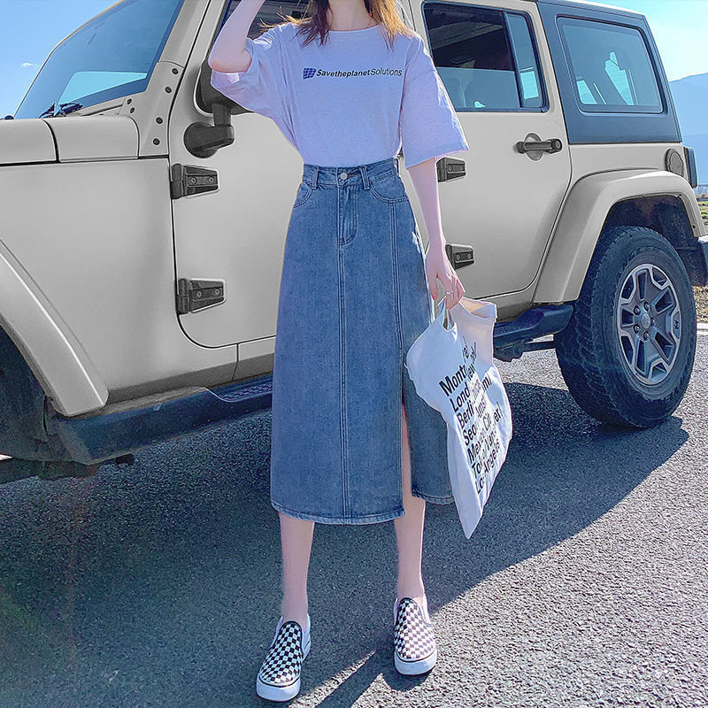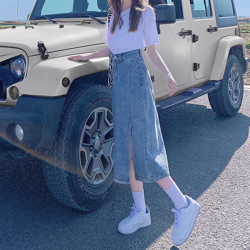 开叉半身裙女夏季薄款高腰春秋新款小个子a字中长牛仔裙长裙七夕情人节