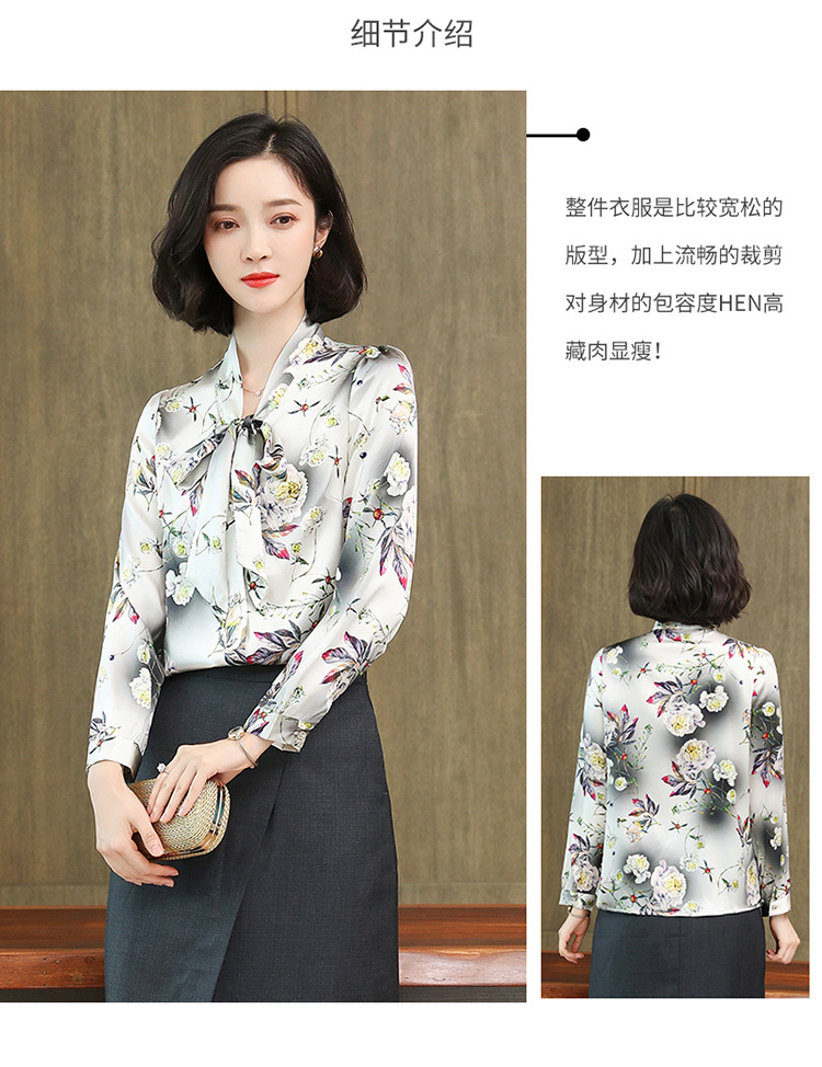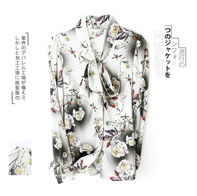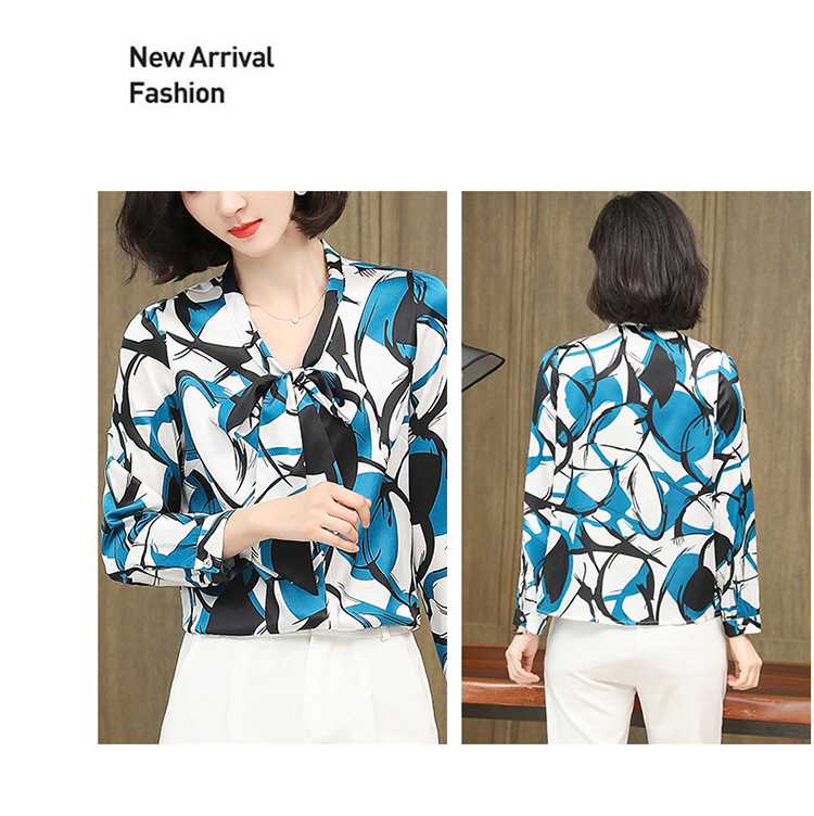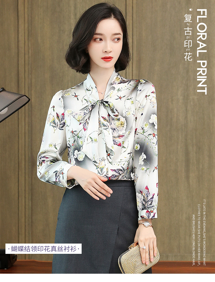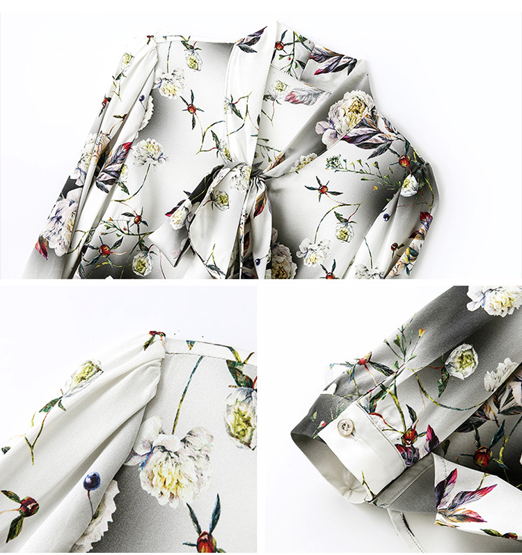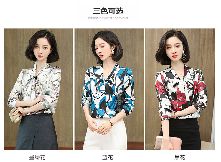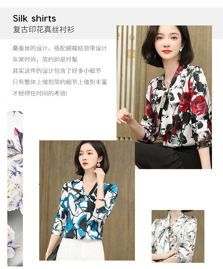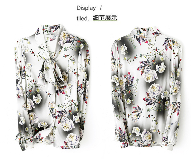 真丝衬衫女长袖飘带蝴蝶结水墨印花秋新款时尚百搭桑蚕丝上衣