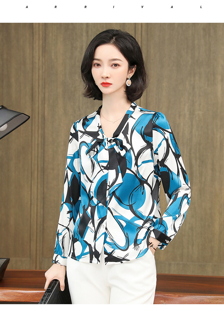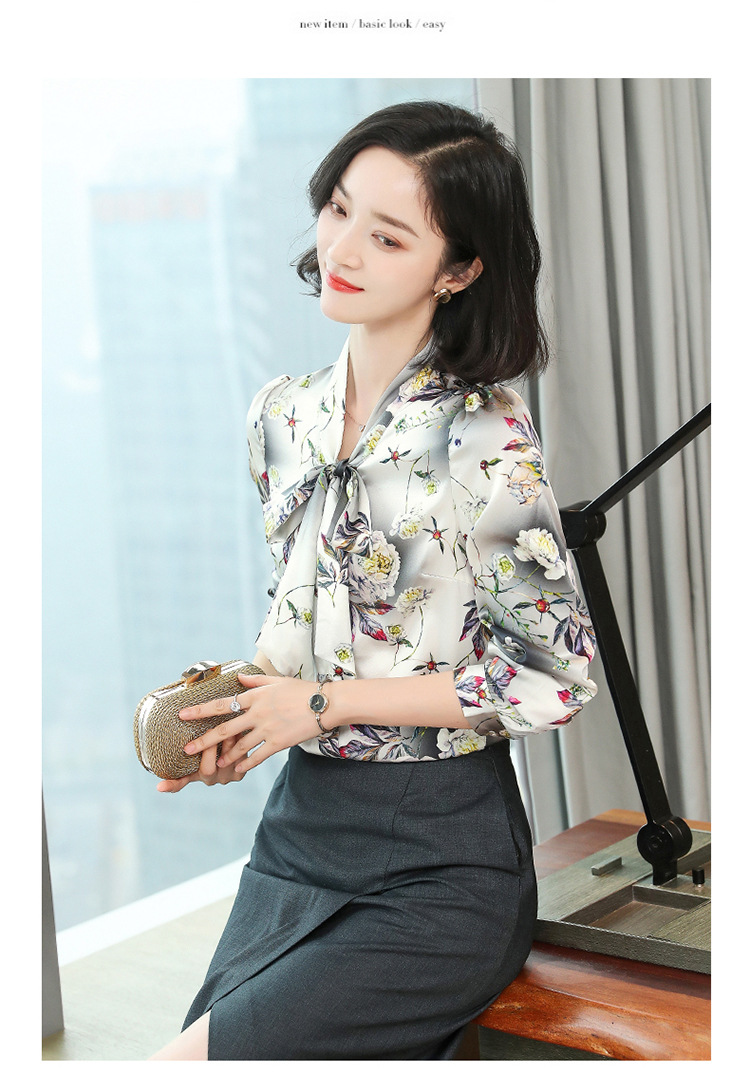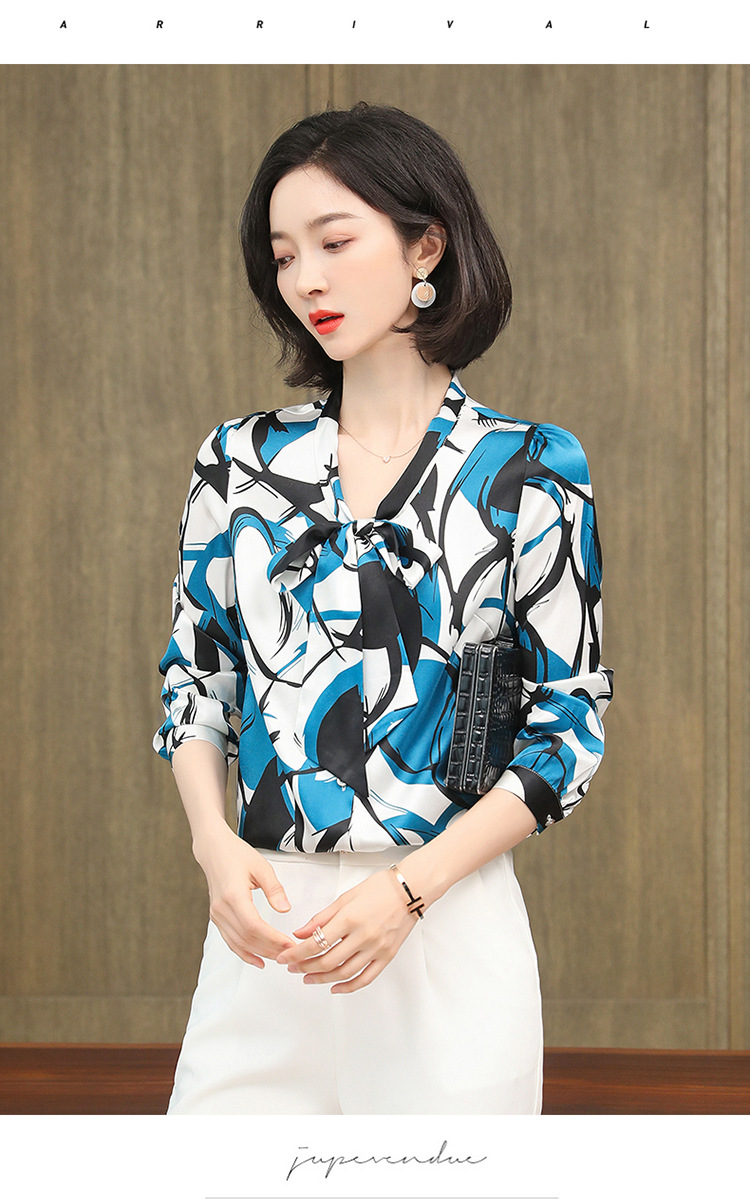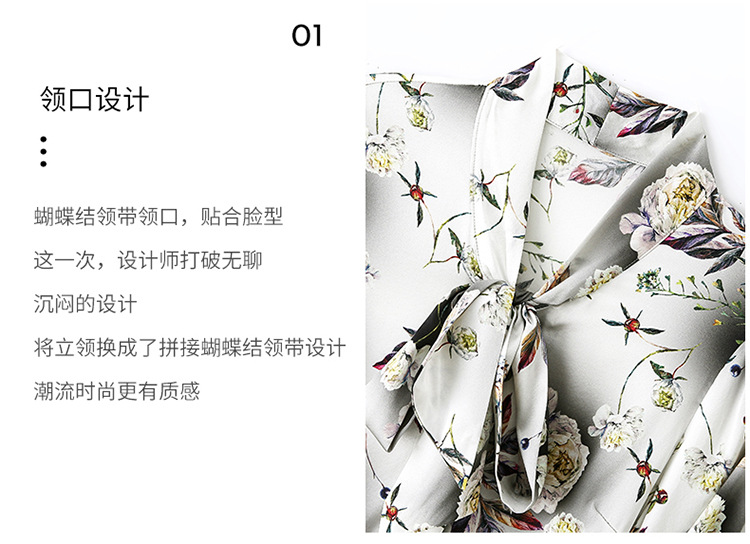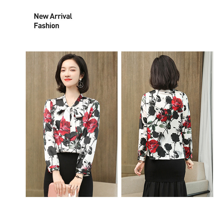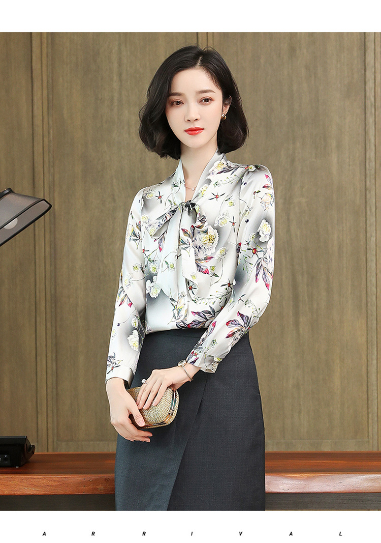 真丝衬衫女长袖飘带蝴蝶结水墨印花秋新款时尚百搭桑蚕丝上衣