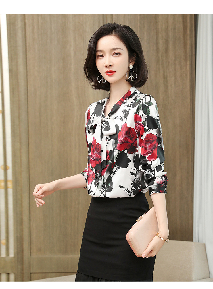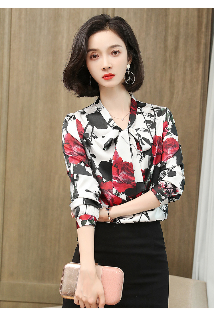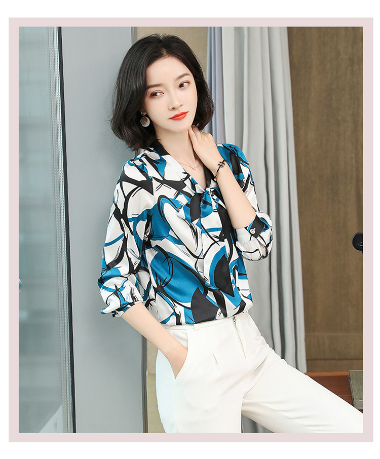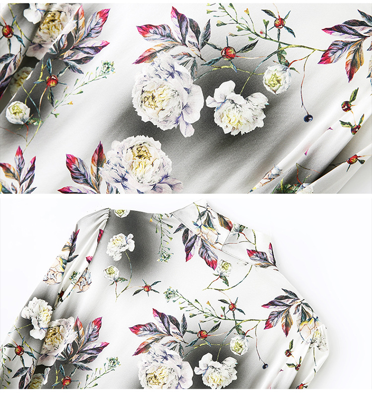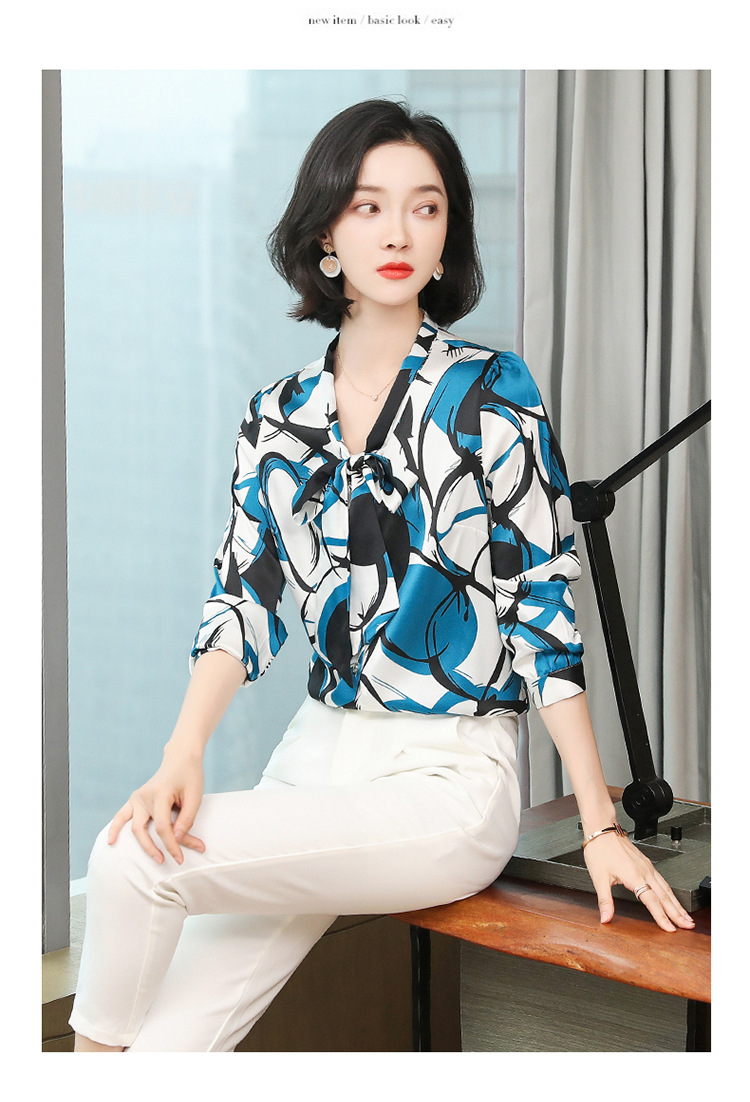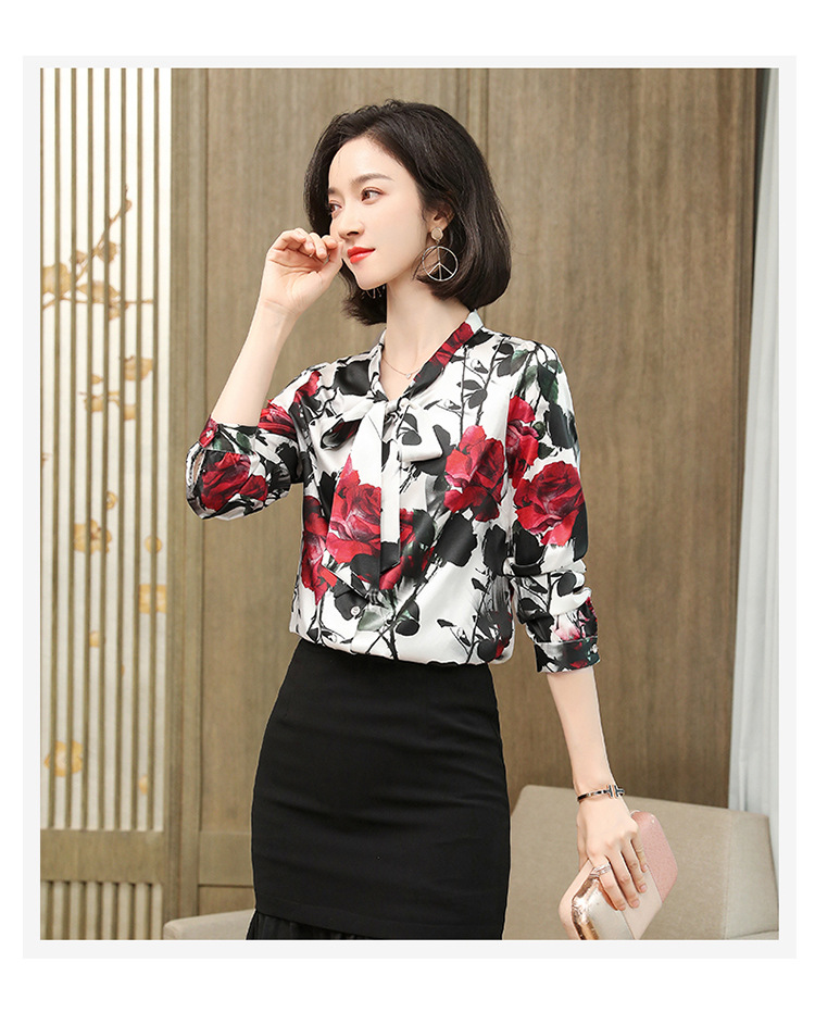 真丝衬衫女长袖飘带蝴蝶结水墨印花秋新款时尚百搭桑蚕丝上衣