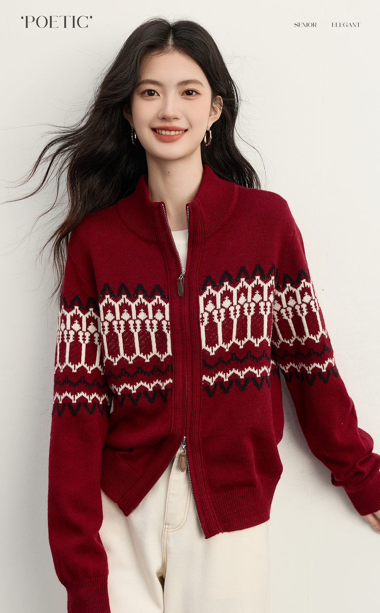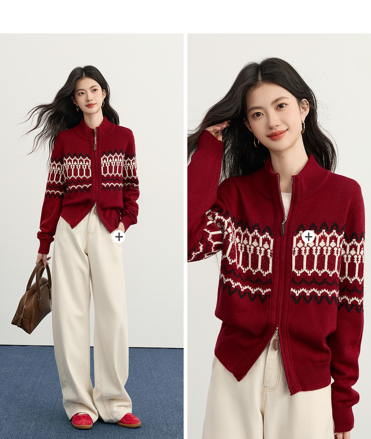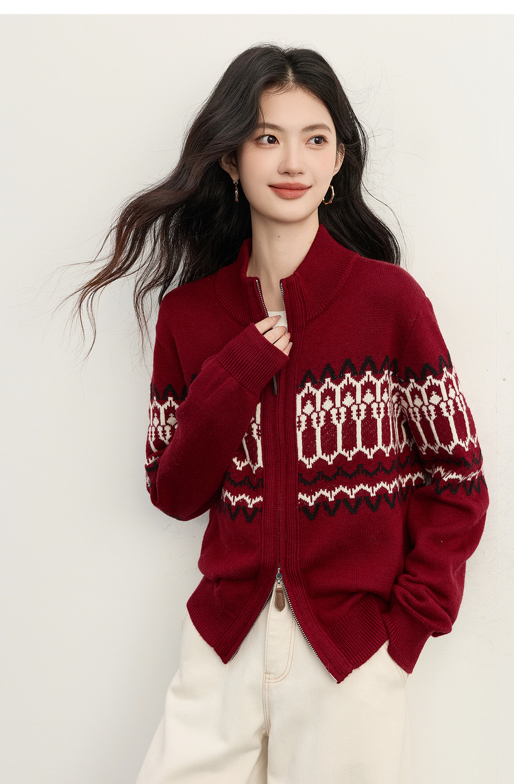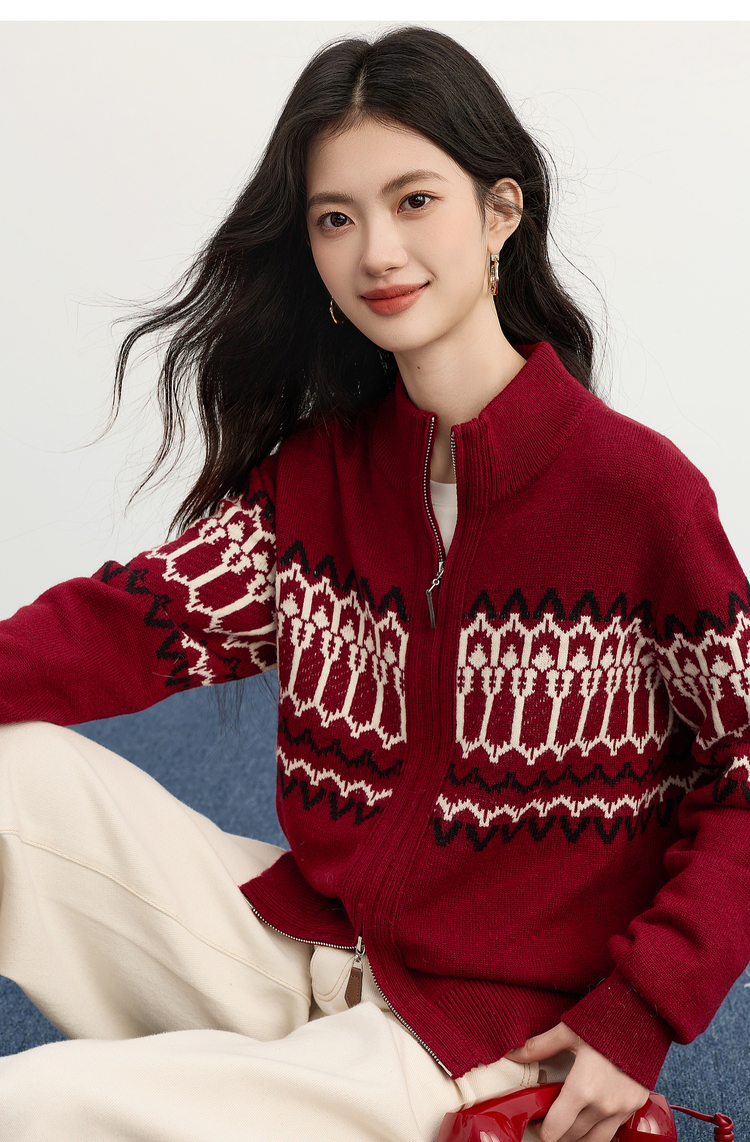 【11/19新品】熙世界红色费尔岛毛衫上衣女2025秋冬新款拉链立领针织毛衣短外套
