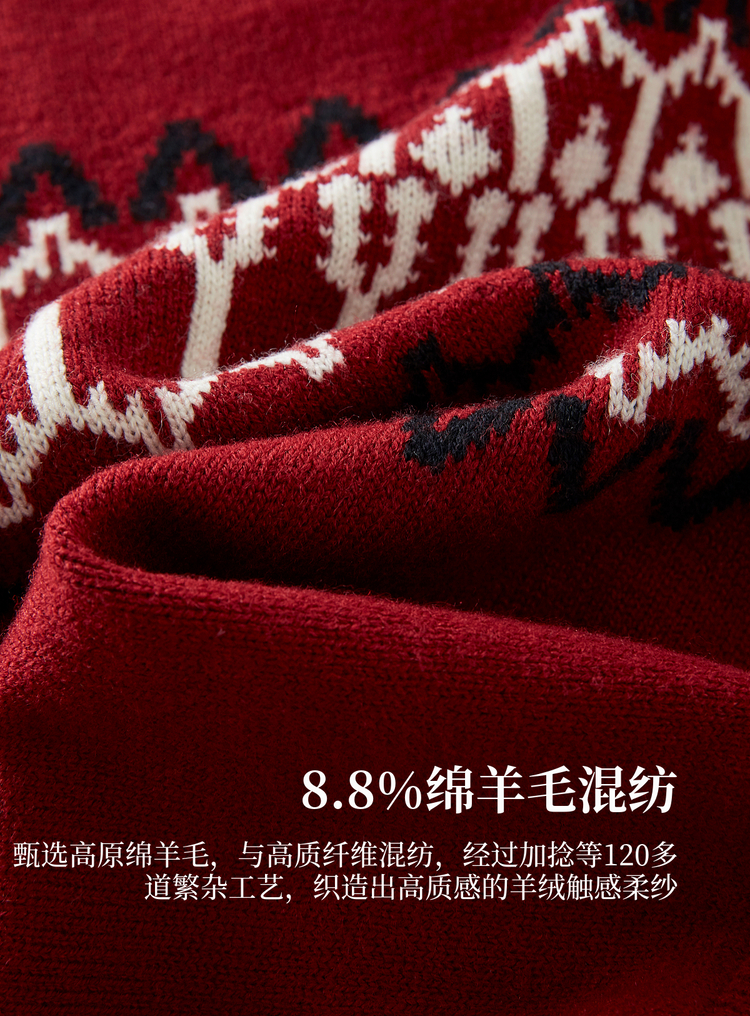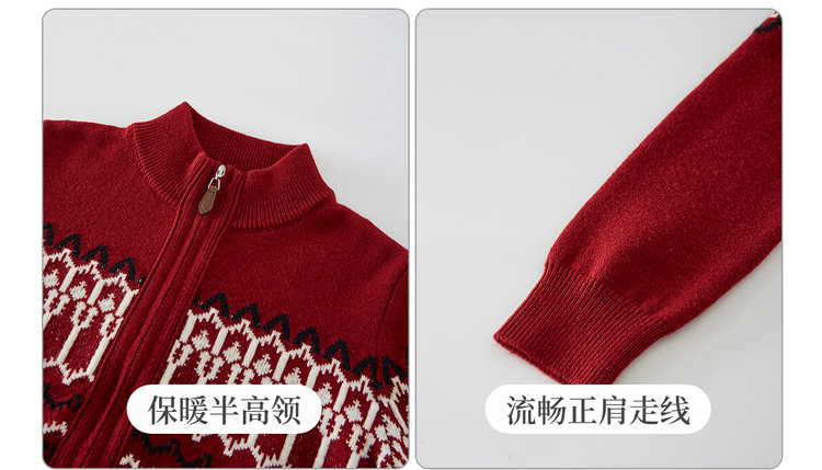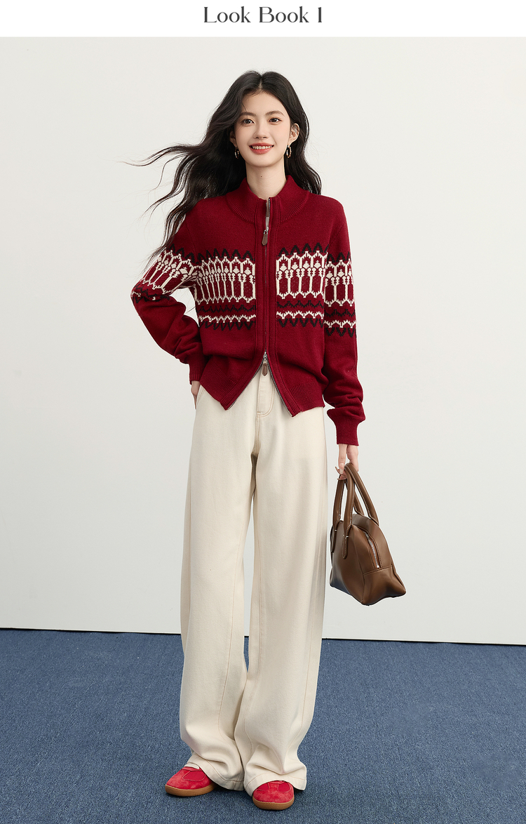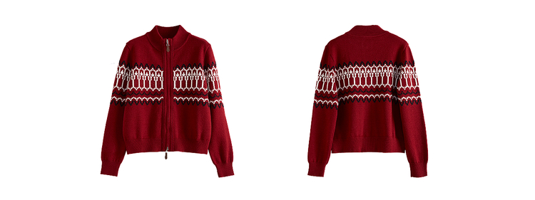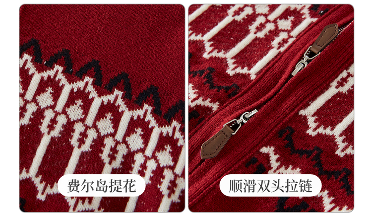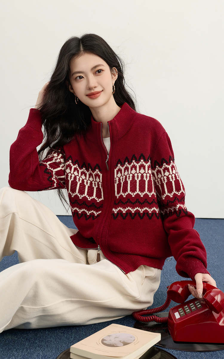 【11/19新品】熙世界红色费尔岛毛衫上衣女2025秋冬新款拉链立领针织毛衣短外套
