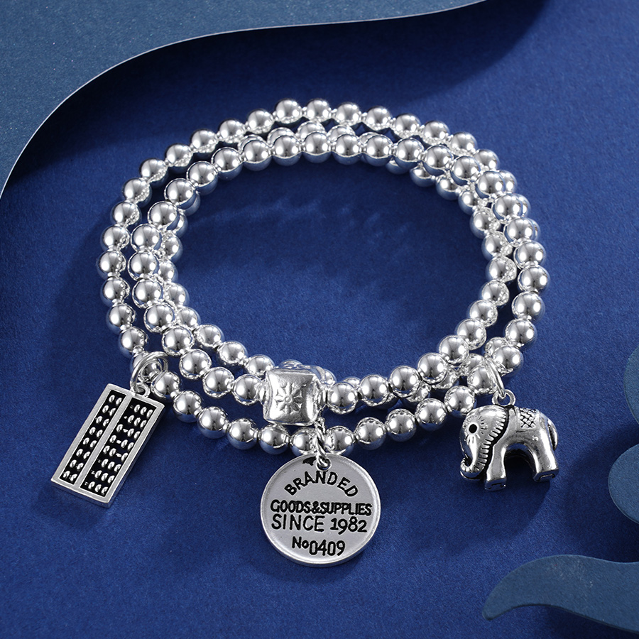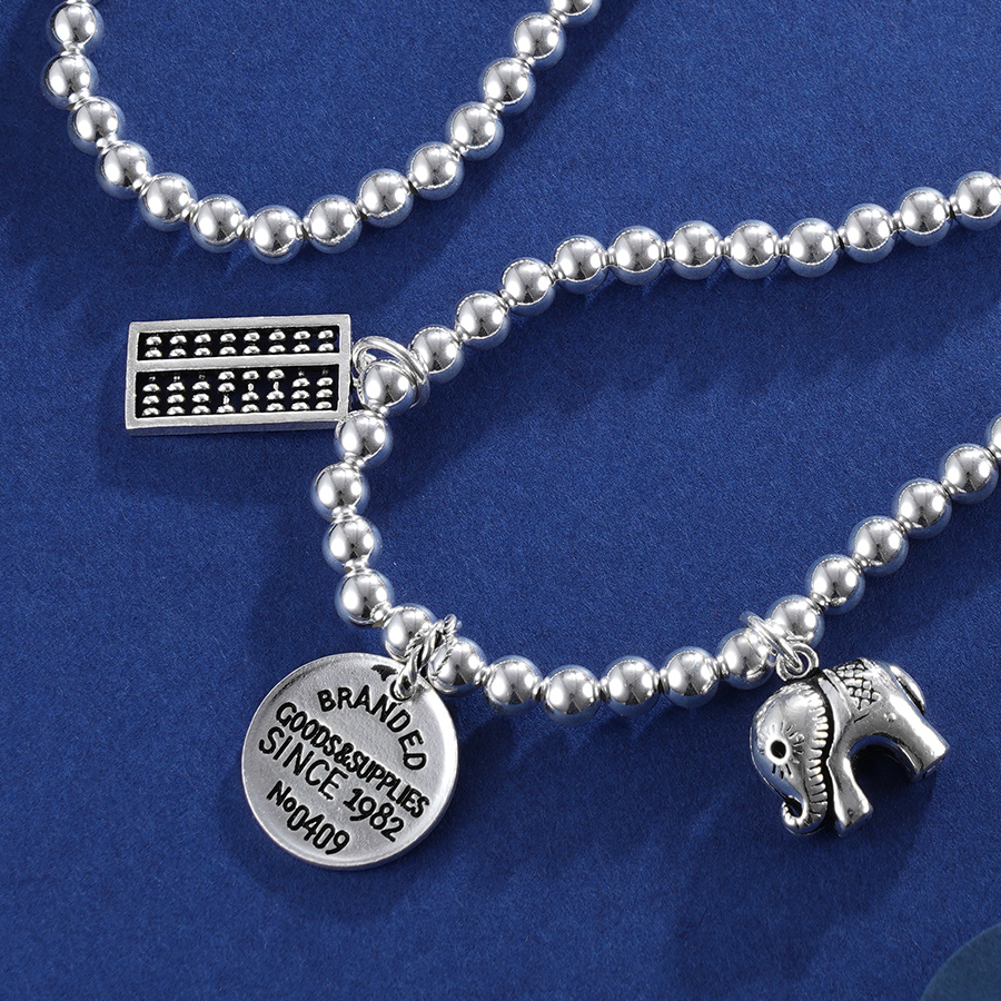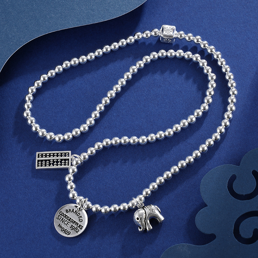 【寓意】:算盘象征财源广进,大象象征太平有象。纯银手串融合两种元素,表招财纳福之路,顺遂无虞,尽是吉兆。