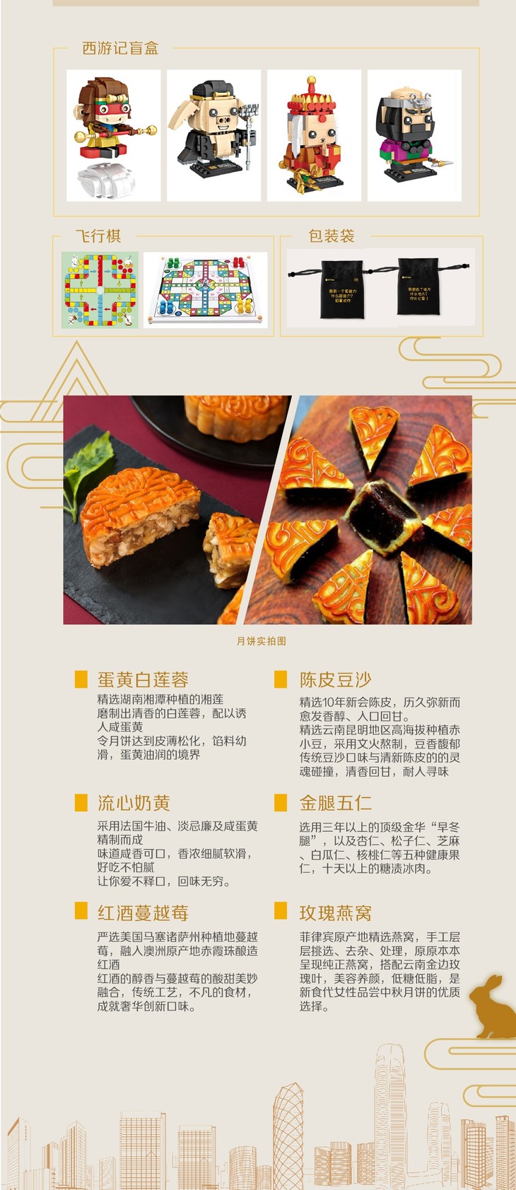追星逐月 蛋黄白莲蓉 金腿五仁 陈皮豆沙 流星奶黄 红酒蔓越莓 玫瑰燕窝 大话西游乐高 酷趣飞行棋