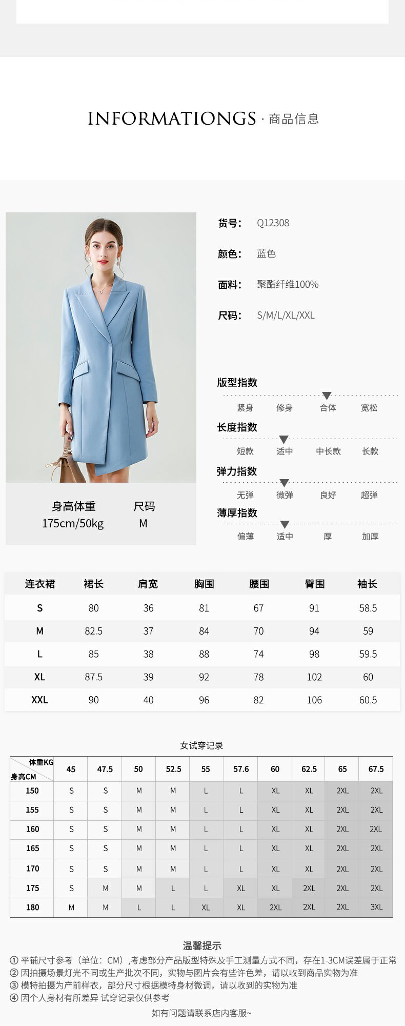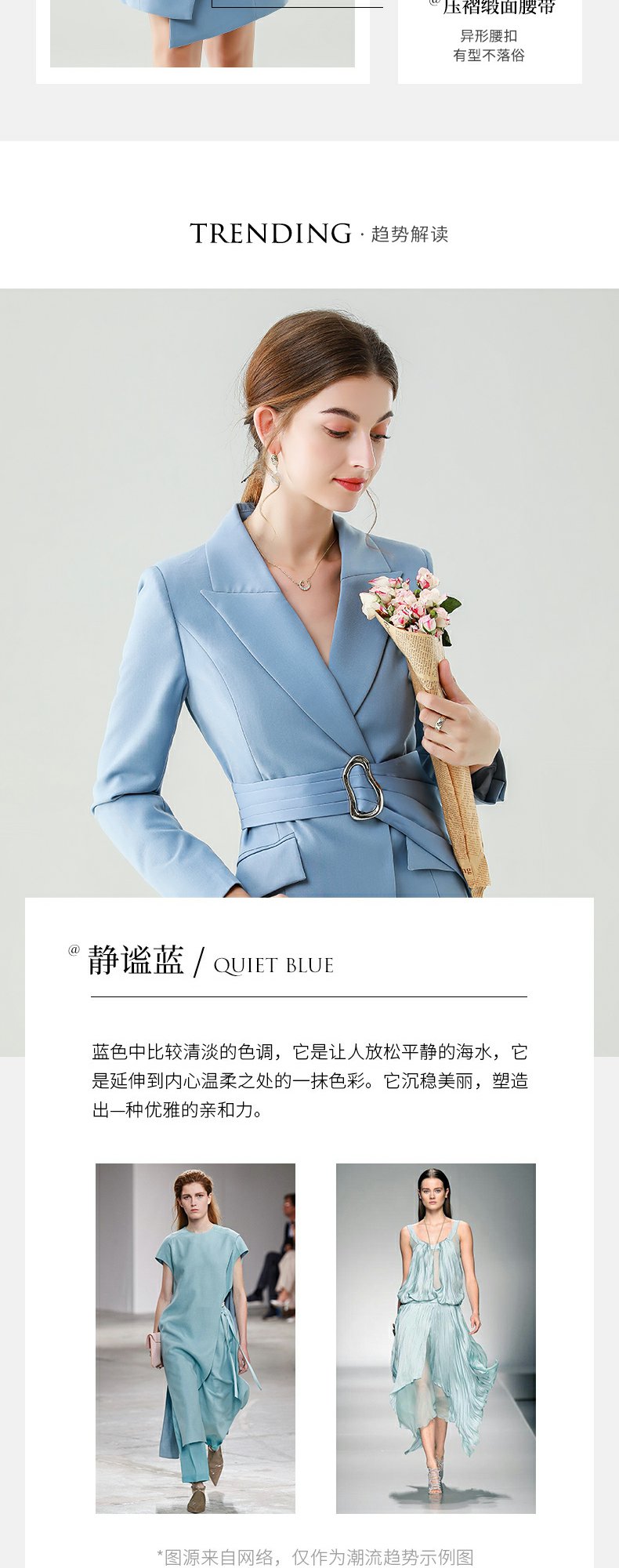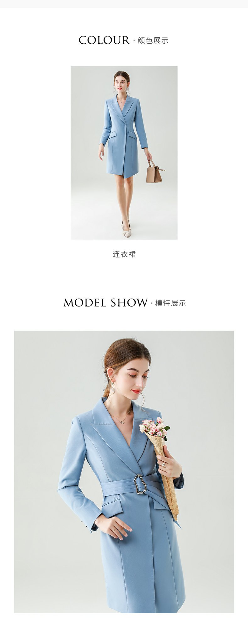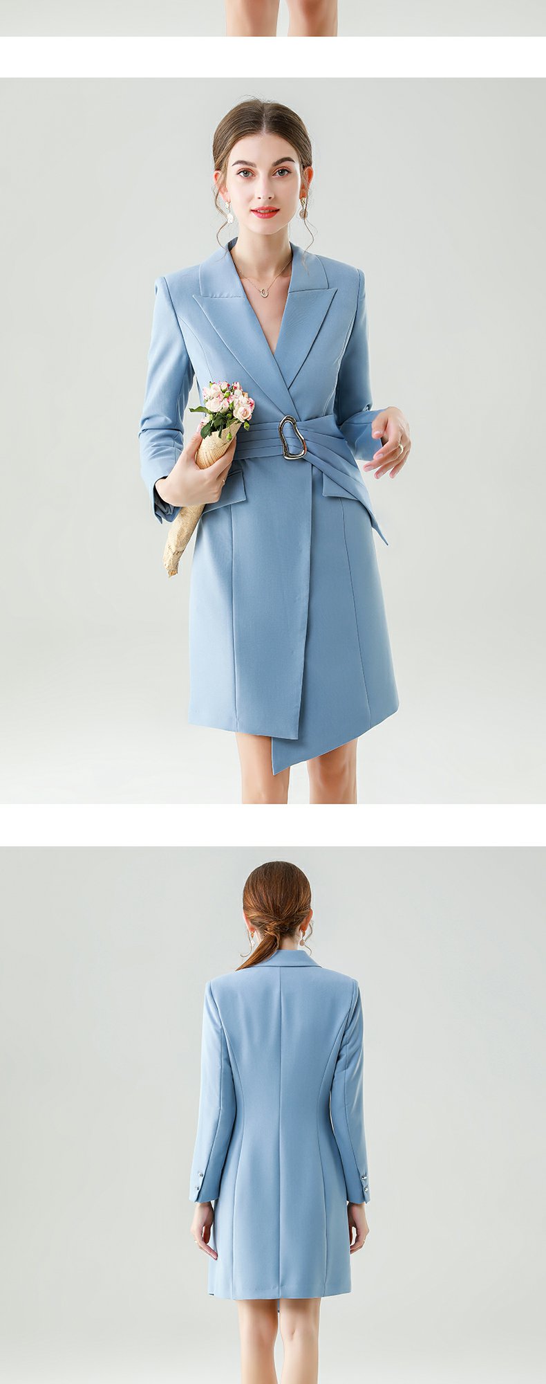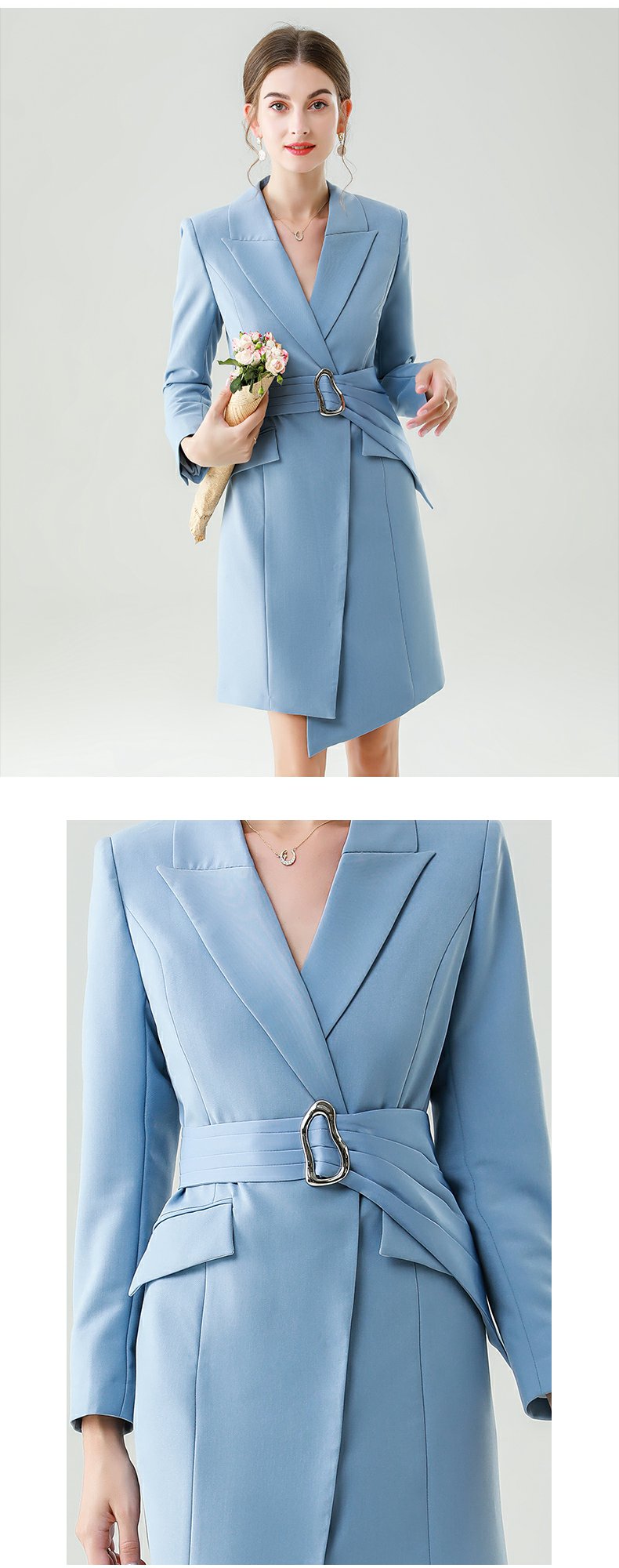 IWY/秋季OL通勤女装长袖连衣裙时尚气质湖蓝色职业风西装裙中长款工装Q12308+腰带YD-308