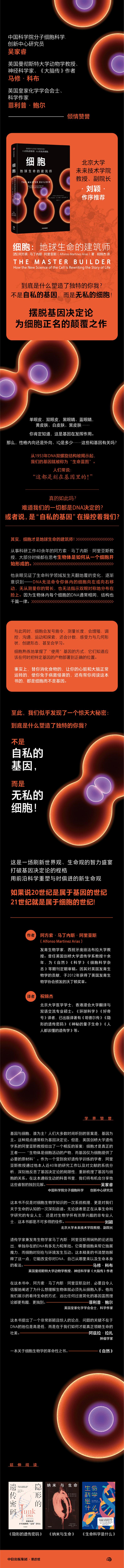 细胞,而不是DNA,掌握着理解生命的过去和现在的关键。是什么定义了我们?几十年来,答案似乎显而易见:我们的基因,它们被称为“生命蓝图”。从詹姆斯·沃森和弗朗西斯·克里克于1953年揭示DNA双螺旋结构起,我们就开始对基因顶礼膜拜。从眼睛的颜色到某种疾病的易感性,甚至是一个人的智力水平和性格,很多人认为自身的一切都是由DNA决定的。在这本书中,细胞生物学家阿方索·马丁内斯·阿里亚斯指出,我们一直看得不够远,没有注意到更大的场景。决定我们是谁的,不是我们的基因,而是我们的细胞。让我们来类比一下:有一栋房子,如果我们移走承重墙上的几块砖头,随后房子轰然倒塌,想必谁都不会认为砖头是这栋房子的建筑师。那么,如果从基因组里移除一个基因,然后看到生物体停止发育或出现功能障碍,我们就能认为基因就是生命的建筑师吗?当然不能,但这就是近些年来我们一直在做的事情!法国数学家亨利·庞加莱曾说,科学是由事实筑成的,......