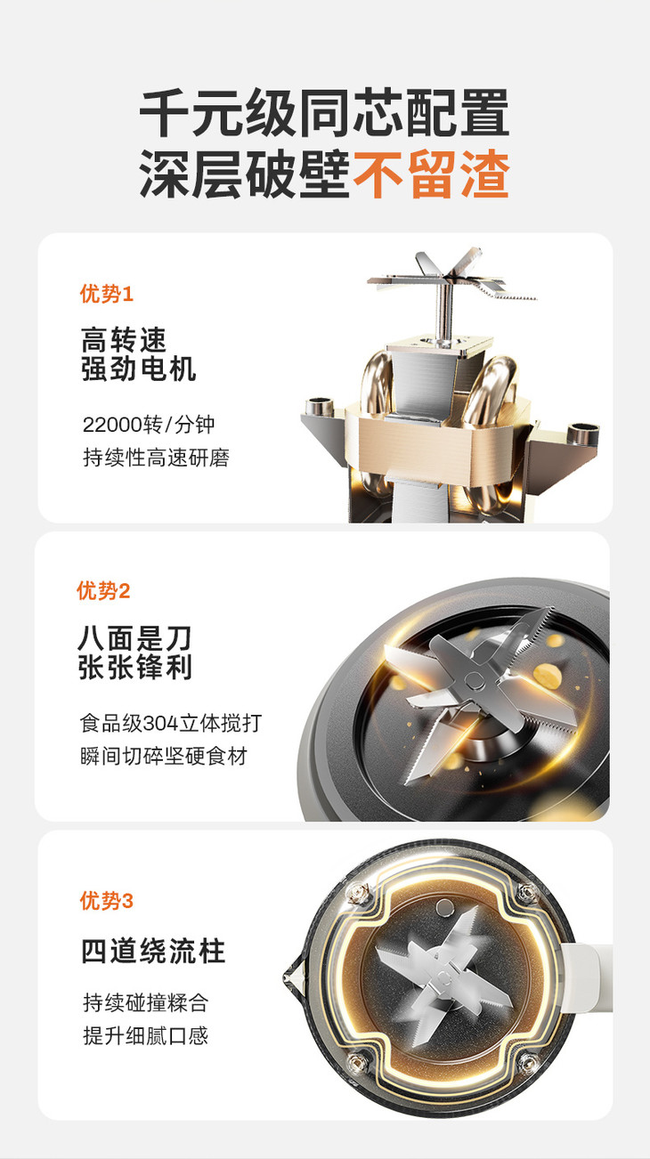 千元级同芯配置,深层破壁不留渣 机身自带高转速强劲电机,每分钟高达22000/转,持续高速研磨 食品级304不锈钢八面刀头,立体搅打,瞬间切碎坚硬食材~ 四道绕流柱,持续碰撞糅合,提升细腻口感
