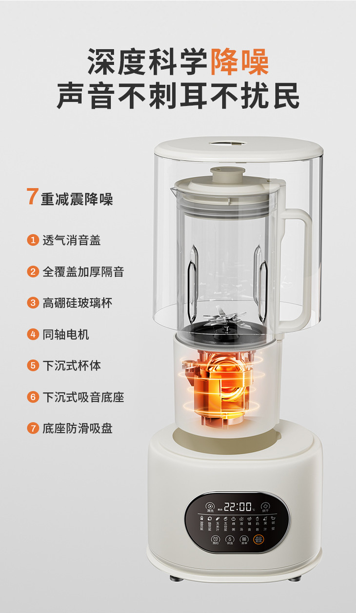 设计7重减震降噪处理 1、透气消音盖 2、全覆盖加厚隔音 3、高硼硅玻璃杯 4、同轴电机 5、下沉式杯体 6、下沉式吸音底座 7、底座防滑吸盘