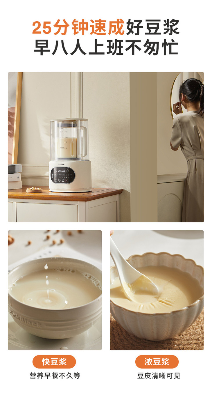 这个破壁机,简直就是唤醒全家营养,早晨的必备神器!! 每天早上煮好一壶豆浆,大人小孩都能喝, 轻松满足全家人的早餐需求!! 无论是五口之家的温馨时光,还是朋友小聚的欢乐早晨,都可一机搞定, 无需分批制作,省时更省心,最快25分钟即可喝上速成好豆浆~
