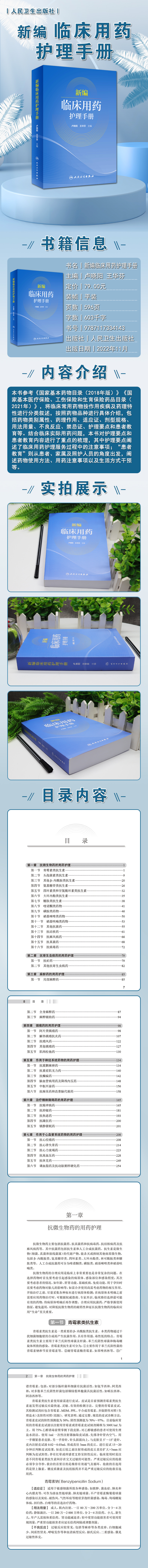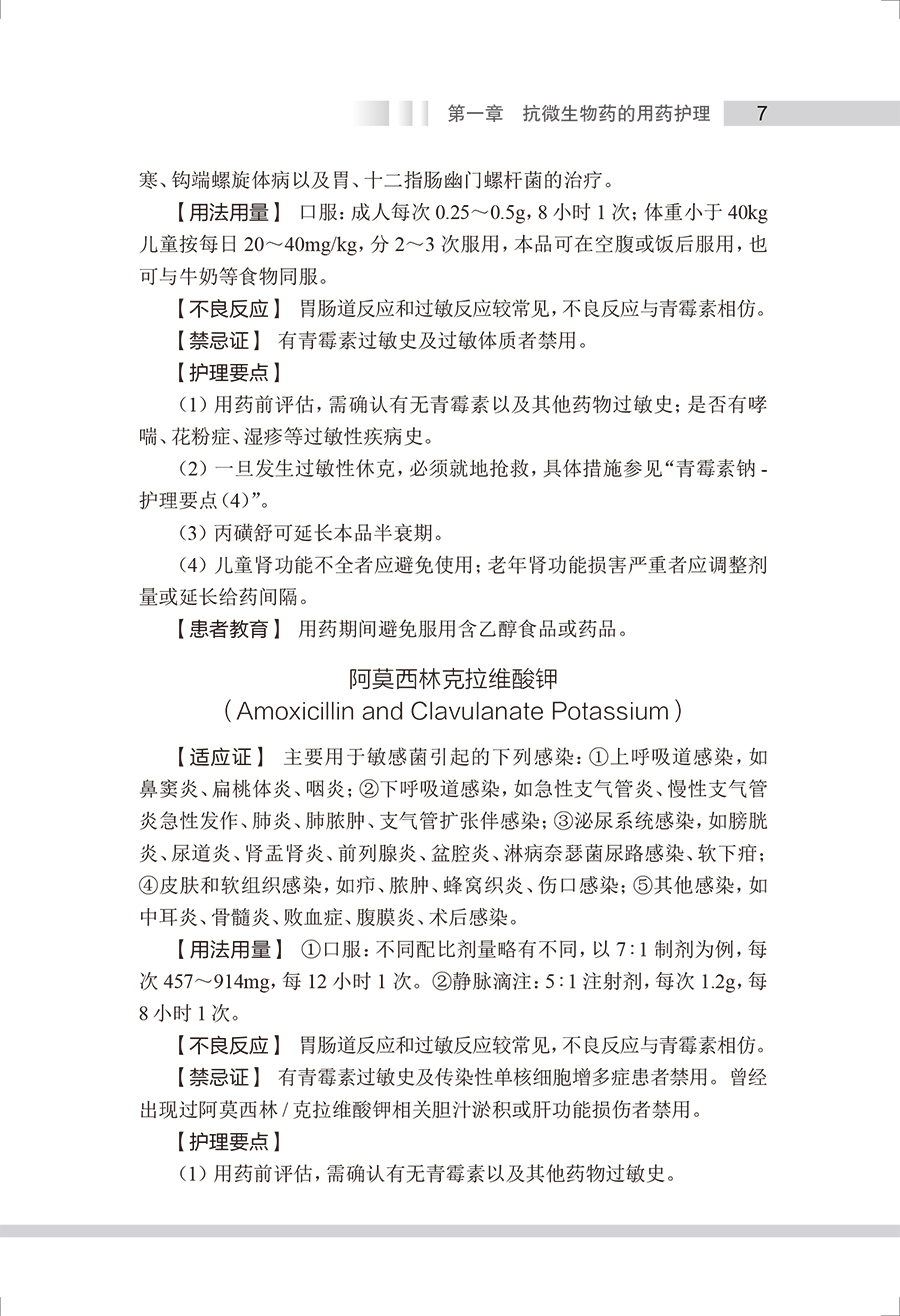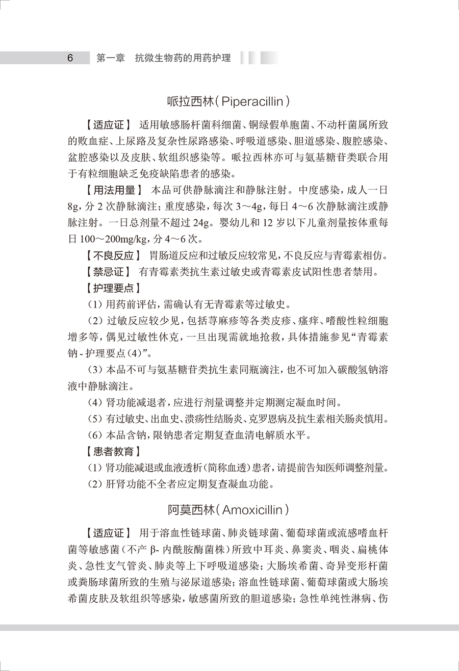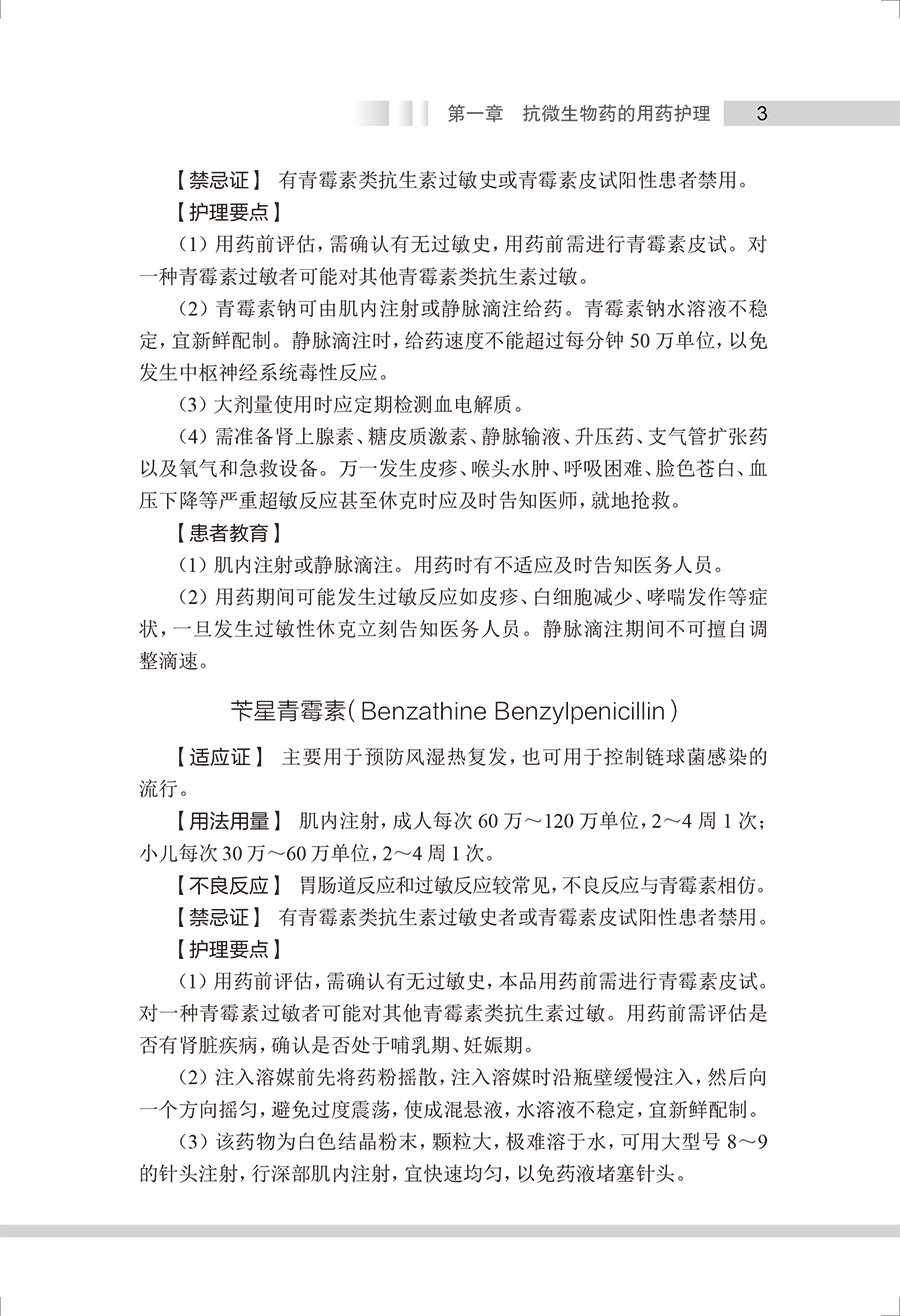 本书参考《国家基本药物目录(2018年版)》《国家基本医疗保险、工伤保险和生育保险药品目录(2021年)》,将临床常用药物按作用疾病及药理特性进行分类叙述,按照药物品种进行具体介绍,包括药物类别属性、药理作用、适应证、剂型规格、用法用量、不良反应、禁忌证、护理要点和患者教育等。结合临床实际用药问题,本书对护理要点和患者教育内容进行了重点的梳理,其中护理要点阐述了临床用药护理服务过程中的注意事项;“患者教育”则从患者、家属及照护人员的角度出发,阐述药物使用方法、用药注意事项以及生活方式干预等。