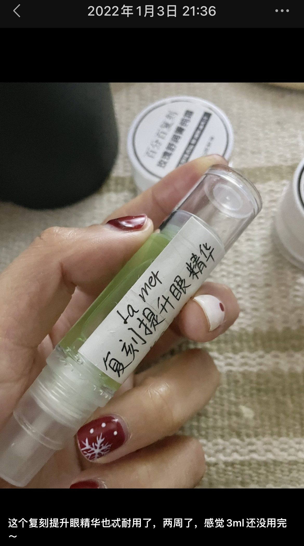 坚持到今天,20220106号,首批5ml尝鲜装出来啦!猪猪体验两周多的5ml(原版1ml100元)复刻提升眼精华尝鲜装雏形,出来了✌️ 根据猪猪经验,可以用三周以上! 送出姐妹们尝鲜哈!