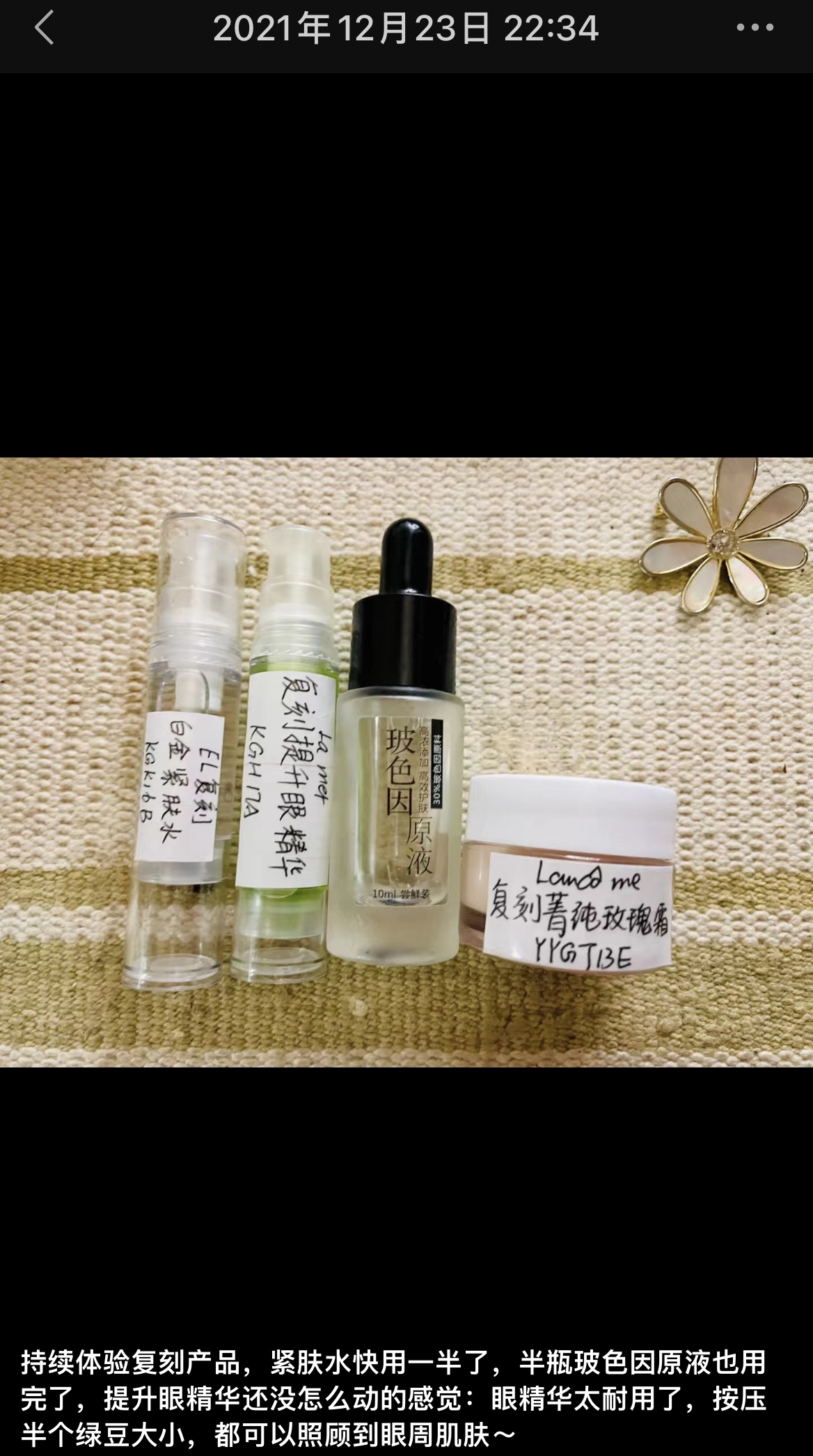 更新于2024年1028: 回顾复刻前辈不输口碑的提升紧致眼部精华液开发过程:由于眼部产品出货比较慢,虽然测评口碑不错,一直没出正式包装!2022年底,几位美容院老板娘测出口碑,要求功效检测备案供货,于是一个月就备案生产先给美容院供货啦:可以说是美容院美女老板娘们给了猪猪生产批量的底气,一直不停出货,不愁库存啦!