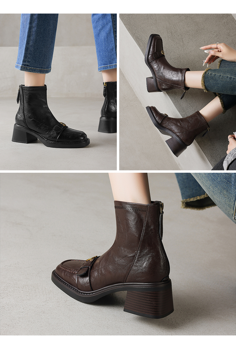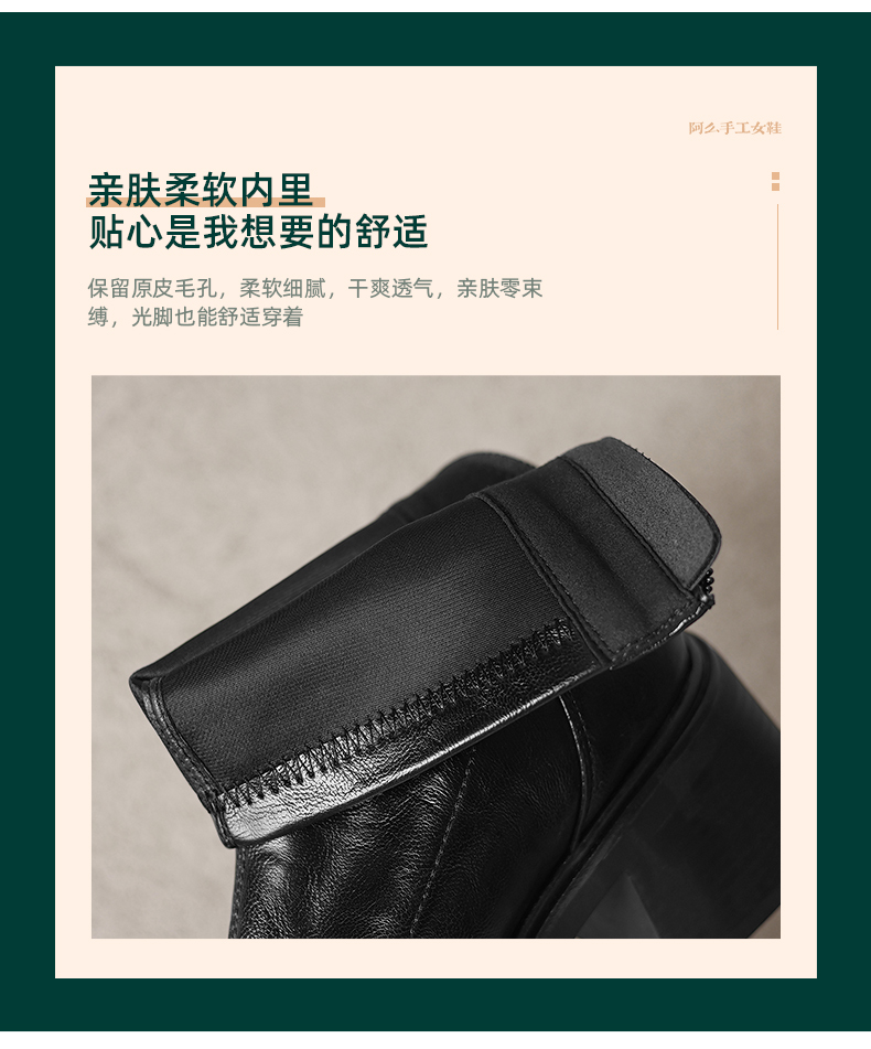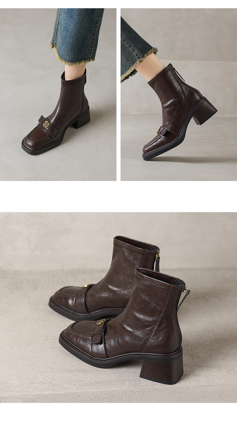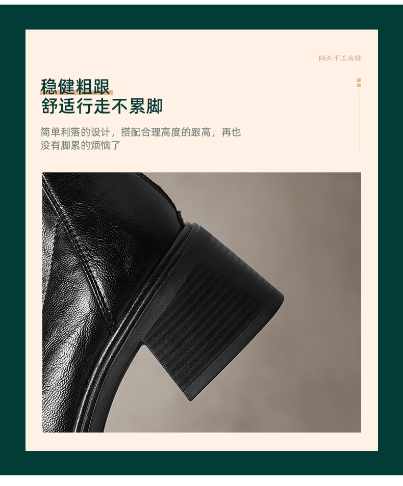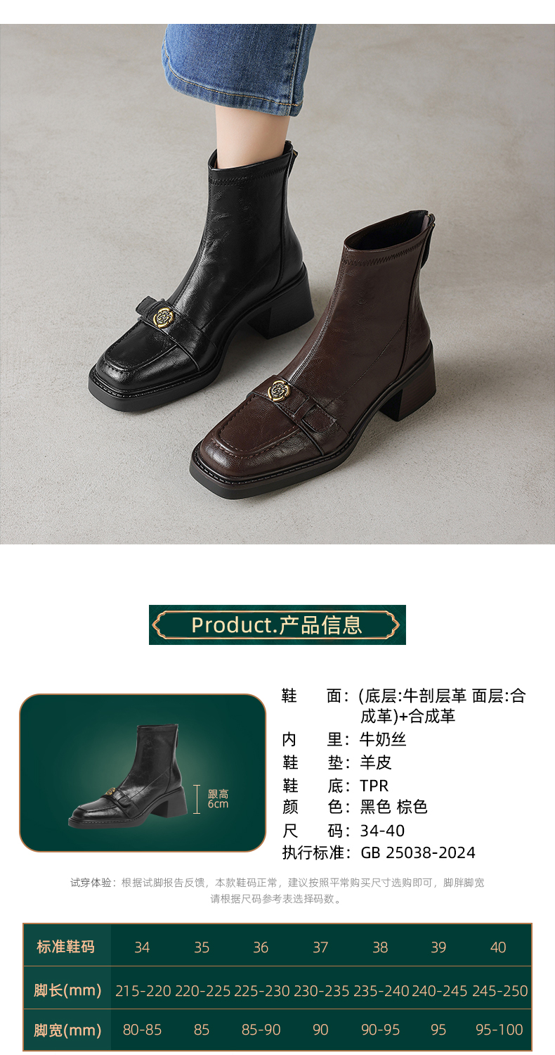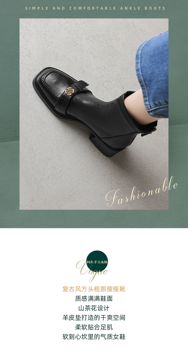 阿么手工女鞋山茶花复古粗跟短靴女2025秋冬新款百搭真皮靴子6CM