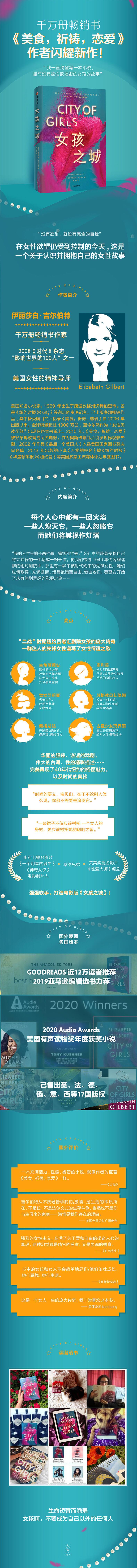 这个故事充斥着精彩的人物,华丽的服装,伟大的单句台词,令人信服的战时气氛,以及对性的精彩描述……很多读者只知道吉尔伯特是个回忆录作家,无论你有没有看过《美食,祈祷,恋爱》,请不要再错过她这本的小说。