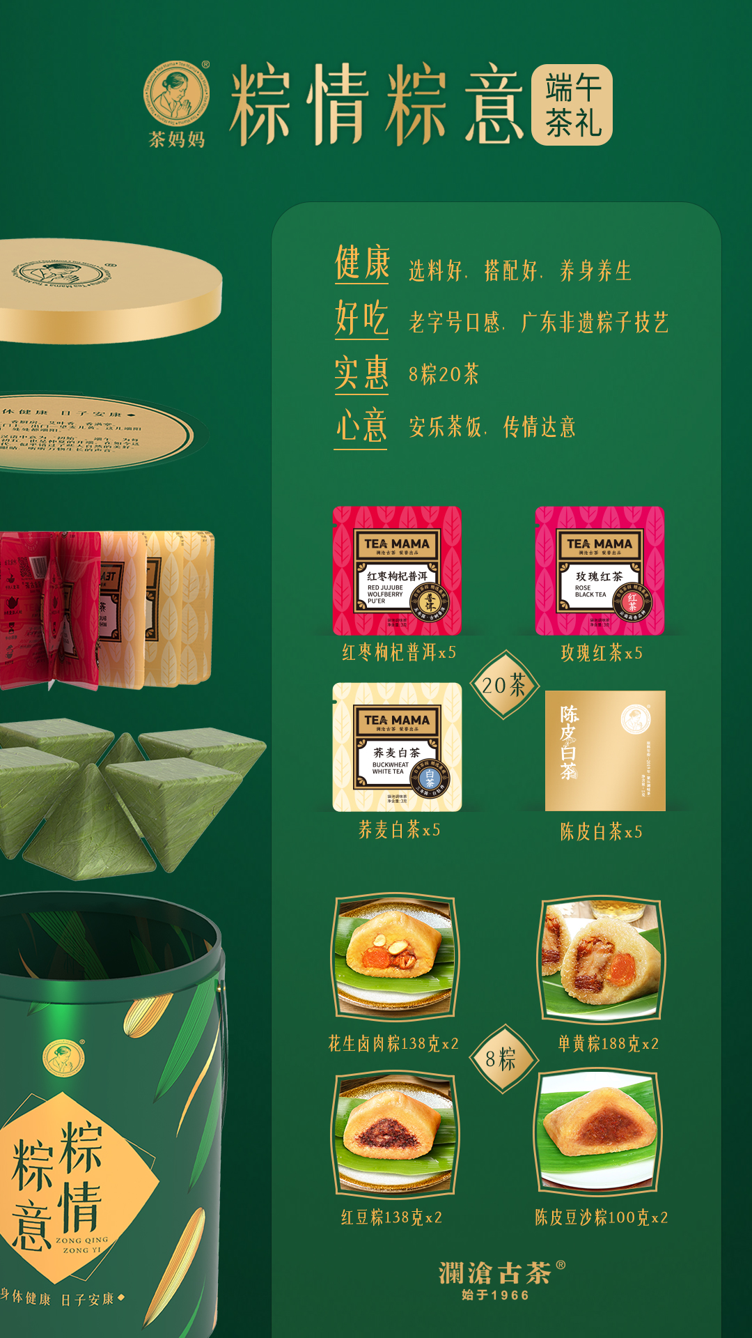 内含红枣枸杞普洱*5包+玫瑰红茶*5包+荞麦白茶*5包+陈皮白茶*5包+花生卤肉粽138克*2+单黄粽188克*2+红豆粽138克*2+陈皮豆沙粽100克*2
