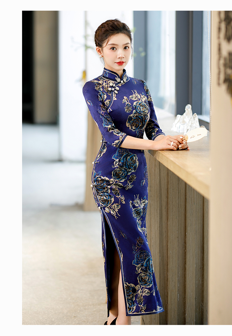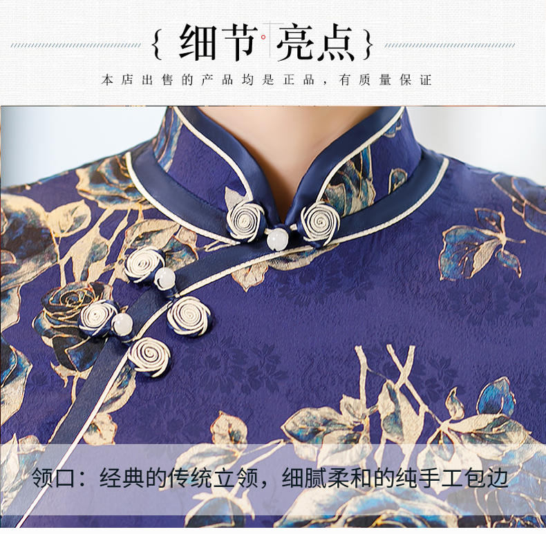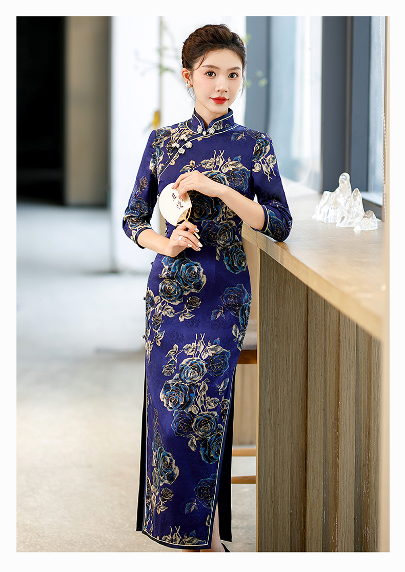 花萝藏蓝玫瑰真丝旗袍桑蚕丝WX-Z11