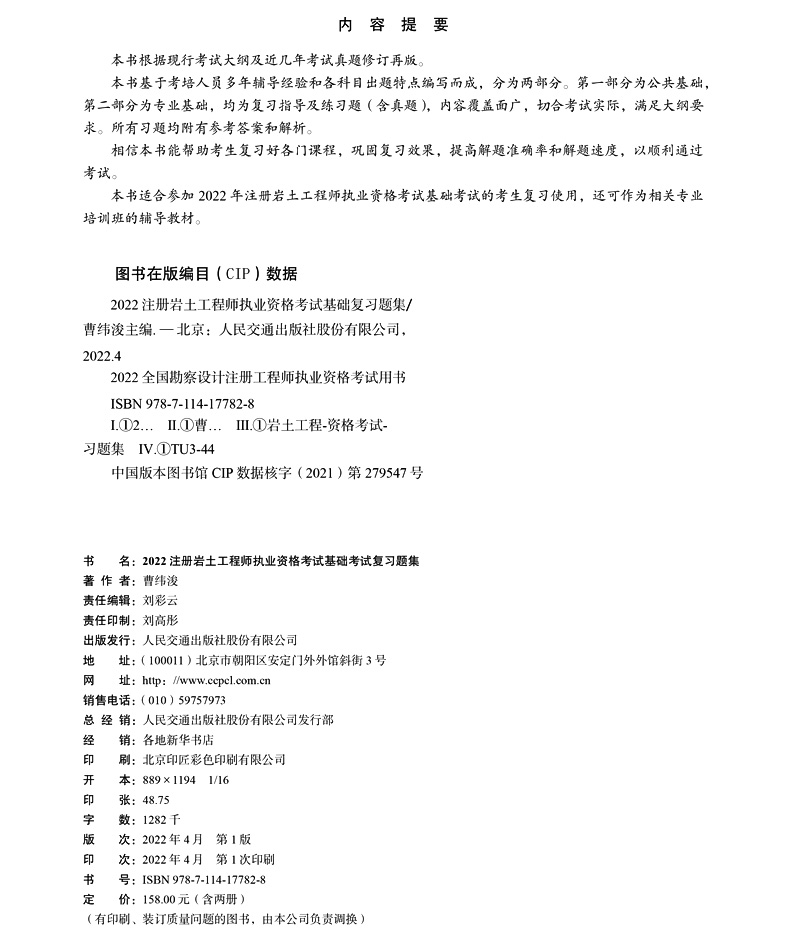 书名:2022注册岩土工程师执业资格考试基础考试复习题集