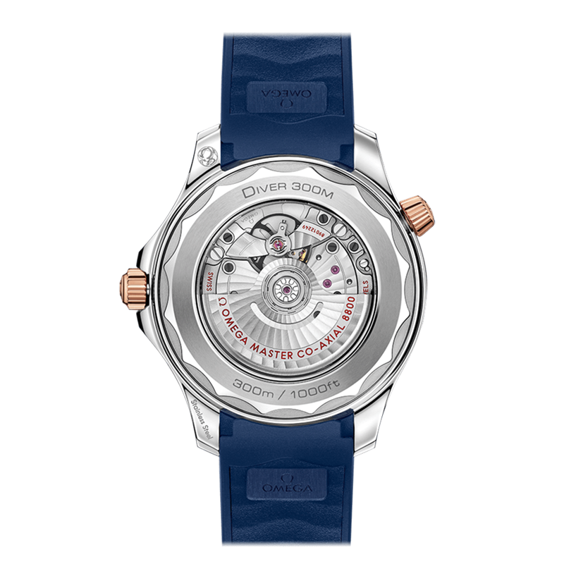 镜面材质 | 蓝宝石水晶玻璃 | 表盘 | 精钢与Sedna 18K红金打造而成,表圈采用蓝色陶瓷,潜水刻度经OMEGA Ceragold®技术制成。 表盘亦以抛光蓝色陶瓷制成,饰以激光镌刻波纹图案,6点钟位置设有日历窗口。 镂空指针和浮雕小时刻度由Sedna 18K金制成,并覆以白色Super-LumiNova夜光涂层,而排氦气阀门则以圆锥形造型呈现。 背透,透过采用波纹边缘设计的蓝宝石玻璃表背 |