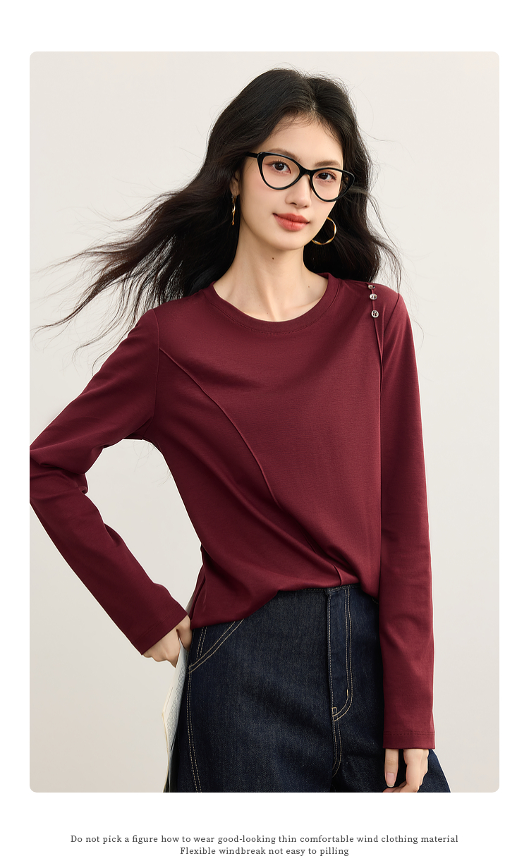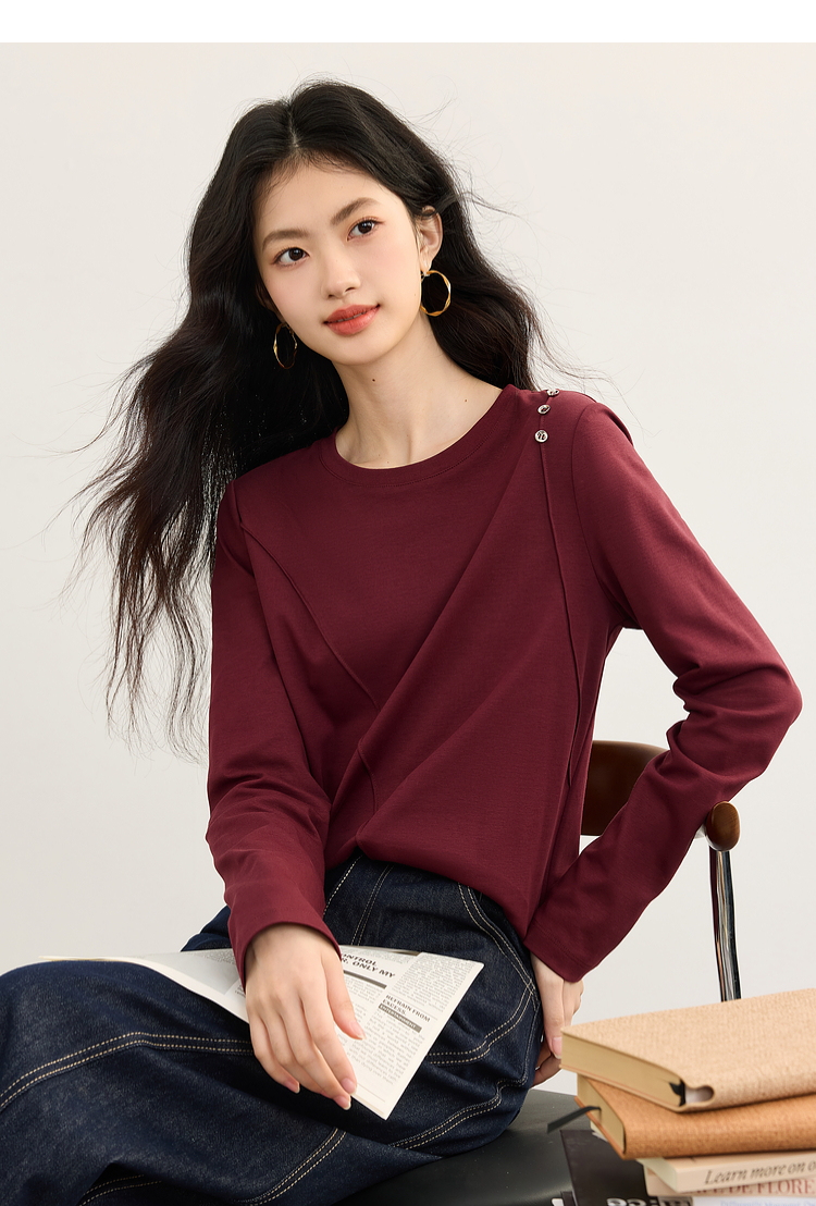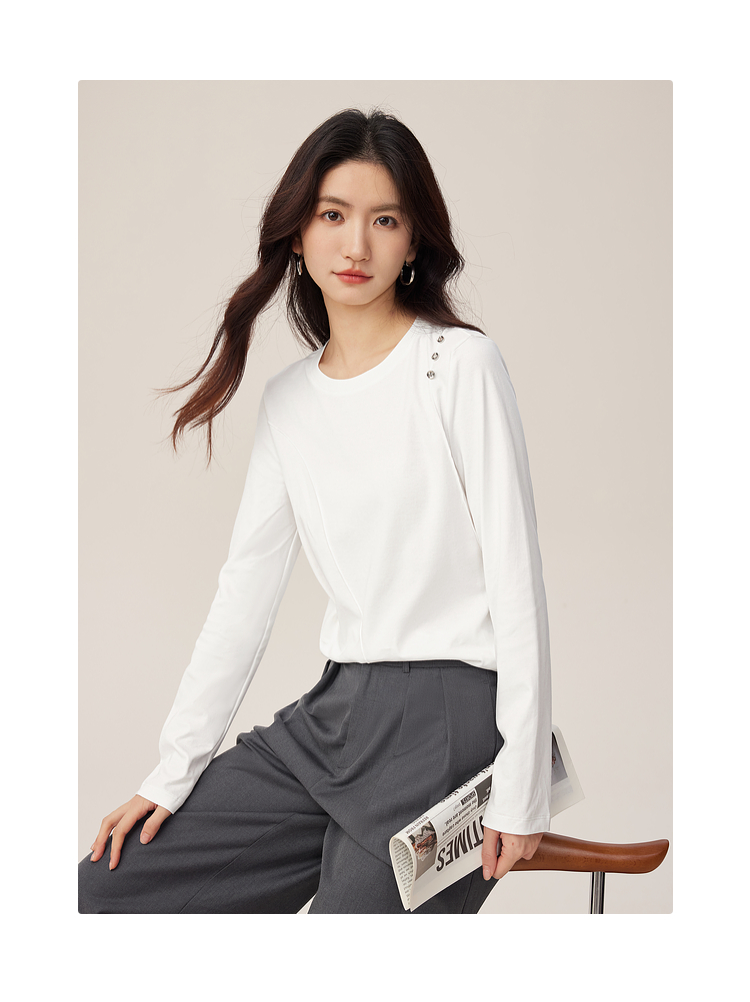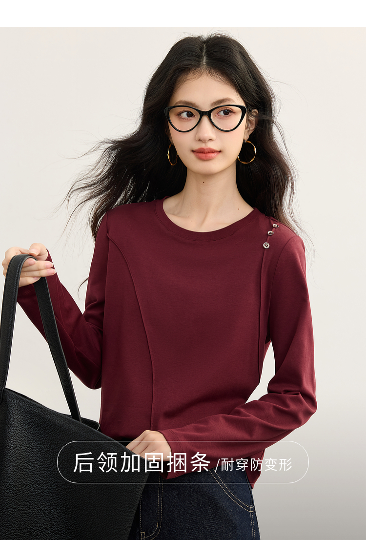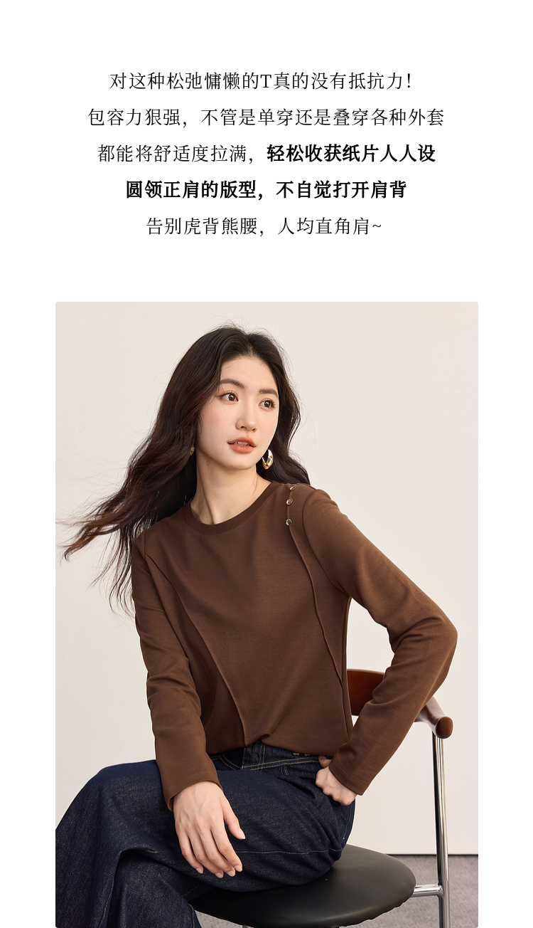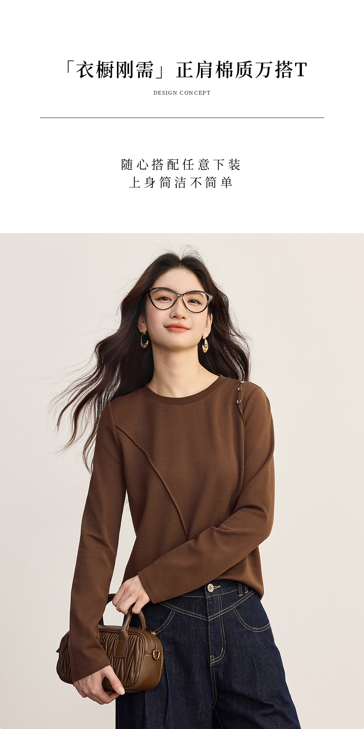 【08/27新品】熙世界全棉正肩长袖T恤上衣女2025年秋季新款通勤内搭圆领打底衫