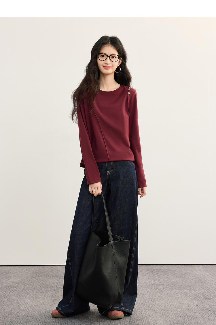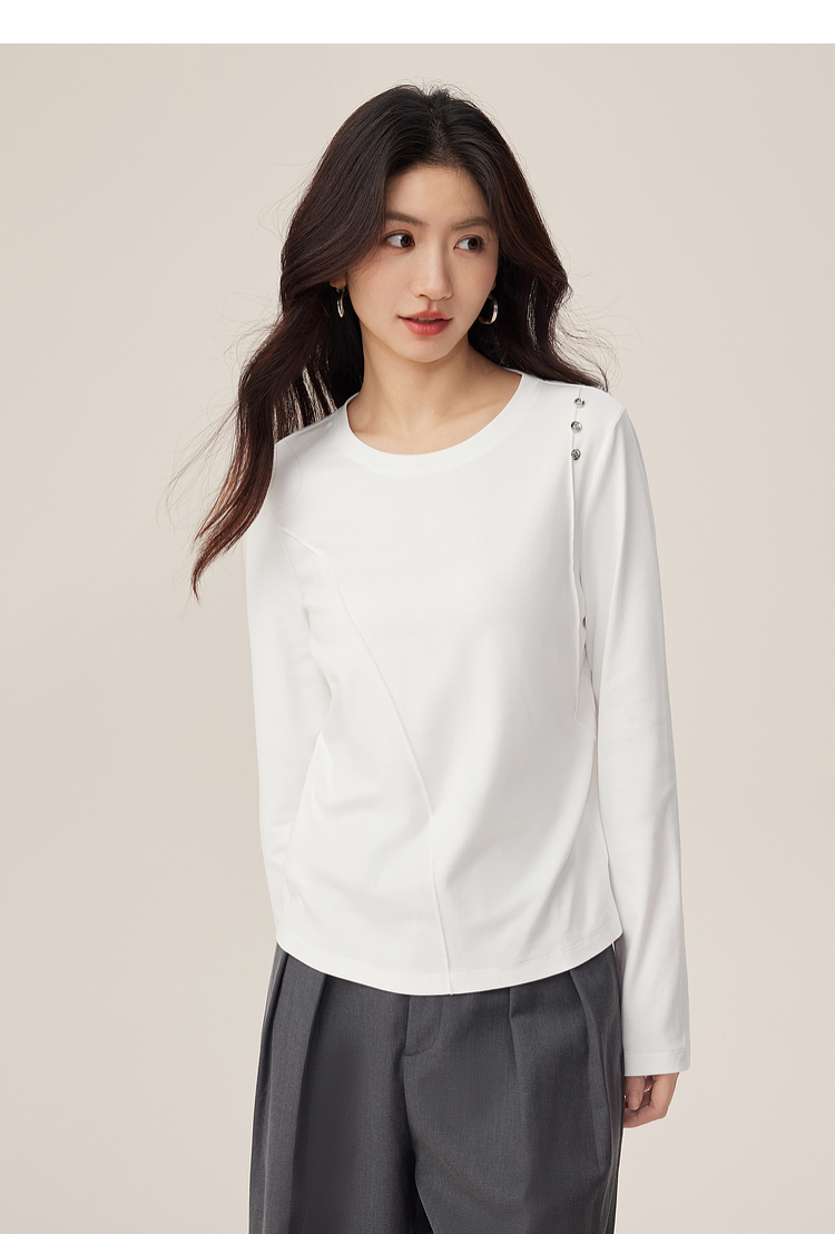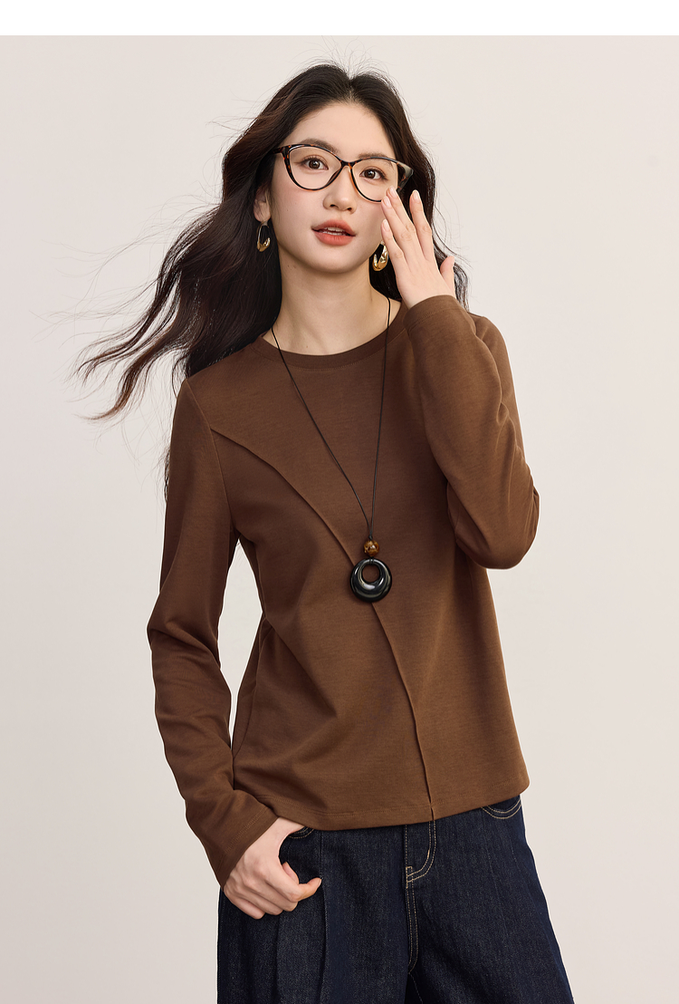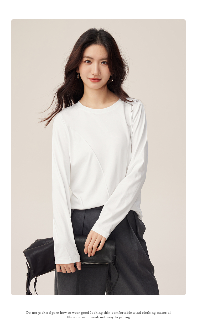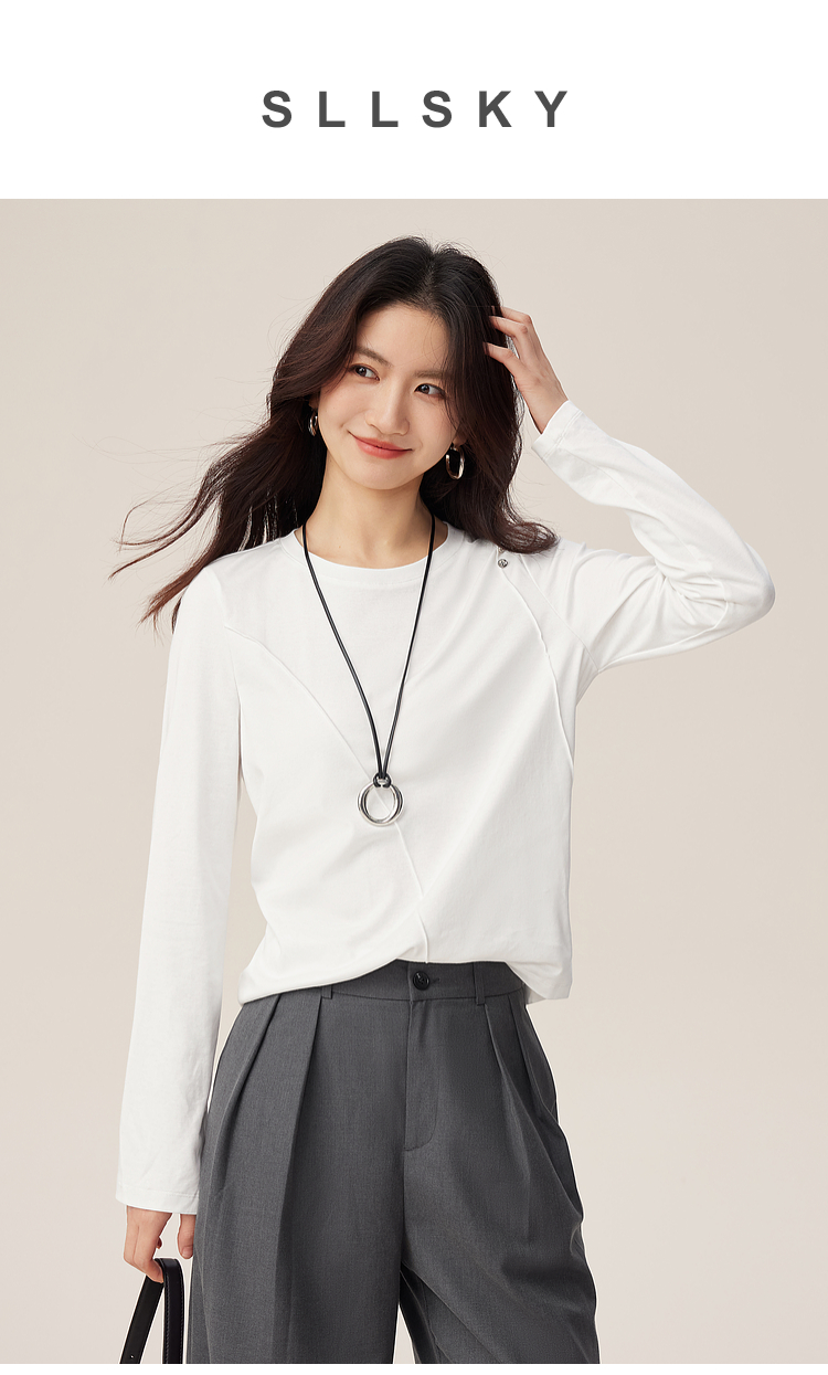 【08/27新品】熙世界全棉正肩长袖T恤上衣女2025年秋季新款通勤内搭圆领打底衫