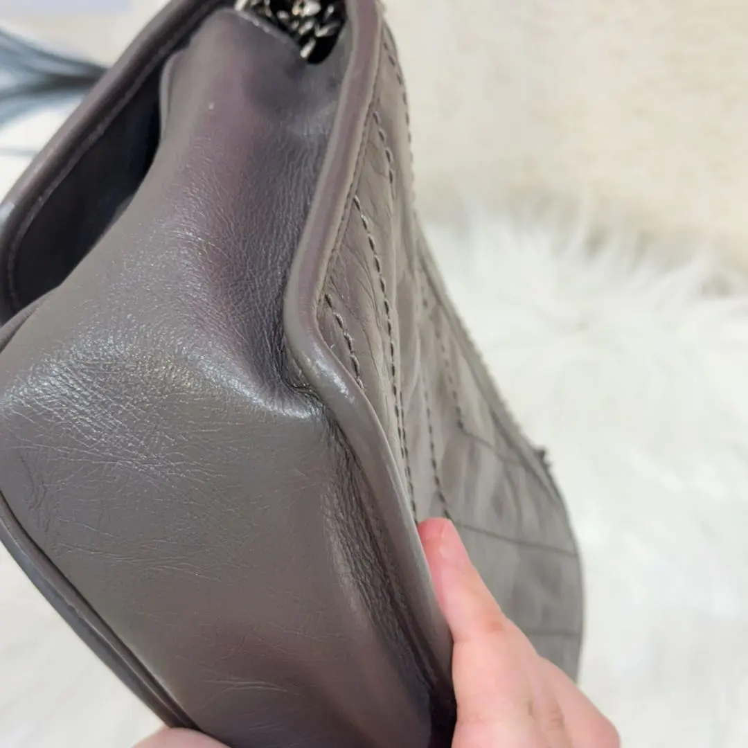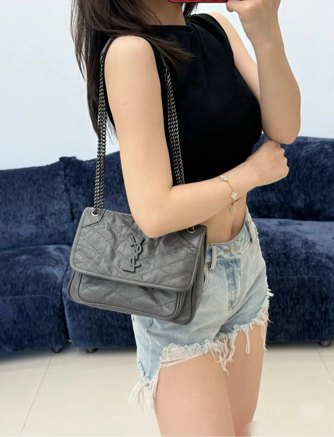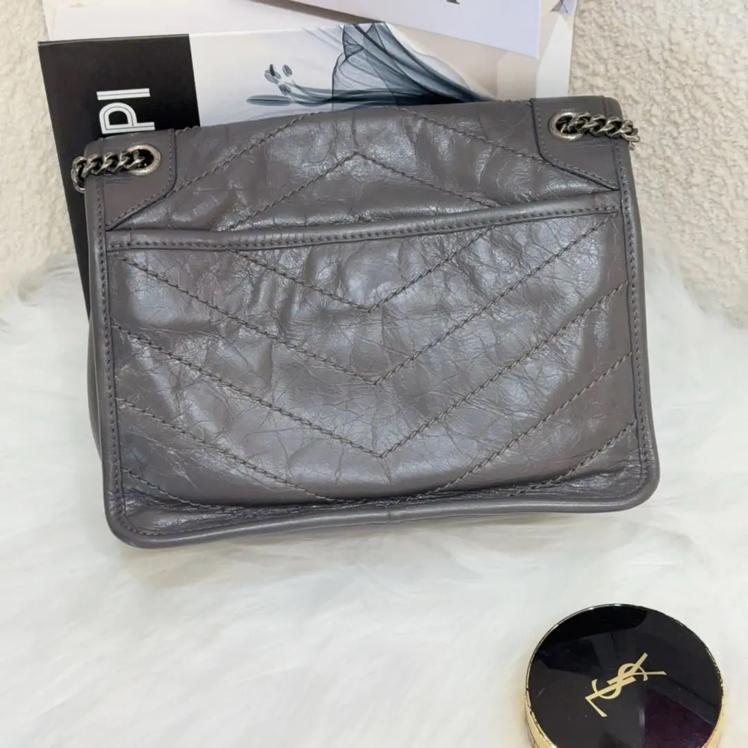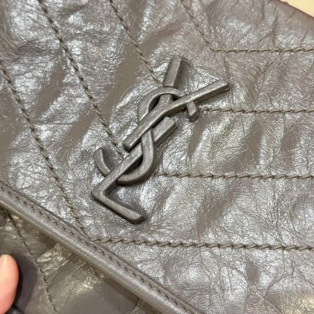 【商品详情】正品二手 YSL Niki 小号 灰色 D扣 油蜡牛皮 斜挎包🩶 98新 28×20 配件:说明书。复古褶皱设计 街头感十足