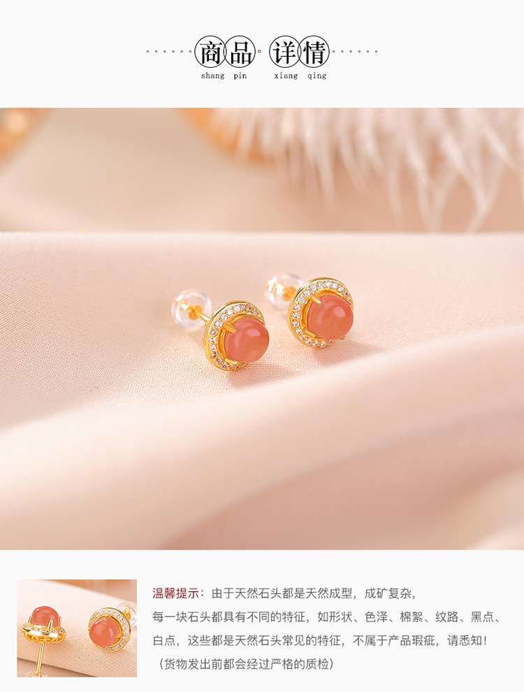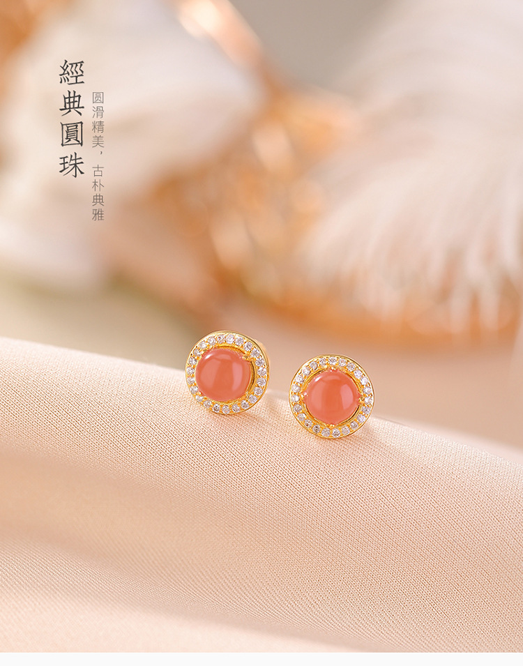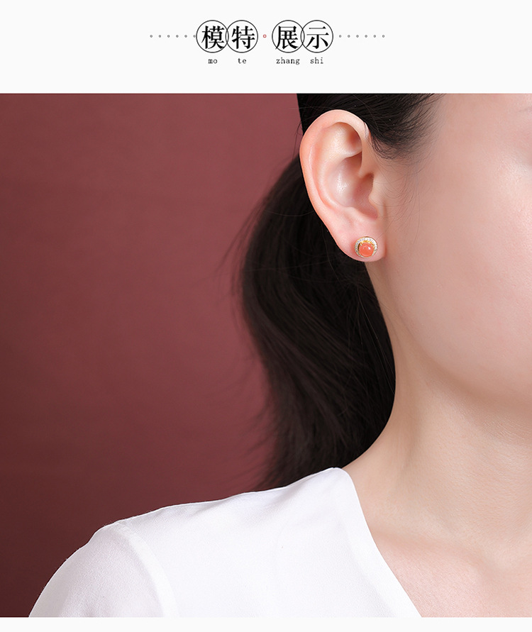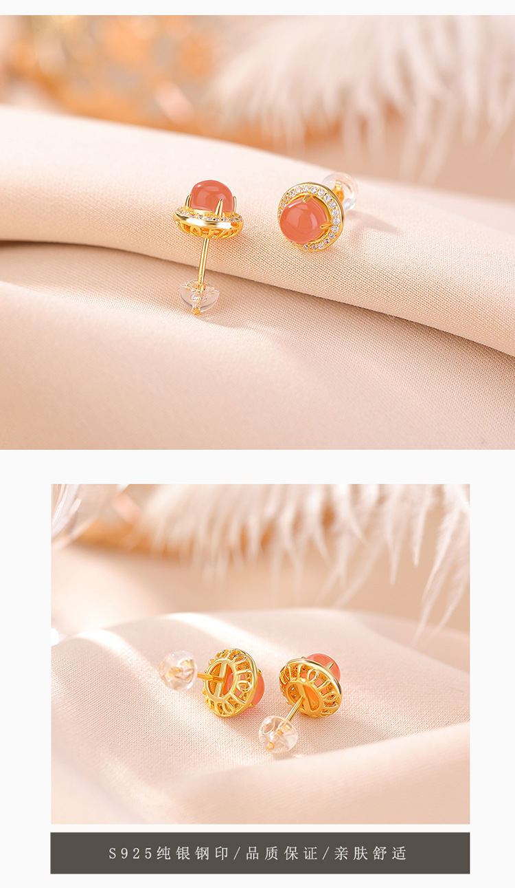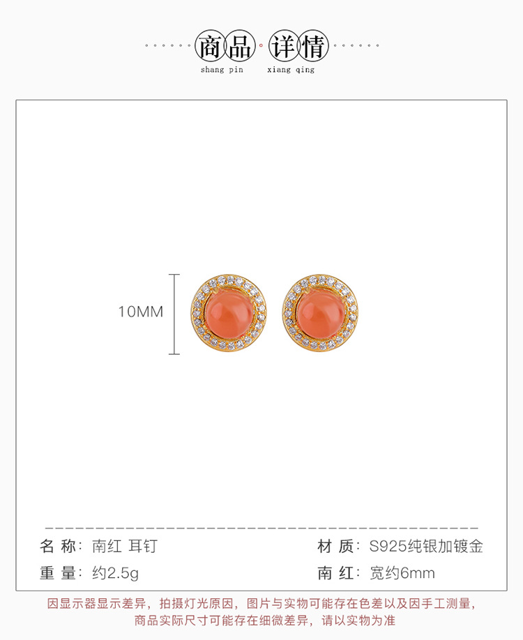【晚霞晴空】S925银镀金南红水红圆形耳钉【CW-ED03759】
