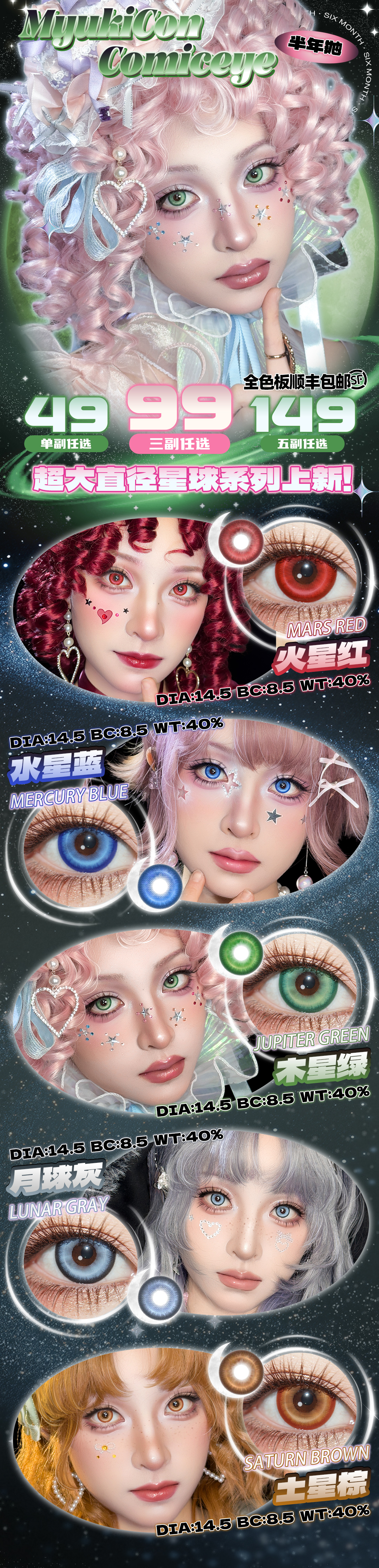 MyukiCon雪物语 半年抛 新品 星球系列 水星蓝/火星红/木星绿/土星棕/月球灰 COS推荐 园田海未/玛露希尔/第五人格园丁/格温/友利奈绪 棕色大直径 蓝色显色美瞳