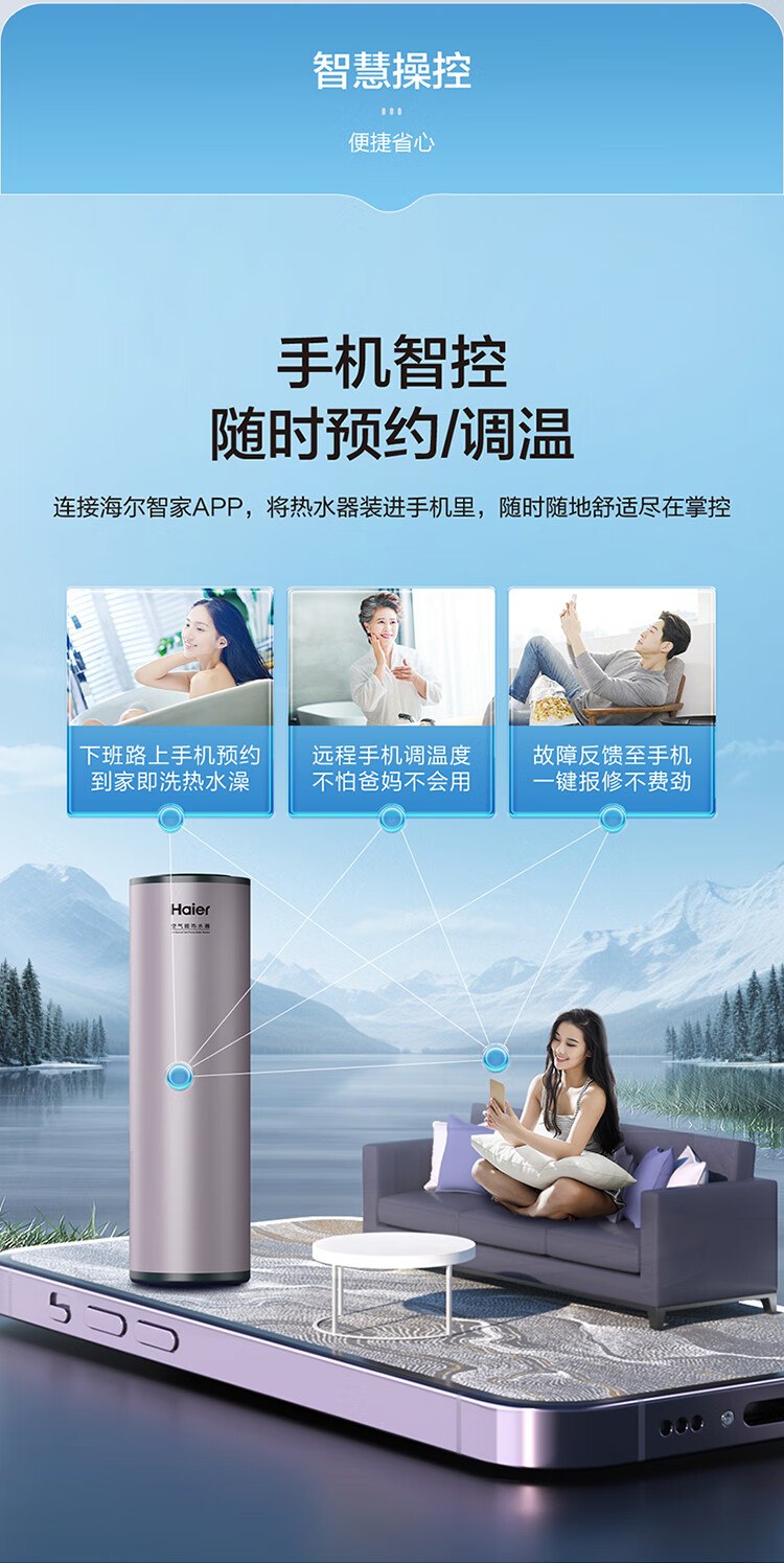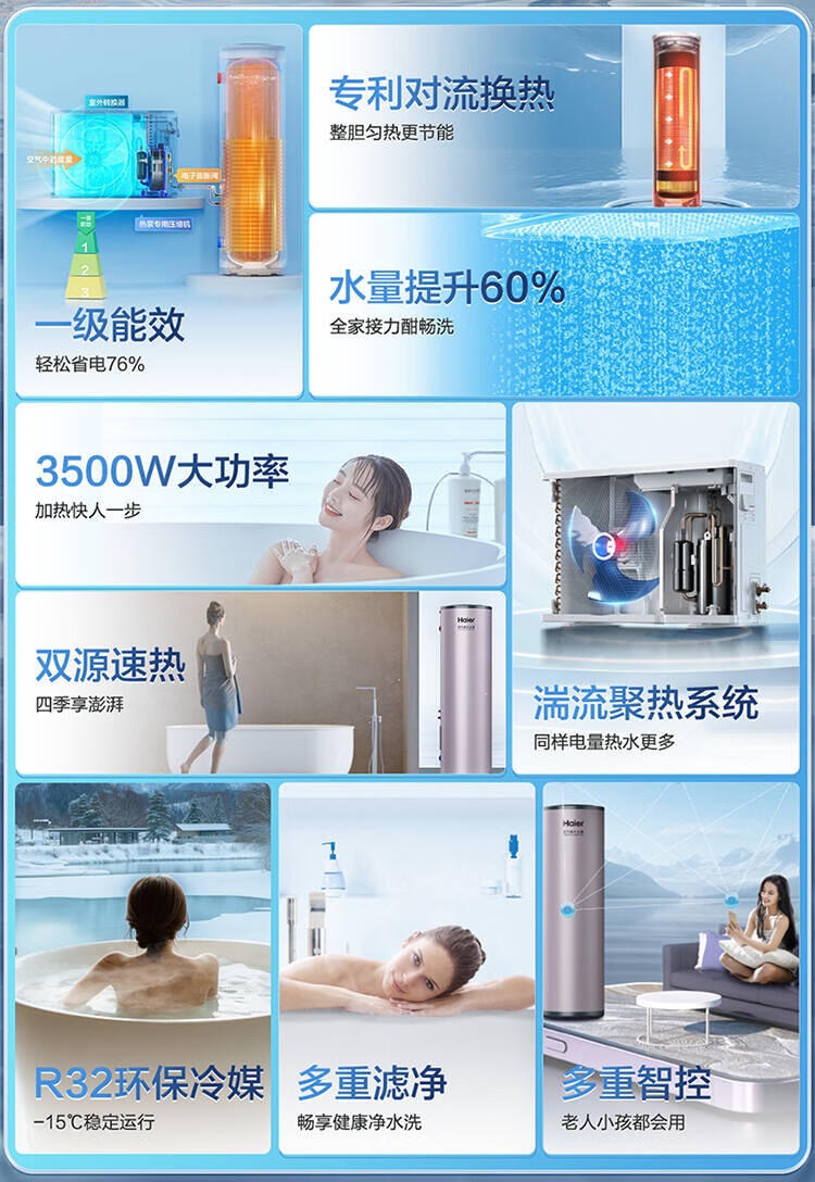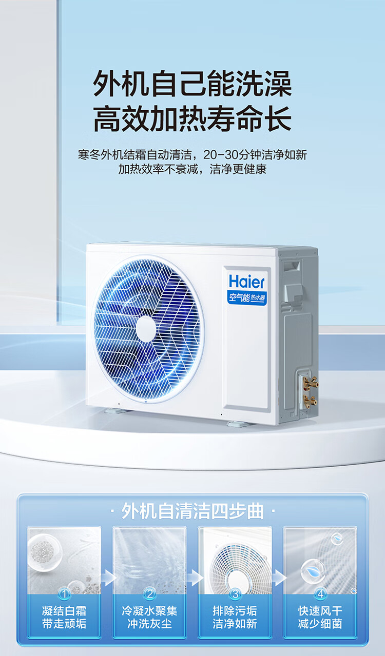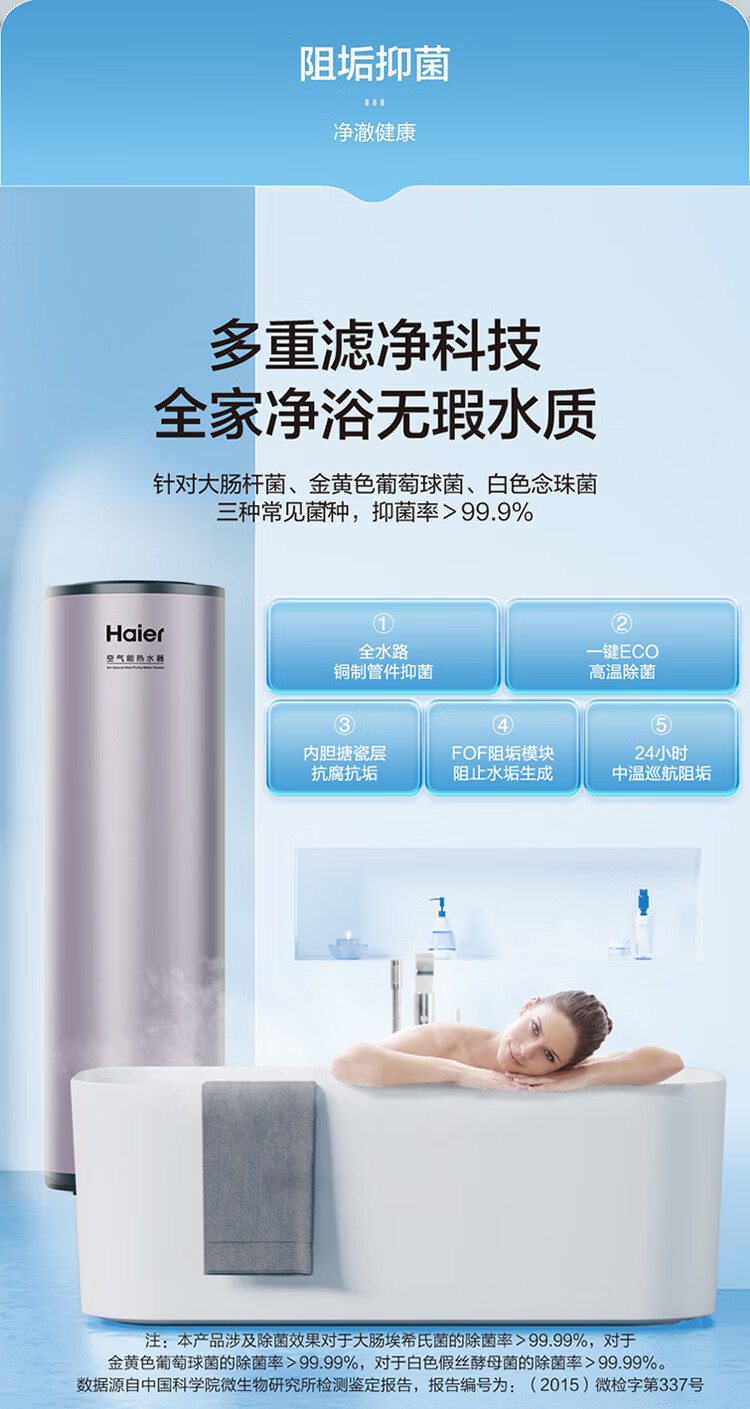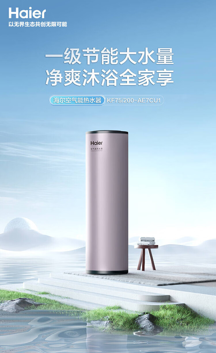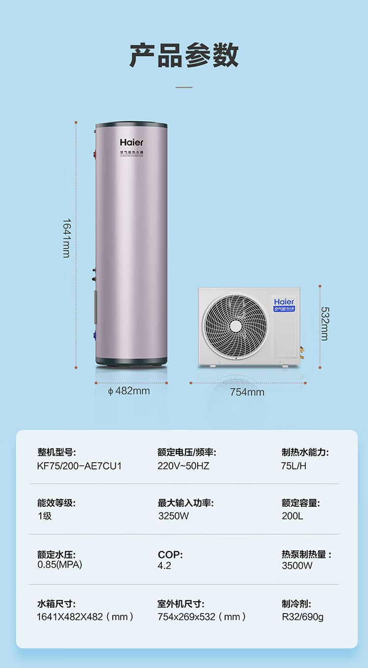 海尔(Haier)空气能热水器200升超一级能效大水量1.5匹电辅80℃高水温R32冷媒多重除菌 KF75/200-AE7CU1
