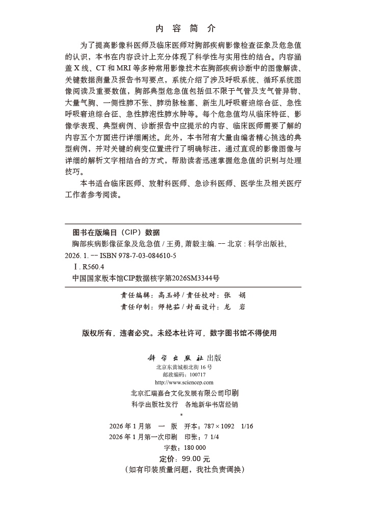 胸部疾病影像征象及危急值 医学影像征像及危急值丛书 王勇 萧毅 适用临床医师 放射医师 医学生 医学相关领域服务者等 科学出版社