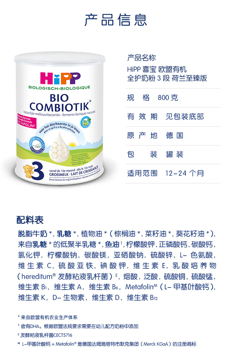 4罐【保税】喜宝有机益生菌奶粉3段 800g荷兰版(新老包装随即)