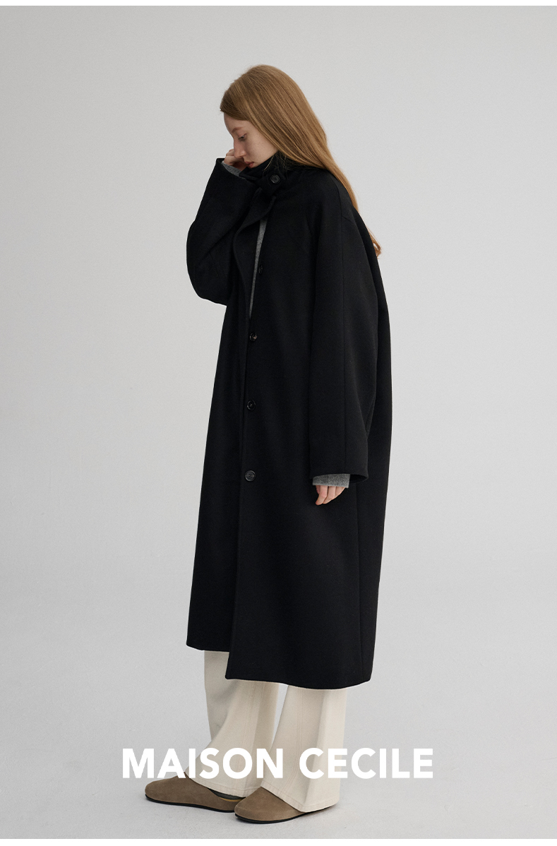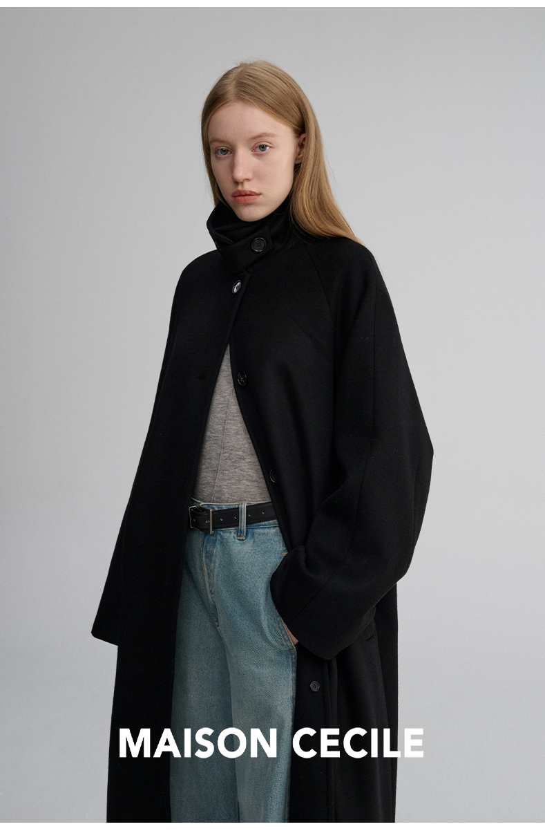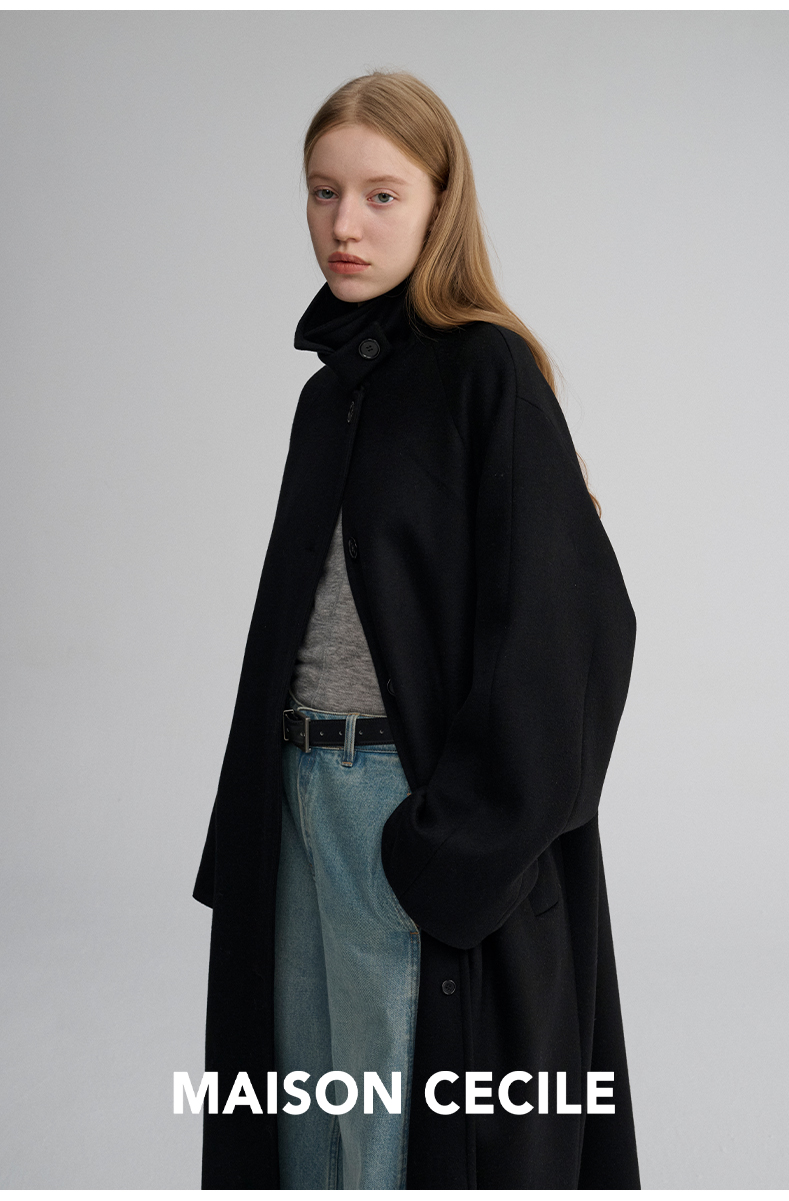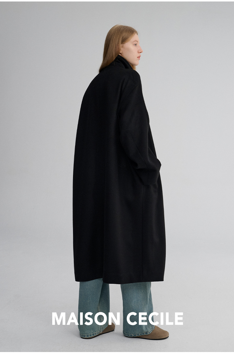 MAISON CECILE 高克重羊毛经典黑色廓形可立领长款毛呢大衣