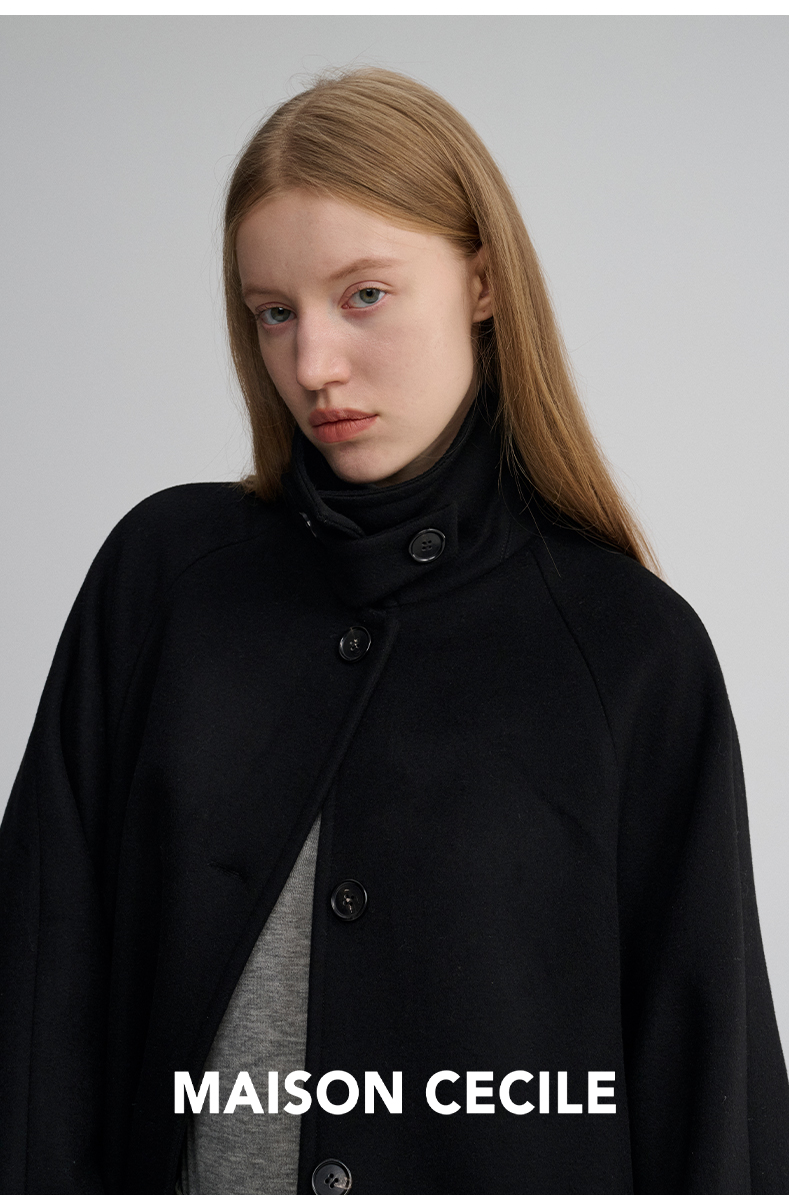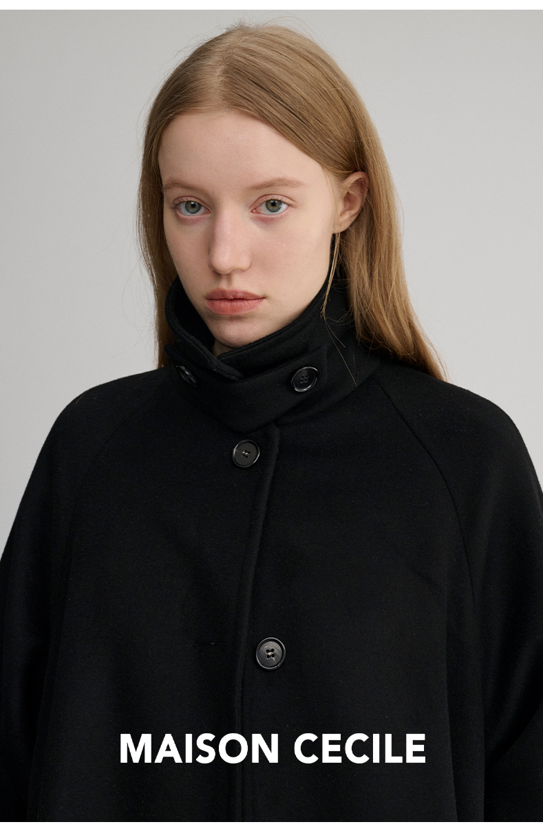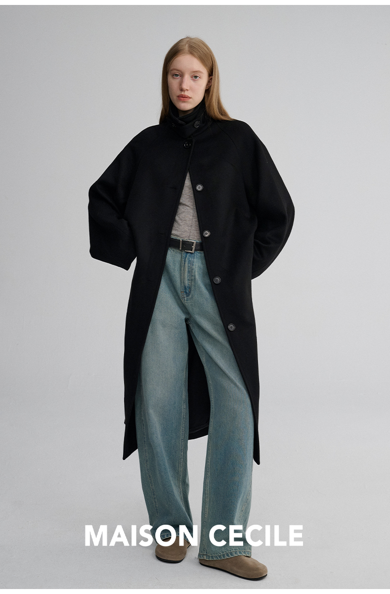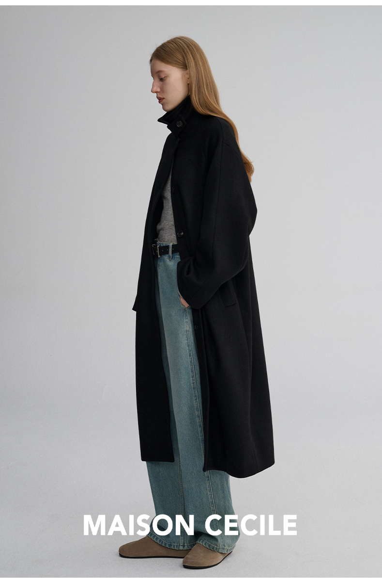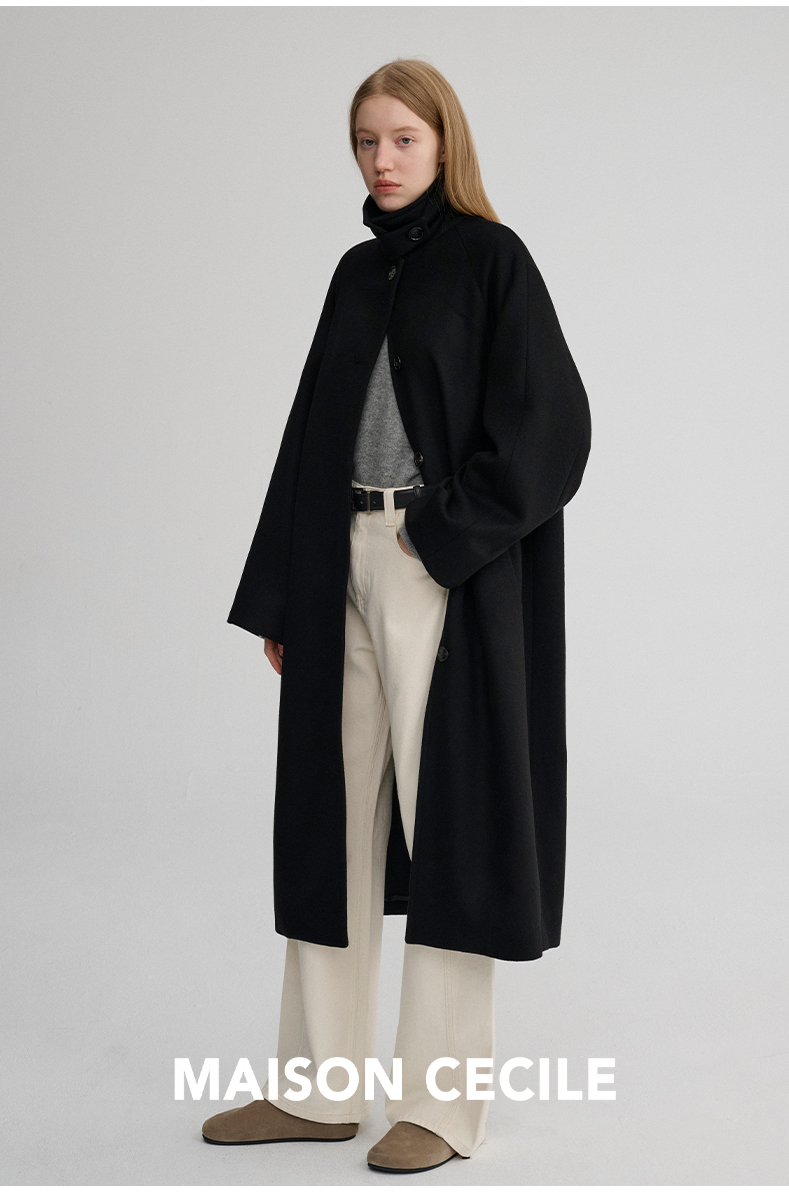 MAISON CECILE 高克重羊毛经典黑色廓形可立领长款毛呢大衣