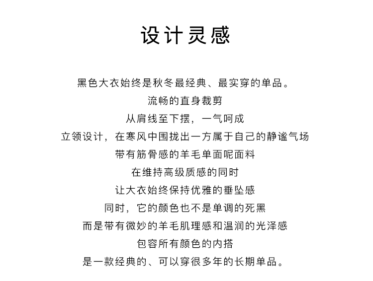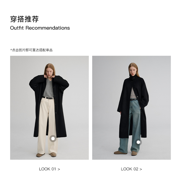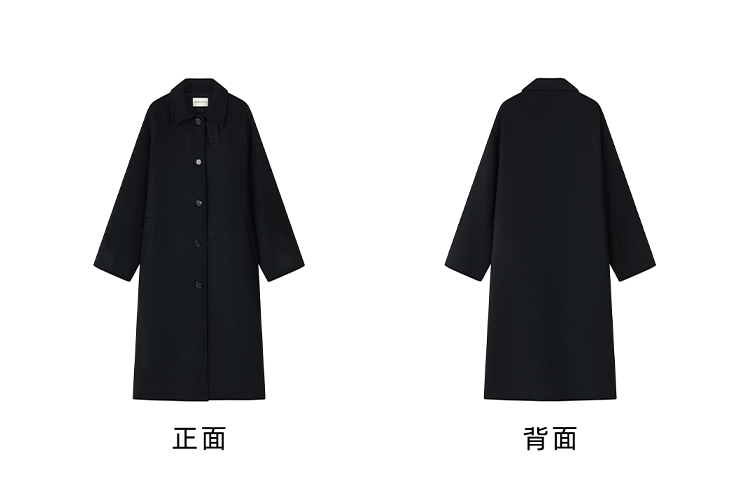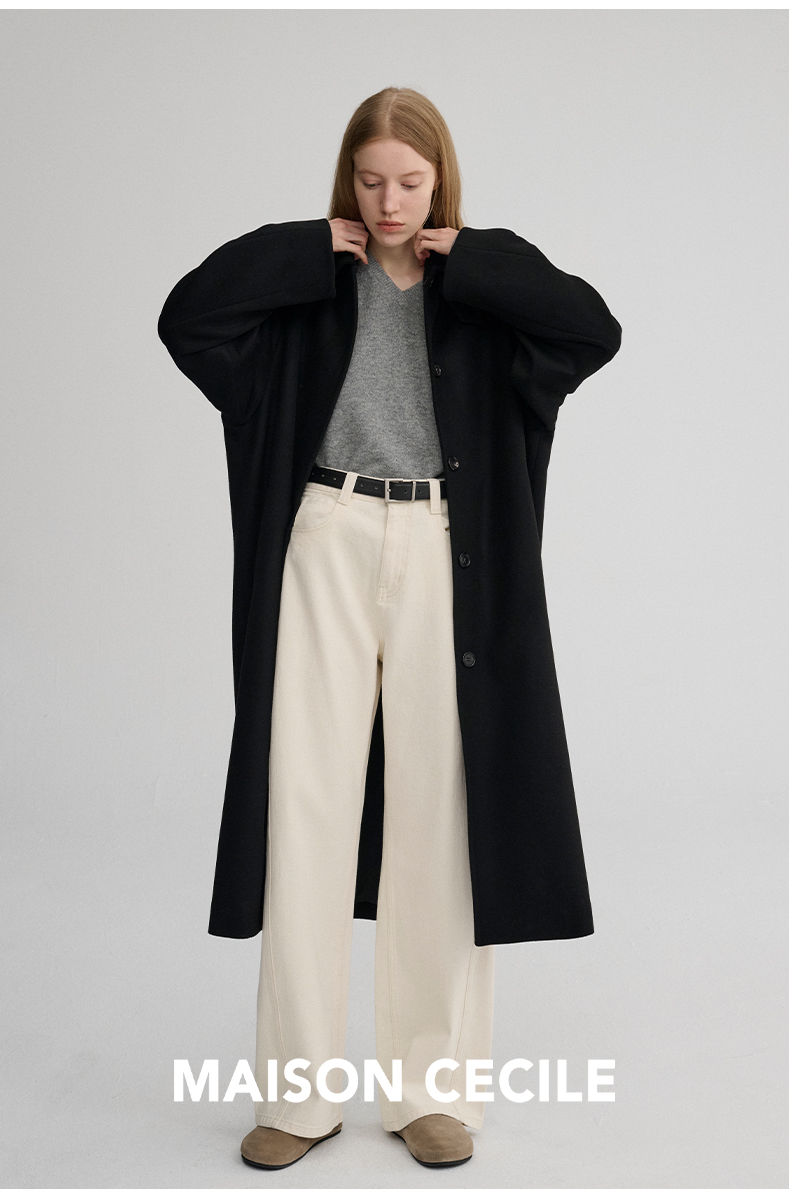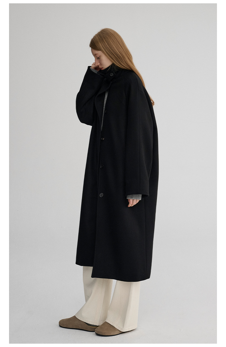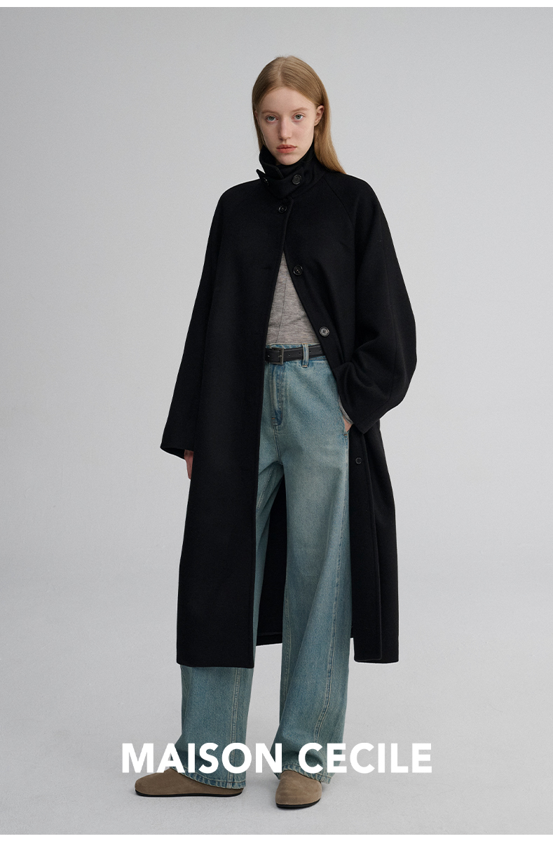 MAISON CECILE 高克重羊毛经典黑色廓形可立领长款毛呢大衣