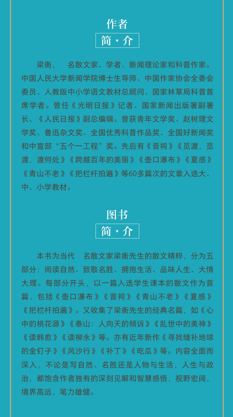 本书为当代著名散文家梁衡先生的散文精粹,分为五部分:阅读自然、致敬名胜、拥抱生活、品味人生、大情大理。每部分开头,以一篇入选学生课本的散文作为首篇,包括《壶口瀑布》《晋祠》《青山不老》《夏感》《把栏杆拍遍》。又收集了梁衡先生的经典名篇,如《心中的桃花源》《泰山:人向天的倾诉》《乱世中的美神》《读韩愈》《读柳永》等。亦有近年新作《寻找缝补地球的金钉子》《风沙行》《补丁》《吃瓜》等。内容全面而深入,不论是写自然、名胜还是人物与生活,人生与政治,都饱含作者独有的深刻见解和智慧感悟,视野宏阔,境界高远,笔力雄健。