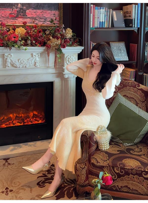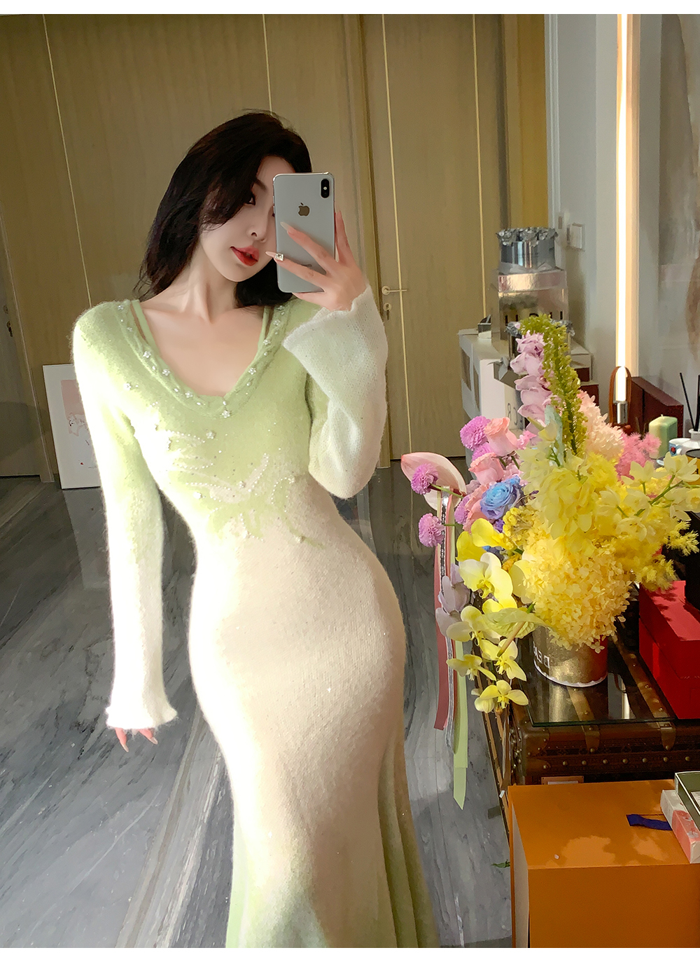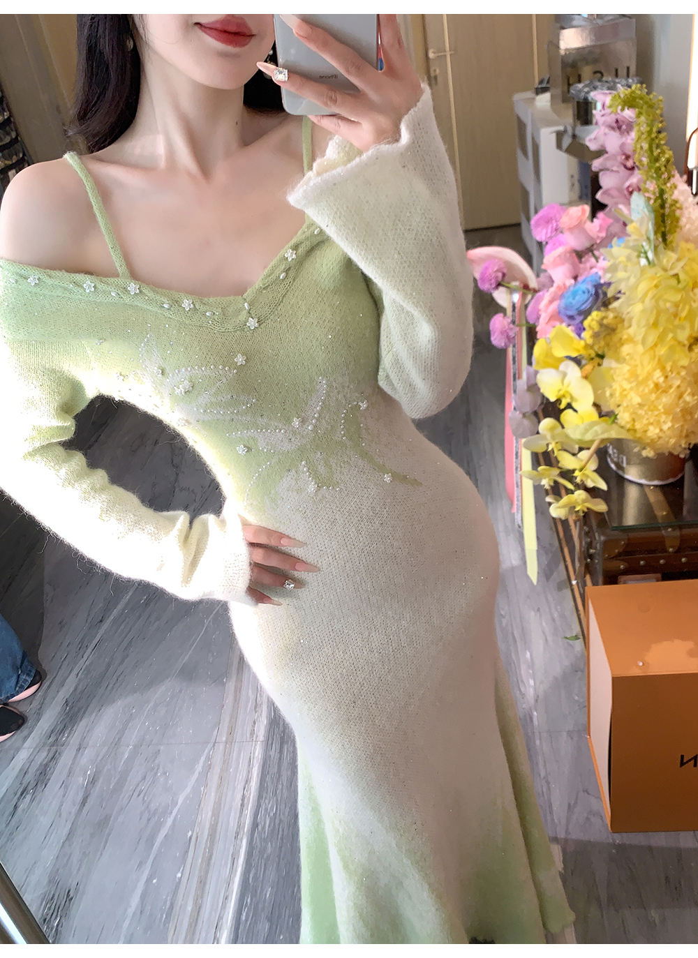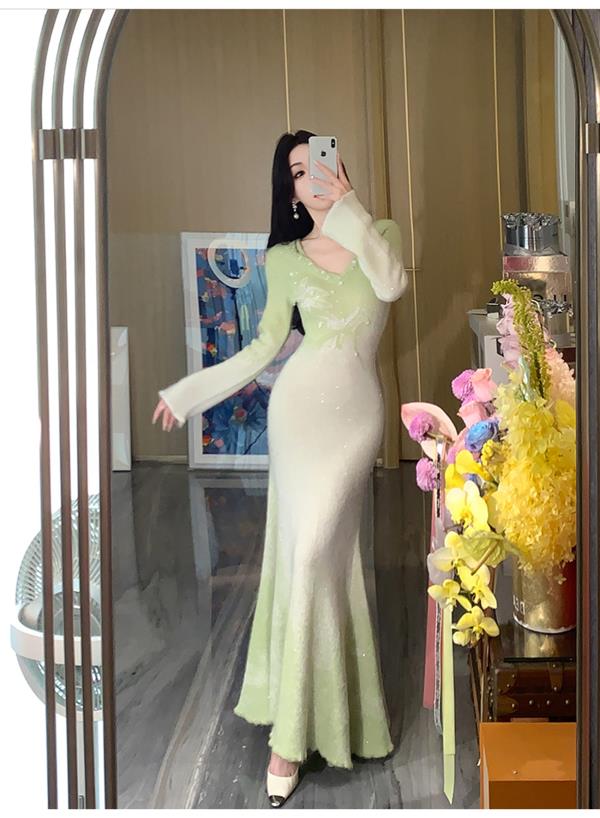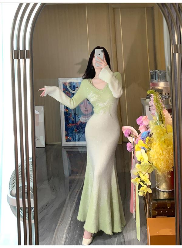 余潇潇【绿野仙情】羊驼毛羊毛两色提花渐变收腰鱼尾连衣裙过年穿搭