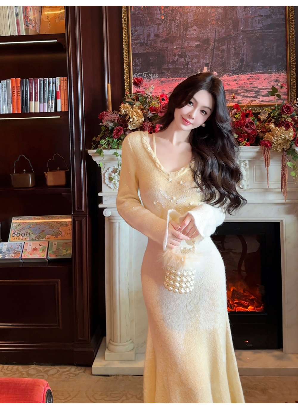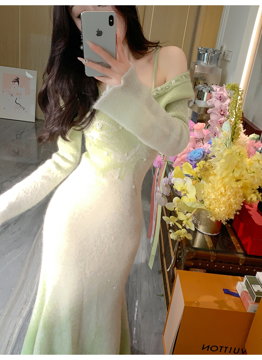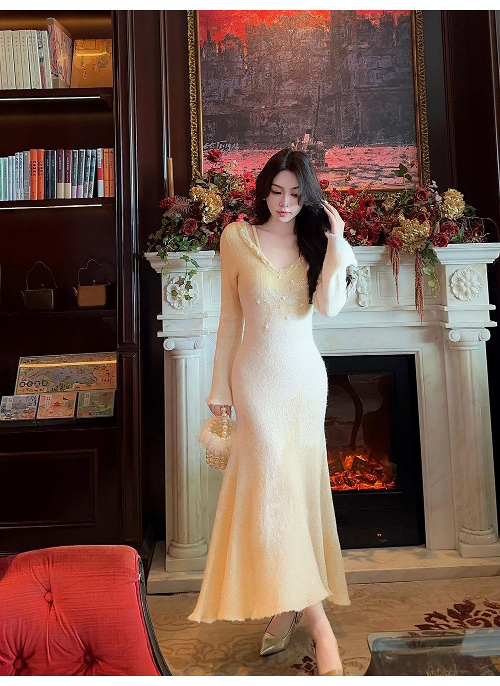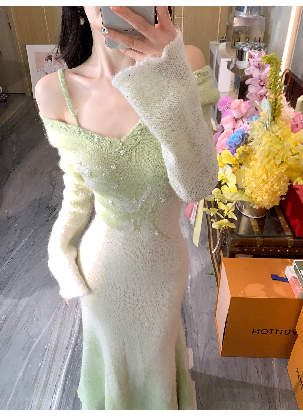 余潇潇【绿野仙情】羊驼毛羊毛两色提花渐变收腰鱼尾连衣裙过年穿搭