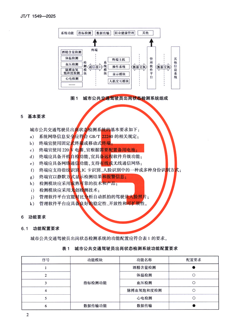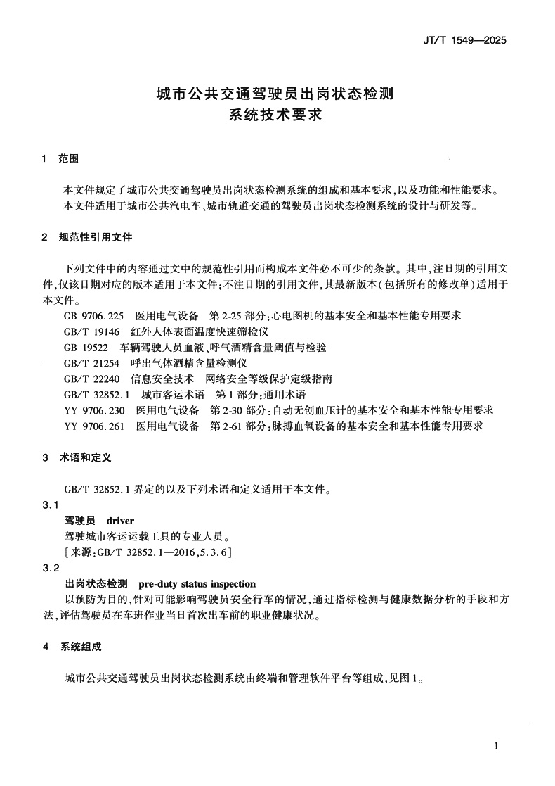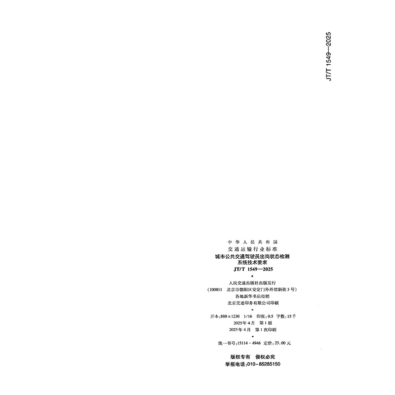 书名:城市公共交通驾驶员出岗状态检测系统技术要求(JT/T 1549—2025)