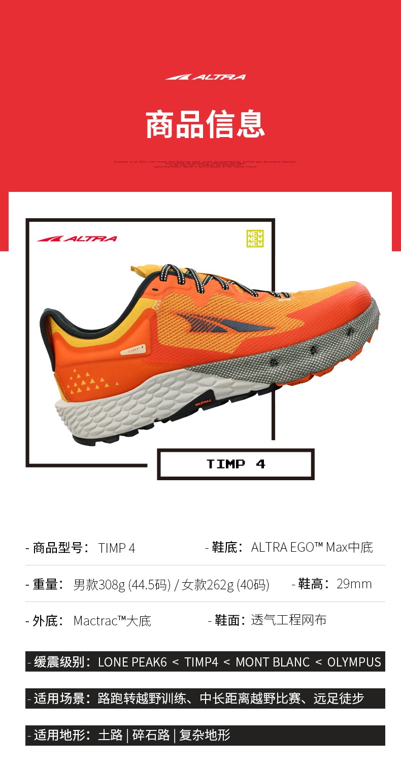 Altra越野跑鞋Timp4户外越野跑鞋减震防滑跑山鞋宽鞋楦越野跑鞋