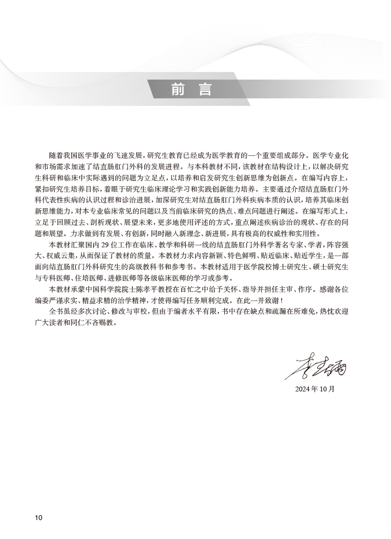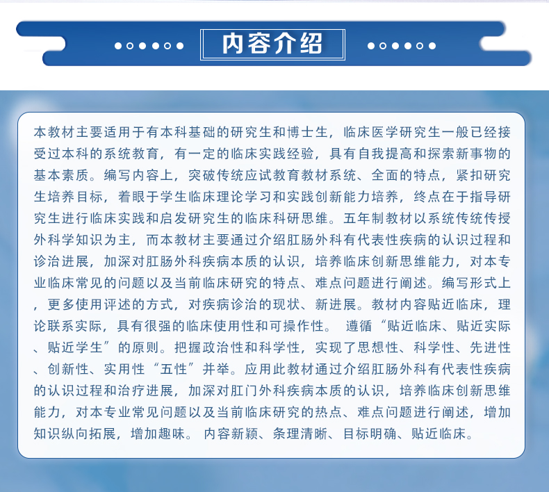 本教材主要适用于有本科基础的研究生和博士生,临床医学研究生一般已经接受过本科的系统教育,有一定的临床实践经验,具有自我提高和探索新事物的基本素质。编写内容上,突破传统应试教育教材系统、全面的特点,紧扣研究生培养目标,着眼于学生临床理论学习和实践创新能力培养,终点在于指导研究生进行临床实践和启发研究生的临床科研思维。五年制教材以系统传统传授外科学知识为主,而本教材主要通过介绍肛肠外科有代表性疾病的认识过程和诊治进展,加深对肛肠外科疾病本质的认识,培养临床创新思维能力,对本专业临床常见的问题以及当前临床研究的特点、难点问题进行阐述。编写形式上,更多使用评述的方式,对疾病诊治的现状、新进展。教材内容贴近临床,理论联系实际,具有很强的临床使用性和可操作性。 遵循“贴近临床、贴近实际、贴近学生”的原则。把握政治性和科学性,实现了思想性、科学性、先进性、创新性、实用性“五性”并举。应用此教材通过介绍肛肠外科有代表性疾病的认识过程和治疗进展,加深对肛门外科疾病本质的认识,培养临床创新思维能力,对本专业常见问题以及当前临床研究的热点、难点问题进行阐述,增加知识纵向拓展,增加趣味。 内容新颖、条理清晰、目标明确、贴近临床。