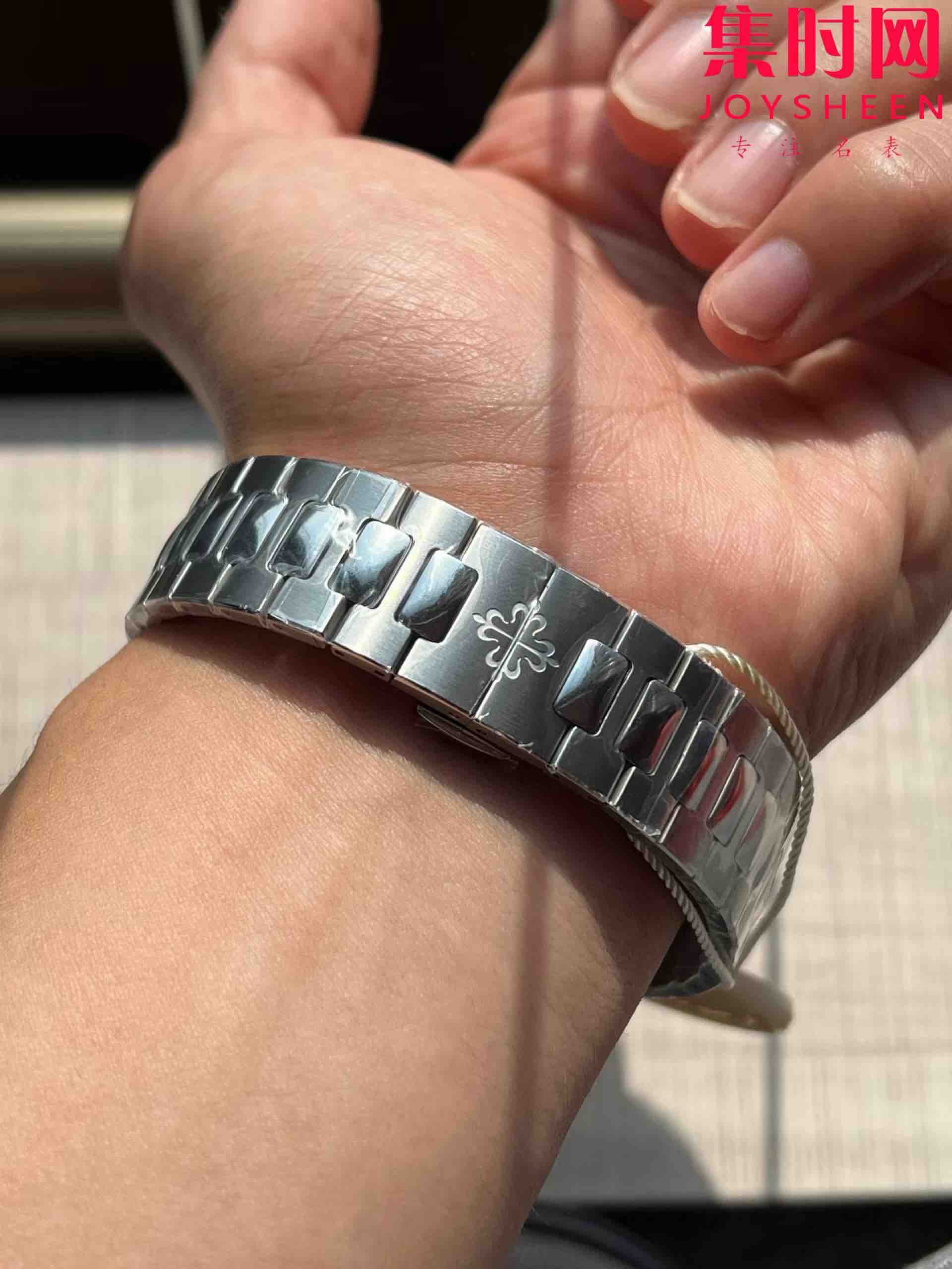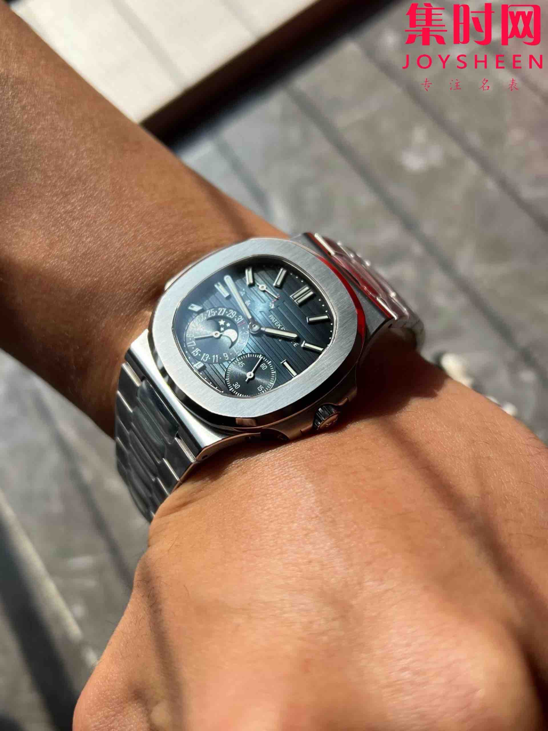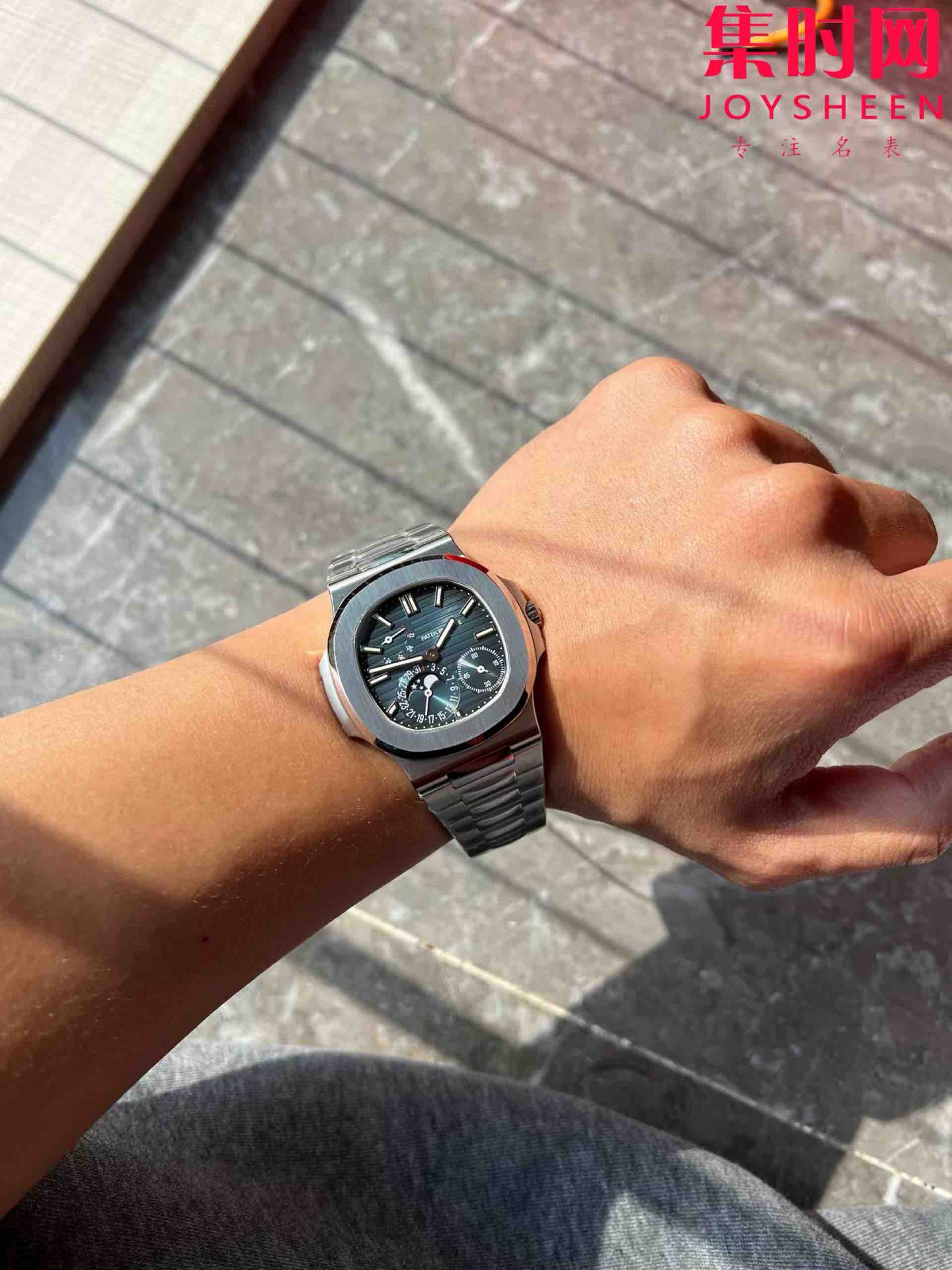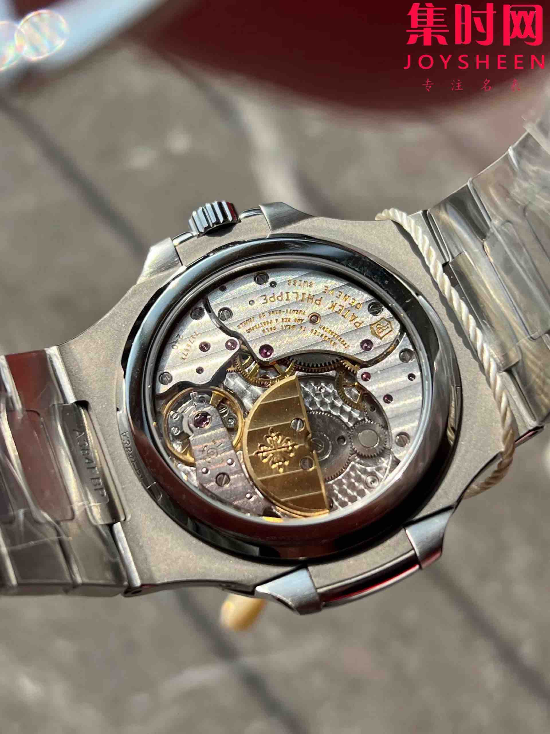 PPF潜心三年 真“芯”之作!百达翡丽PP5712GR全新升级V3版,巅峰出道了!这是真正具有里程碑意义的超级一体机芯Cal.240 PS IRM C LU。全机芯零件数265个,平面游丝,21600每小时振荡次数 Gyromax带调节砝码的摆轮,稳定无误差。(不同于市面上现有的假机芯盖甲板,假珍珠陀) 全新修正的不锈钢表带,铰链部分根据真正的百达翡丽鹦鹉螺不锈钢表带拆解开发,和正品一致的贴合效果,逆袭市面上所有副本,铰链开合角度和正品一致,锁毕声音和正品相同。而PPF独家的“蓝魅”面无限接近接近原版,更是傲视群雄!