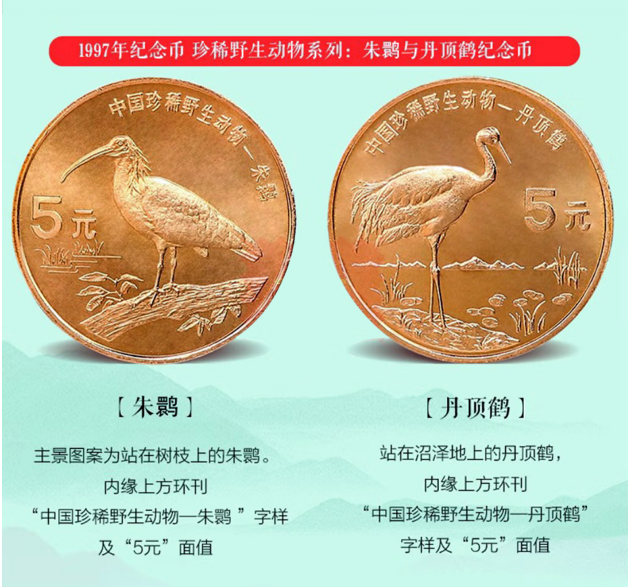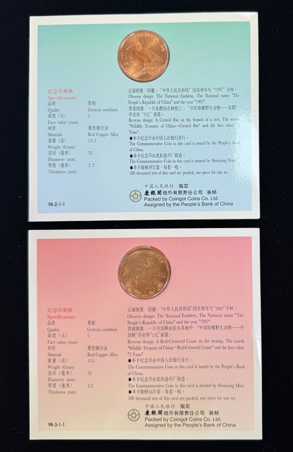 【康银阁装帧】1997年野生珍稀动物朱鹮、丹顶鹤纪念卡币