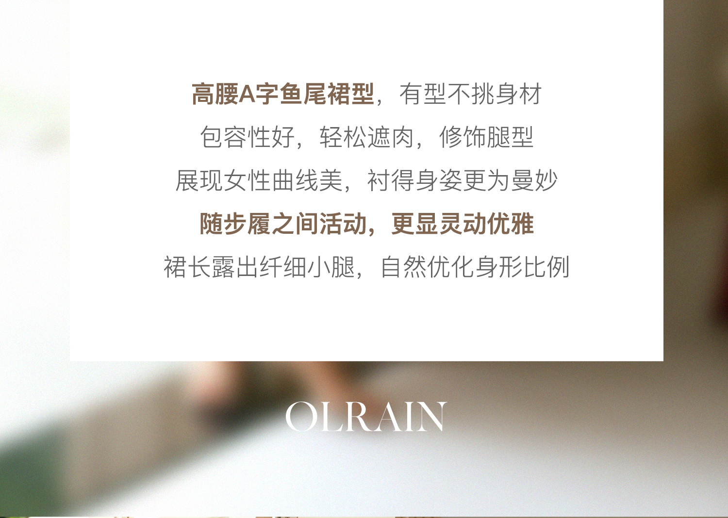 - “精致”是欧芮儿olrain品牌文化的核心,欧芮儿认为,精致的女人,不但要外在动人,更要内在迷人,内外兼修,有魅力、有气质、有内涵,自信而不自傲,优雅而不矫揉,自有万种风情而不轻浮,更不故作矜持。