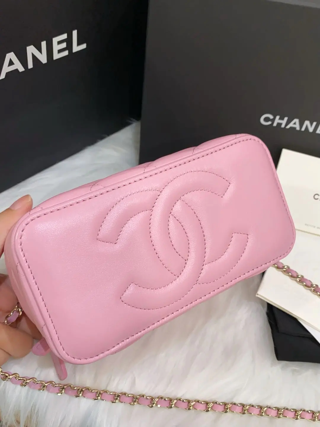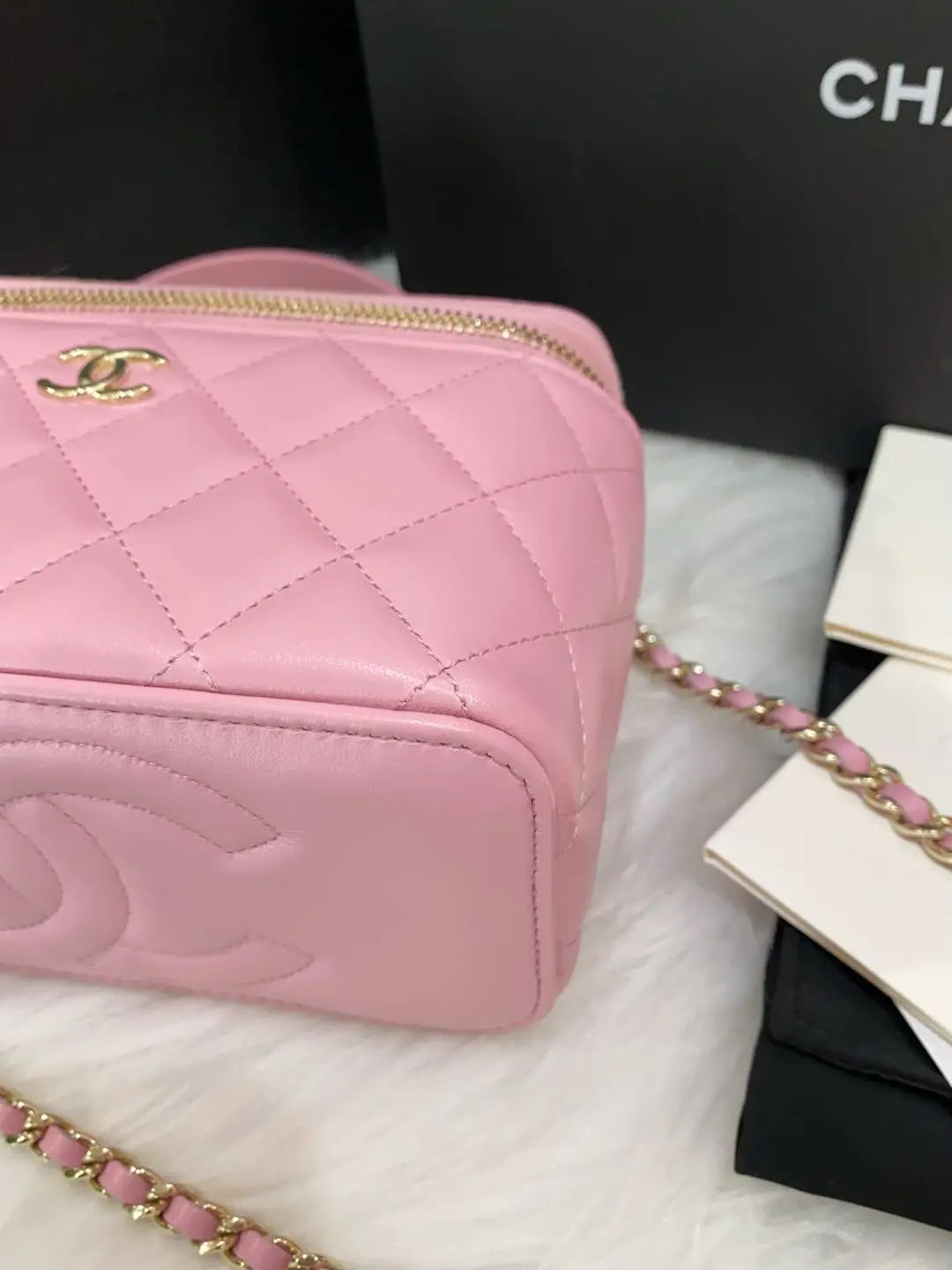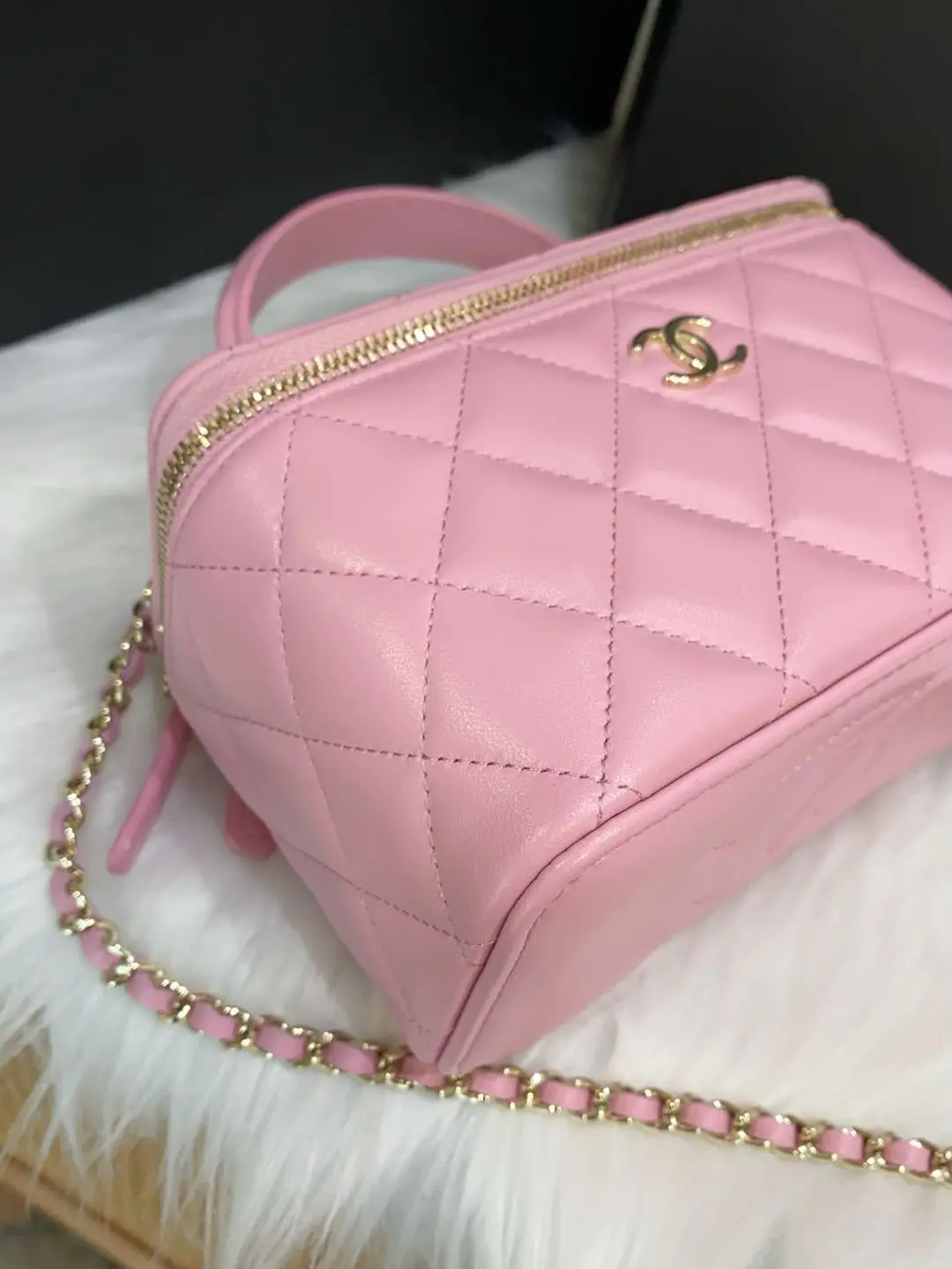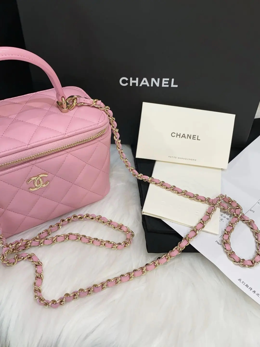 【商品详情】正品二手 Chanel 25k 蜜桃粉 羊皮 手柄 长盒子 化妆包👾 99新 16x10 芯片款 配件:票 说明书 盒子。25年季节限定 人见人爱