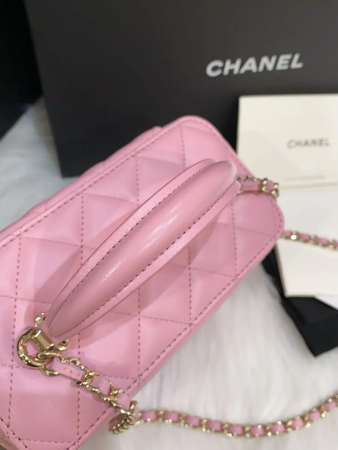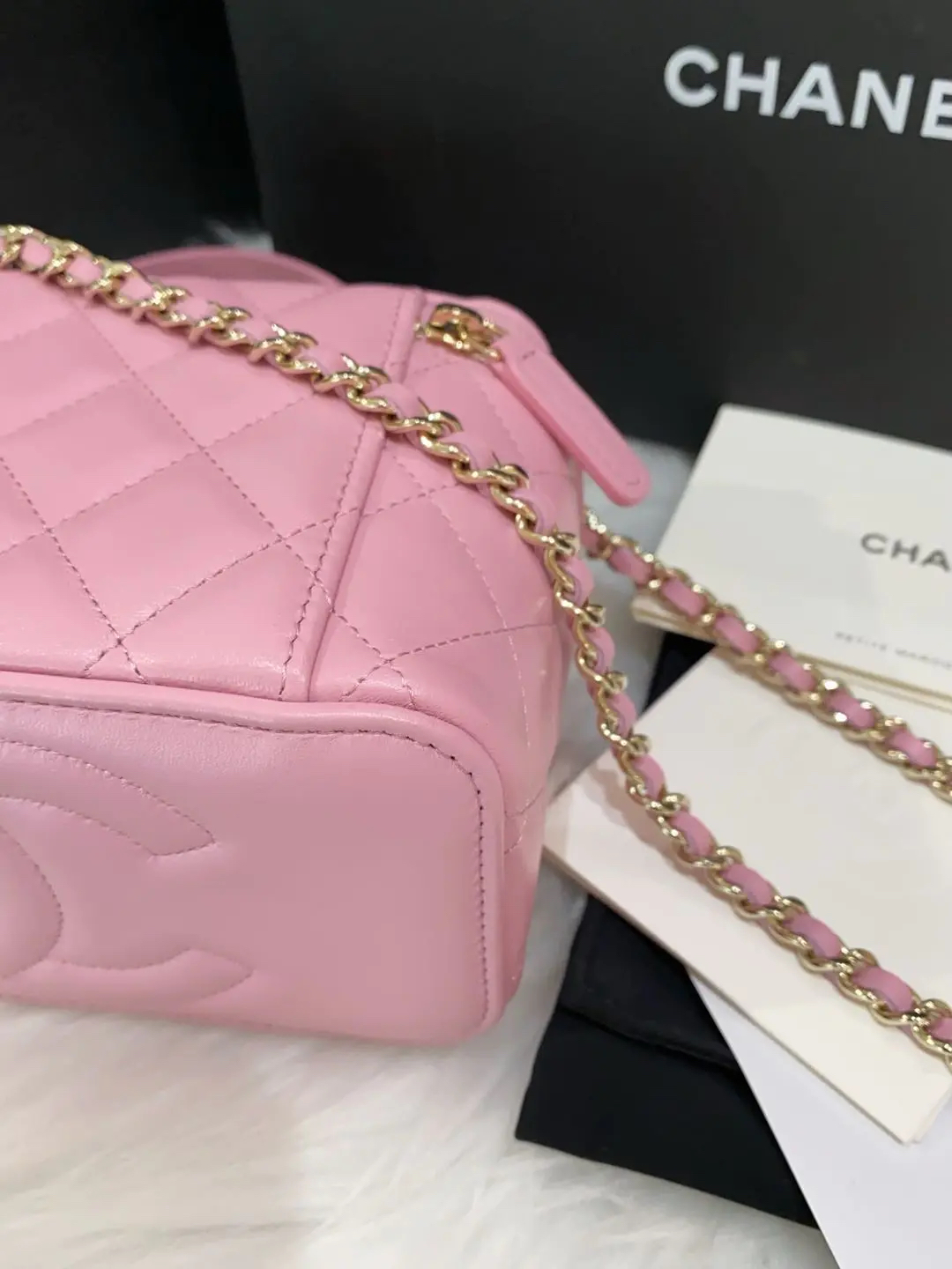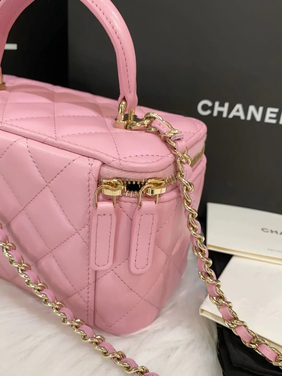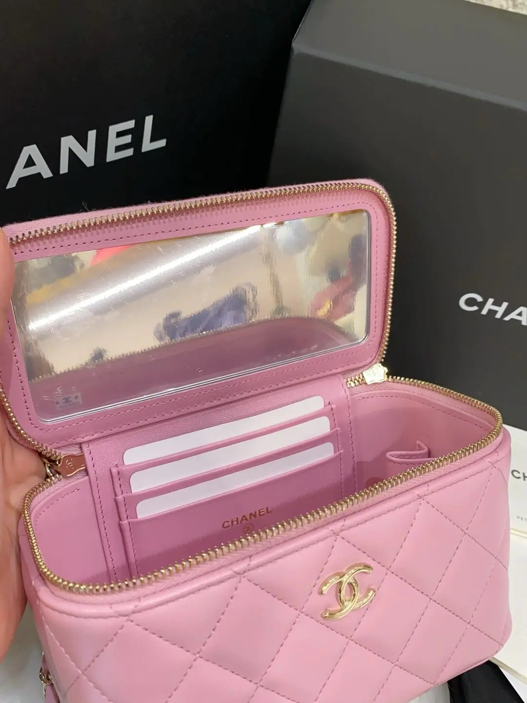 【商品详情】正品二手 Chanel 25k 蜜桃粉 羊皮 手柄 长盒子 化妆包👾 99新 16x10 芯片款 配件:票 说明书 盒子。25年季节限定 人见人爱