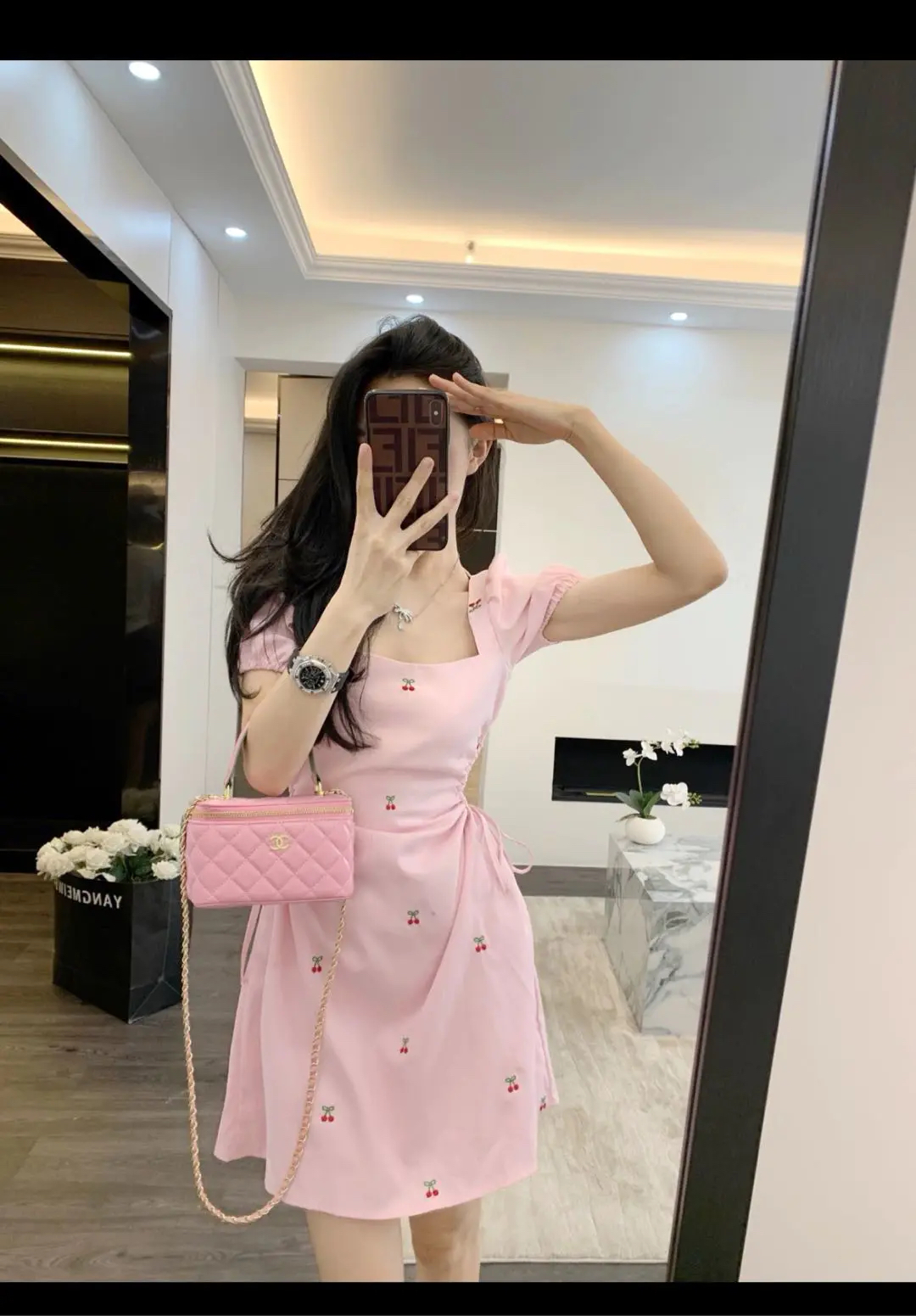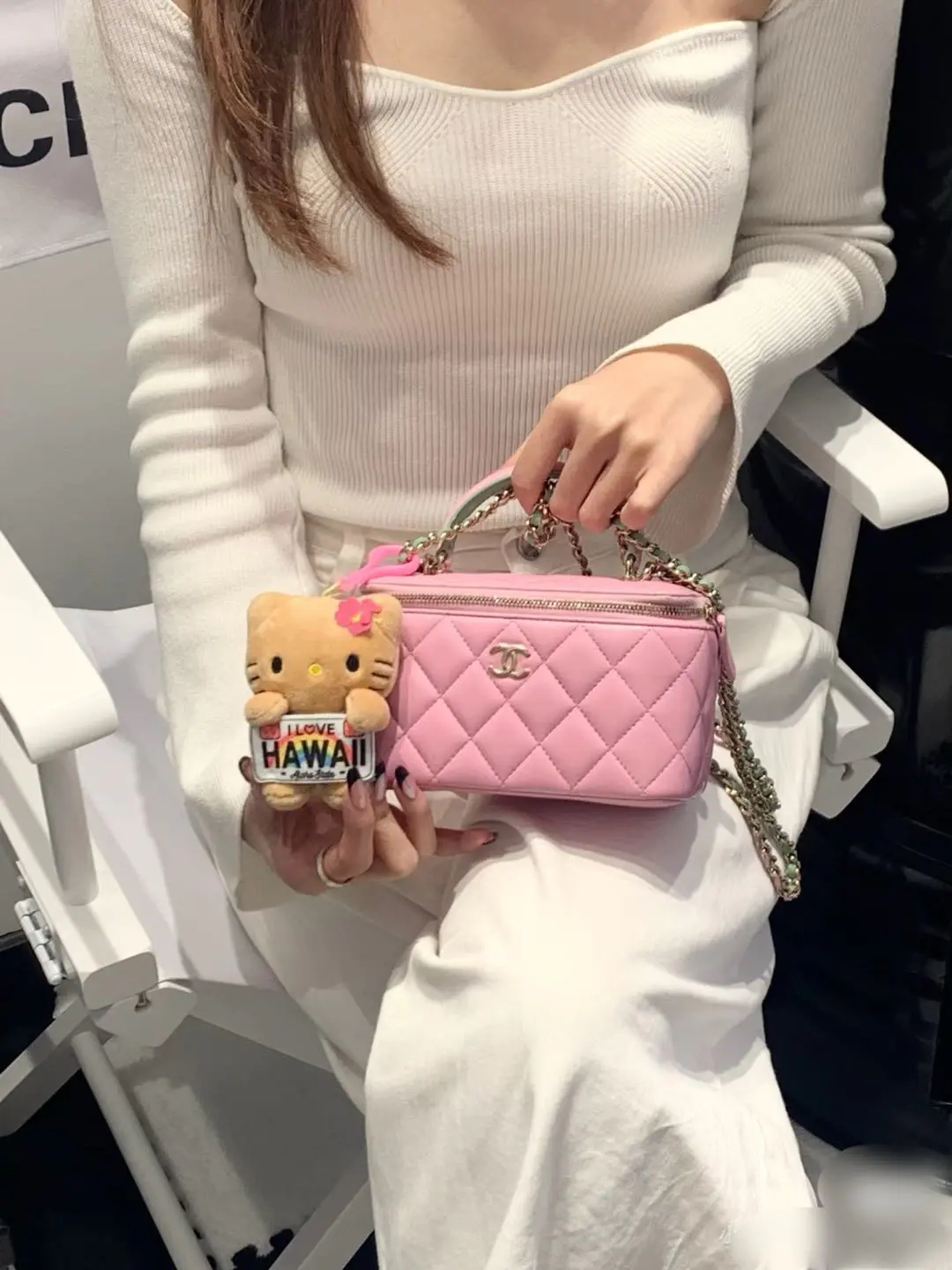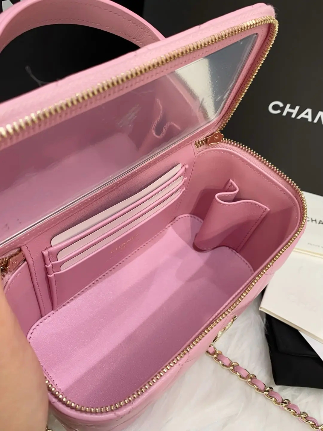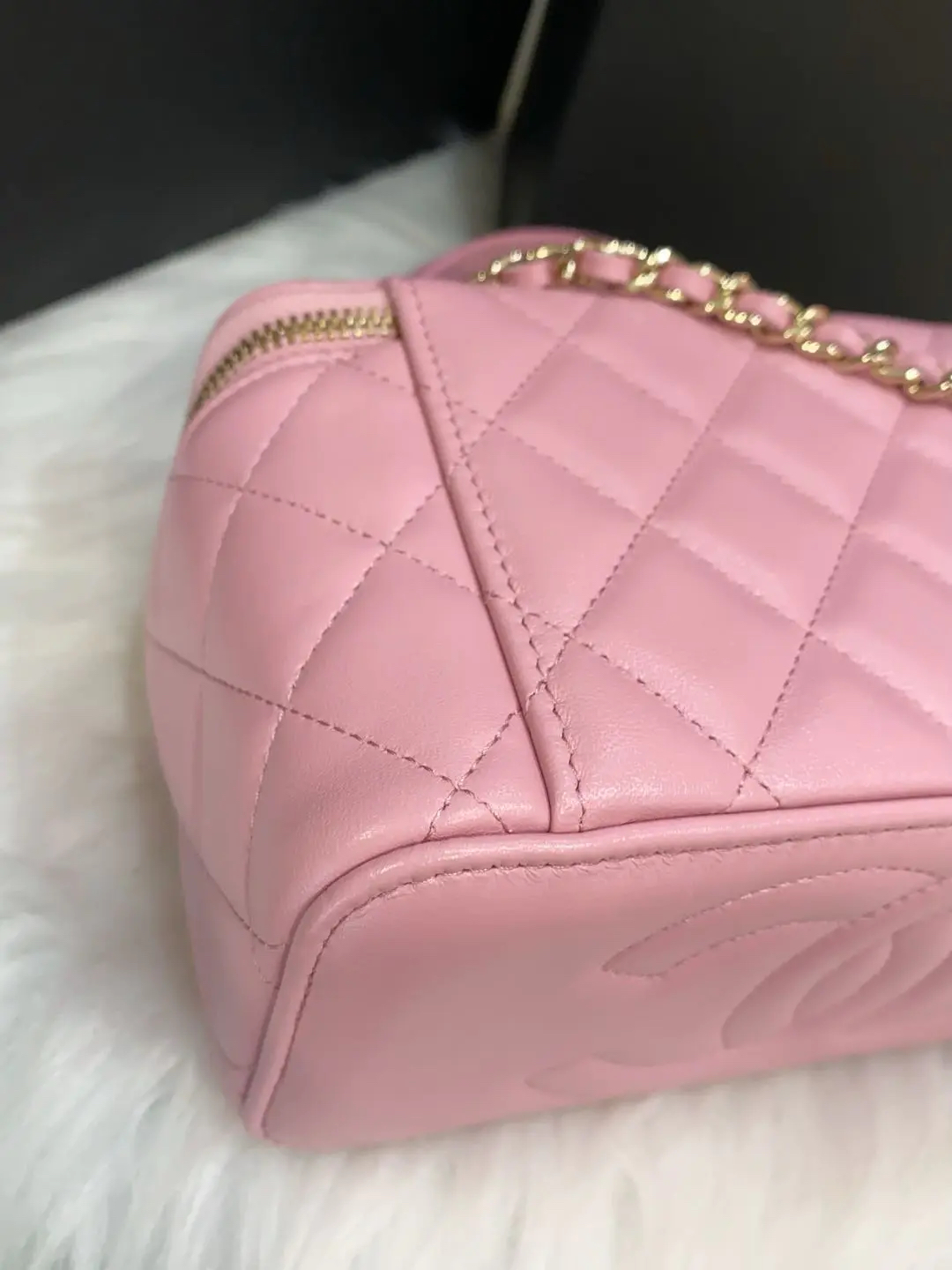 【商品详情】正品二手 Chanel 25k 蜜桃粉 羊皮 手柄 长盒子 化妆包👾 99新 16x10 芯片款 配件:票 说明书 盒子。25年季节限定 人见人爱