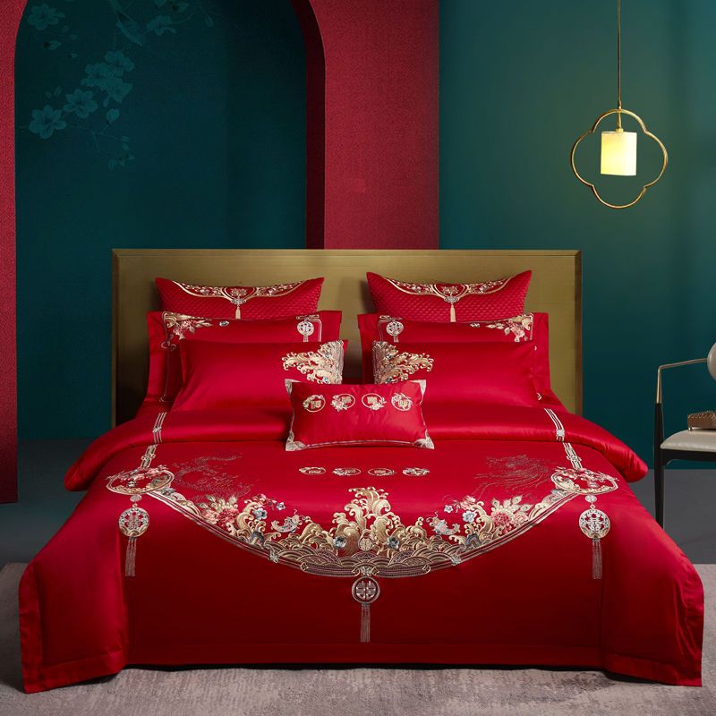 利路米大红百支棉婚庆六件套福䘵喜财精致刺绣床品